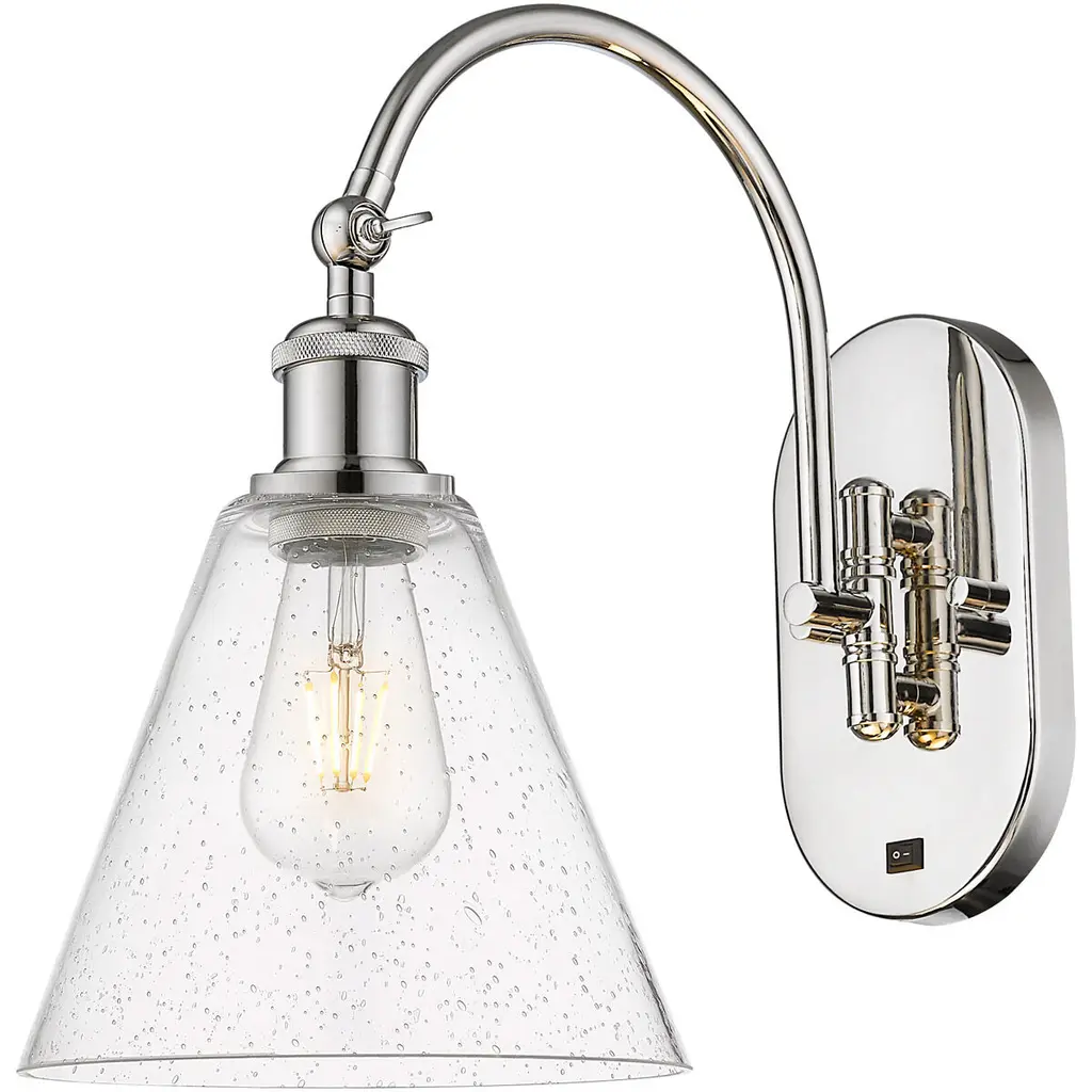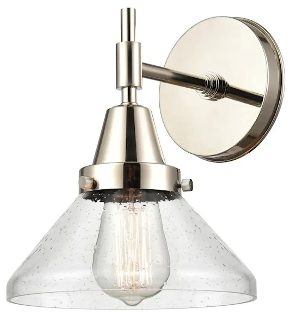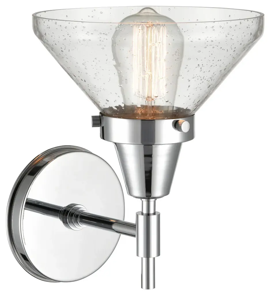 INNOVATIONS LIGHTING 447-1W-PC-G4474 Caden Sconce. Innovations Lighting Caden 1 Light 9 inch Polished Chrome Sconce. Material: Steel, Glass. Metal Finish(Body): Polished Chrome. Metal Finish (Canopy/Backplate): Polished Chrome. Dimension(in): 9.25(H) x 8(W) x 9.25(Ext). Maximum Wattage Per Socket: 100. Bulb: (1)60W Medium Base(Not Included). Dimmable: Yes. Lumens: 220. Color Rendering Index(CRI): 99.9. Voltage: 120. Glass Shade Description: Seedy Caden Glass. Glass Type: Seedy. Glass or Metal Shade Shape: Cone. Glass or Metal Shade Color: Seedy. Shade Material: Glass. Shade Size (Diameter x Height)(in): 8 X 4. Shade Fitter Measurement(in): 3.25 inch Fitter. Backplate Dimensions(in): 5.25 X 0.875. Duo Mount: No. Certification: UL & ETL, Damp Location. Sharp lines and dramatic styling.