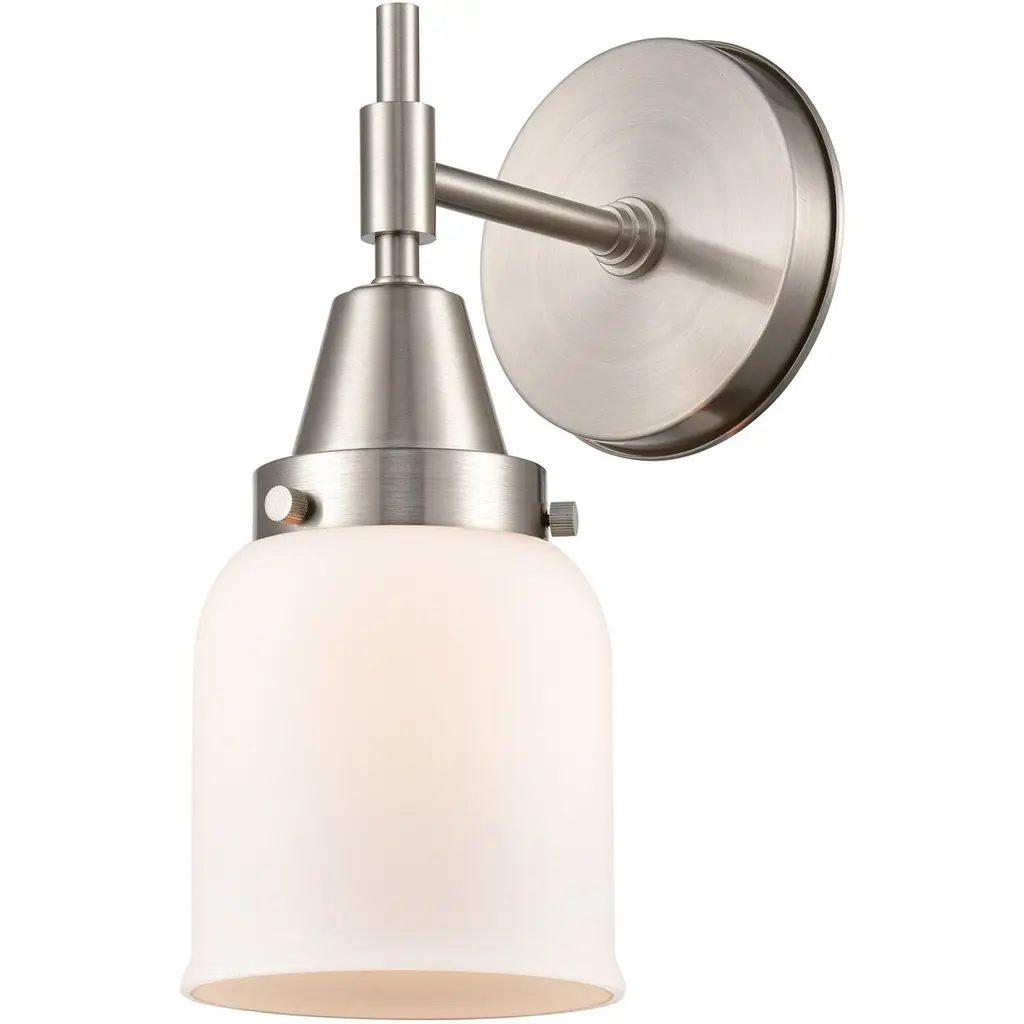 INNOVATIONS LIGHTING 447-1W-SN-G181-LED Caden 1 Light 9 inch Sconce. Innovations Lighting Caden 1 Light 9 inch Satin Nickel Sconce. Metal Finish (Body): Satin Nickel. Metal Finish (Canopy/Backplate): Satin Nickel. Glass or Metal Shade Color: Matte White. Material: Steel, Glass. Shade Material: Glass. Dimension(in): 12.5(H) x 6(W) x 8.25(Ext). Backplate Dimension(in): 0.875(D) x 5(Dia). Shade Size(in): 7.25(H) x 6(Dia). Bulb: (1) 3.5 Watt LED Vintage Medium Base Bulb Included. Voltage: 120. Dimmable: Yes. Color Temperature(Kelvin): 2700. CRI: 82. Lumens: 350. Glass Type: Frosted. Glass or Metal Shade Shape: Cone. Shade Fitter Measurement: 3.25 inch Fitter. ADA Compliant: No. Style: Retro, Industrial. Ul Certification Type: Damp Location. Warranty: 2 Year Finish, Lifetime Electrical.