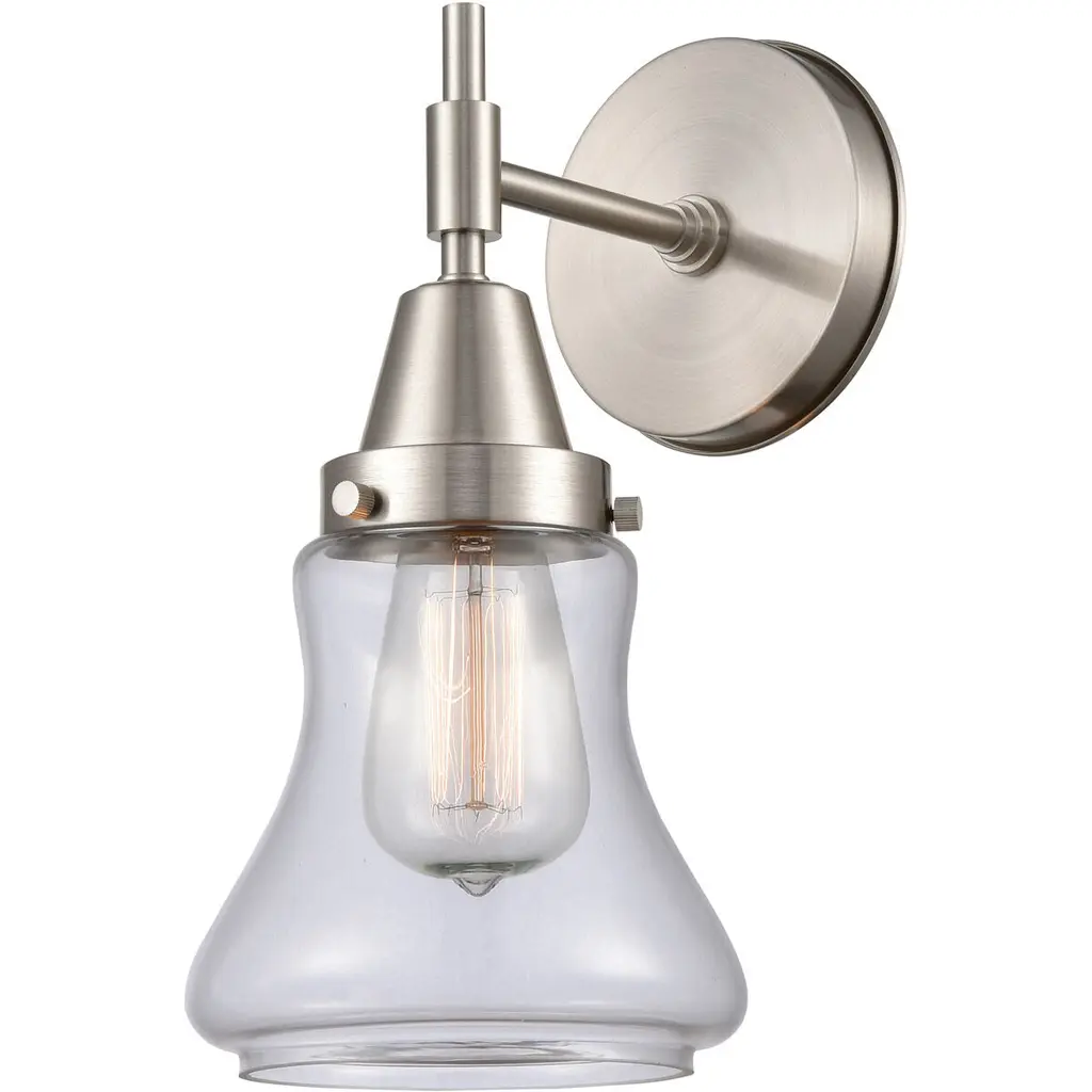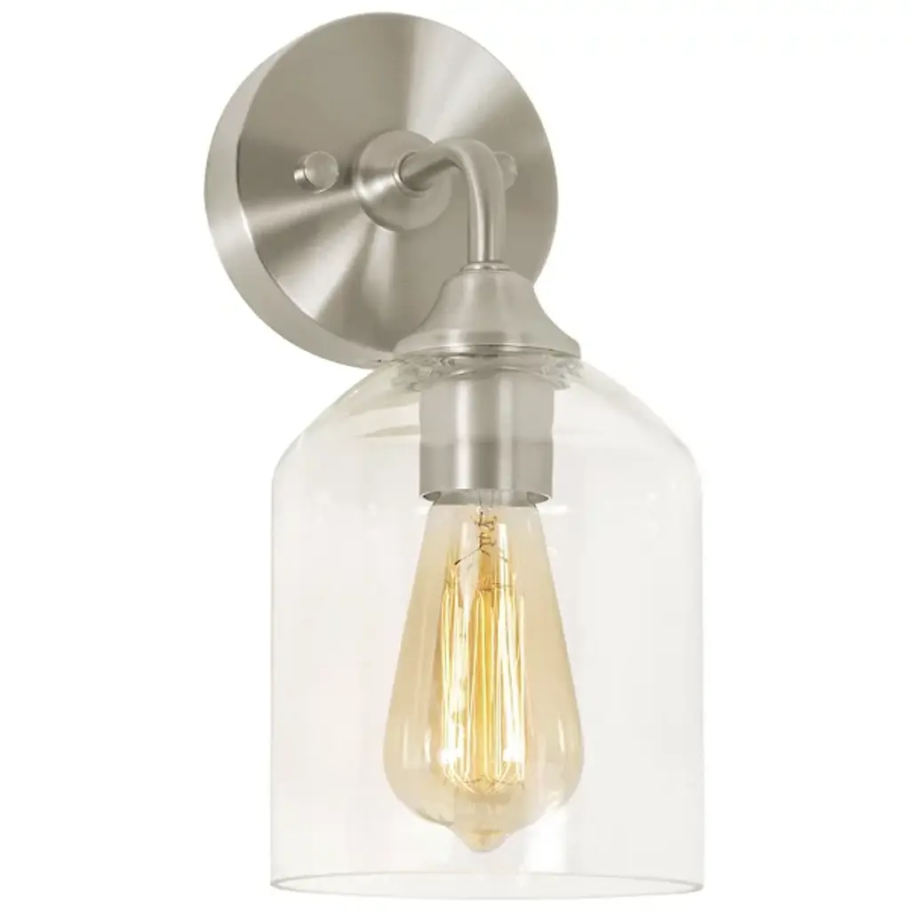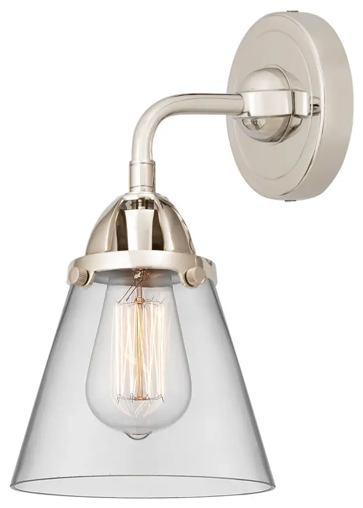 INNOVATIONS LIGHTING 447-1W-SN-G192-LED Caden 1 Light 9 inch Sconce. Innovations Lighting Caden 1 Light 9 inch Satin Nickel Sconce. Metal Finish (Body): Satin Nickel. Metal Finish (Canopy/Backplate): Satin Nickel. Glass or Metal Shade Color: Clear. Material: Steel, Glass. Shade Material: Glass. Dimension(in): 11.5(H) x 6(W) x 8.25(Ext). Backplate Dimension(in): 0.875(D) x 5(Dia). Shade Size(in): 6.25(H) x 6(Dia). Bulb: (1) 3.5 Watt LED Vintage Medium Base Bulb Included. Voltage: 120. Dimmable: Yes. Color Temperature(Kelvin): 2700. CRI: 82. Lumens: 350. Glass Type: Transparent . Glass or Metal Shade Shape: Cone. Shade Fitter Measurement: 3.25 inch Fitter. ADA Compliant: No. Style: Retro, Industrial. Ul Certification Type: Damp Location. Warranty: 2 Year Finish, Lifetime Electrical.