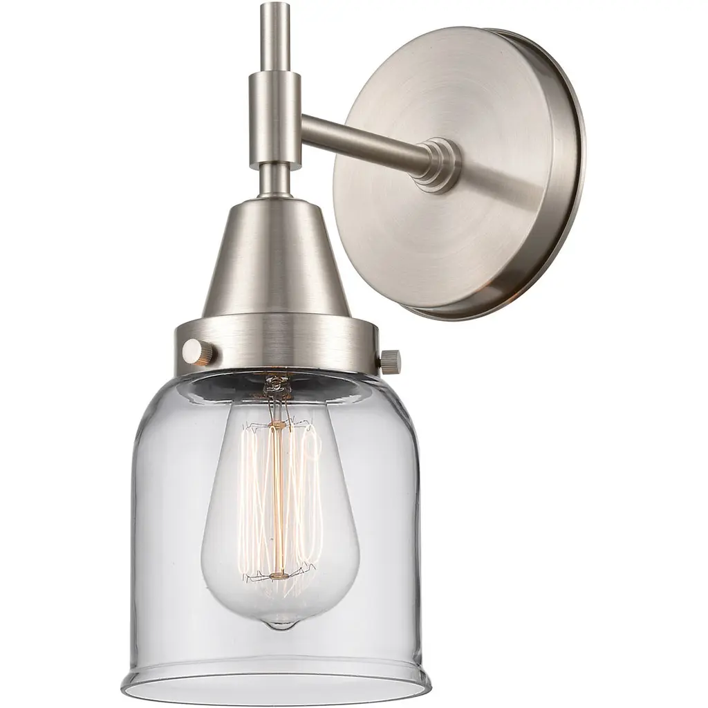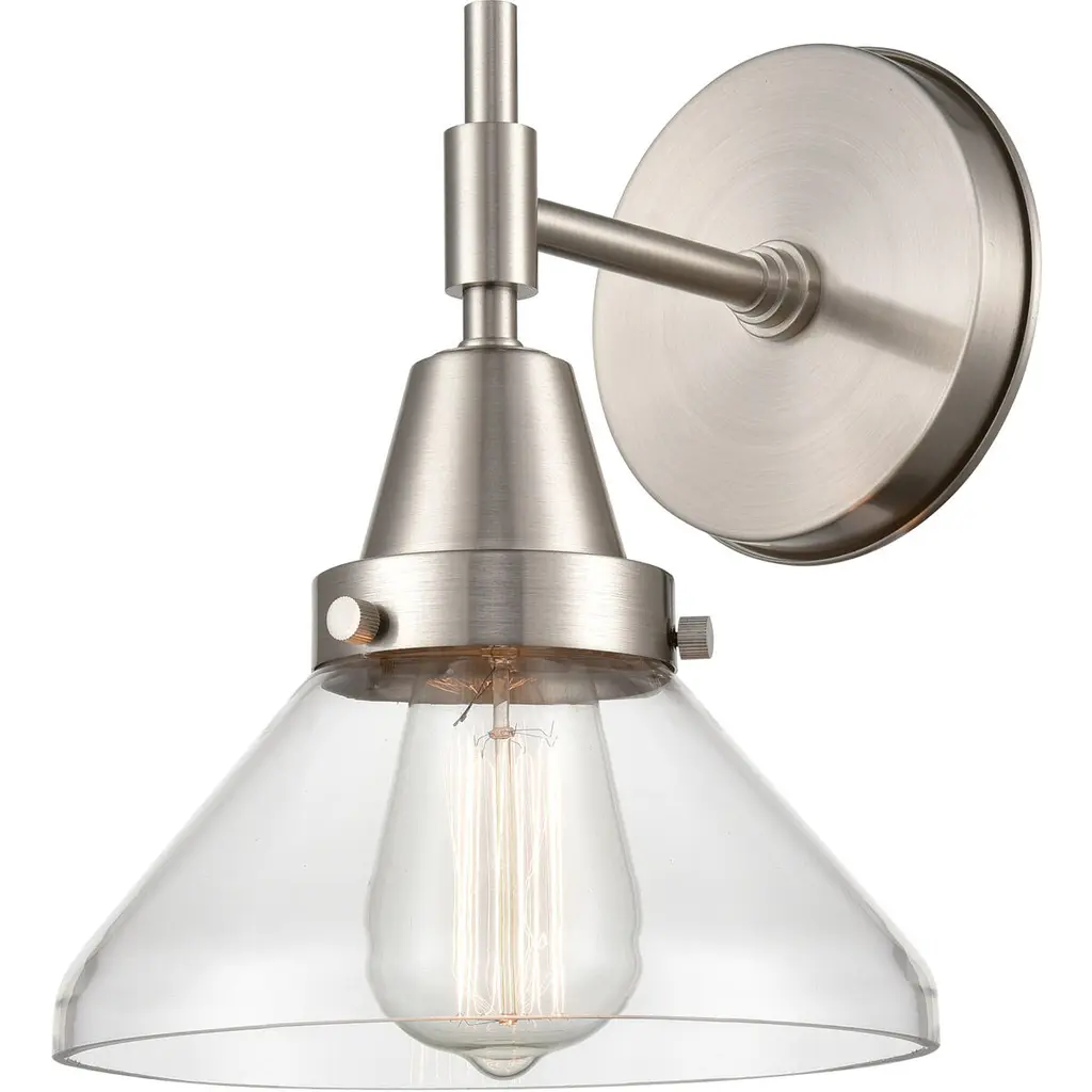 INNOVATIONS LIGHTING 447-1W-SN-G62 Caden 1 Light 9 inch Sconce. Innovations Lighting Caden 1 Light 9 inch Satin Nickel Sconce. Metal Finish (Body): Satin Nickel. Metal Finish (Canopy/Backplate): Satin Nickel. Glass or Metal Shade Color: Clear. Material: Steel, Glass. Shade Material: Glass. Dimension(in): 11(H) x 6.25(W) x 8.375(Ext). Backplate Dimension(in): 0.875(D) x 5(Dia). Shade Size(in): 5.75(H) x 6.25(Dia). Bulb: (1)60W Incandescent Medium Base(Not Included). Voltage: 120. Dimmable: Yes. Color Temperature(Kelvin): 2200. CRI: 99.9. Lumens: 220. Glass Shade: Clear Large Cone. Glass Type: Transparent . Glass or Metal Shade Shape: Cone. Shade Fitter Measurement: 3.25 inch Fitter. ADA Compliant: No. Style: Retro, Industrial. Ul Certification Type: Damp Location. Warranty: 2 Year Finish, Lifetime Electrical.
