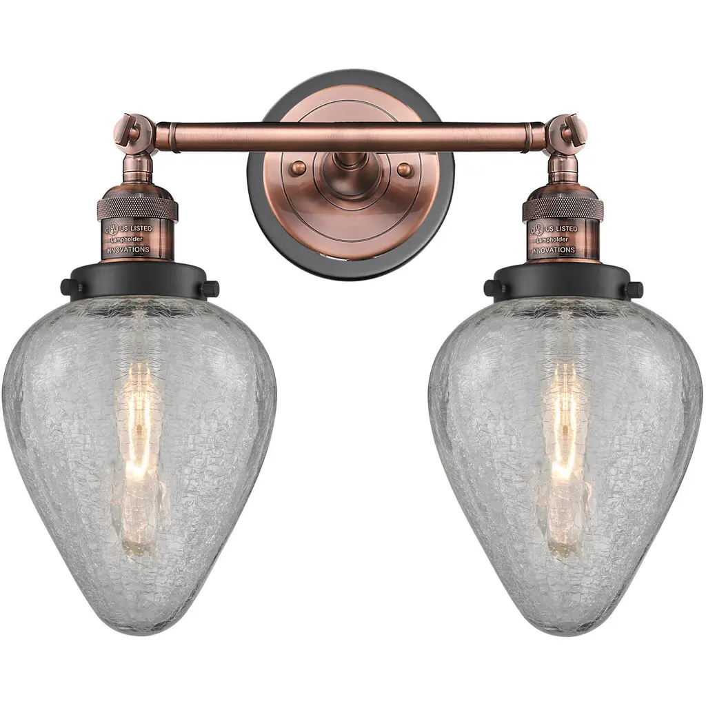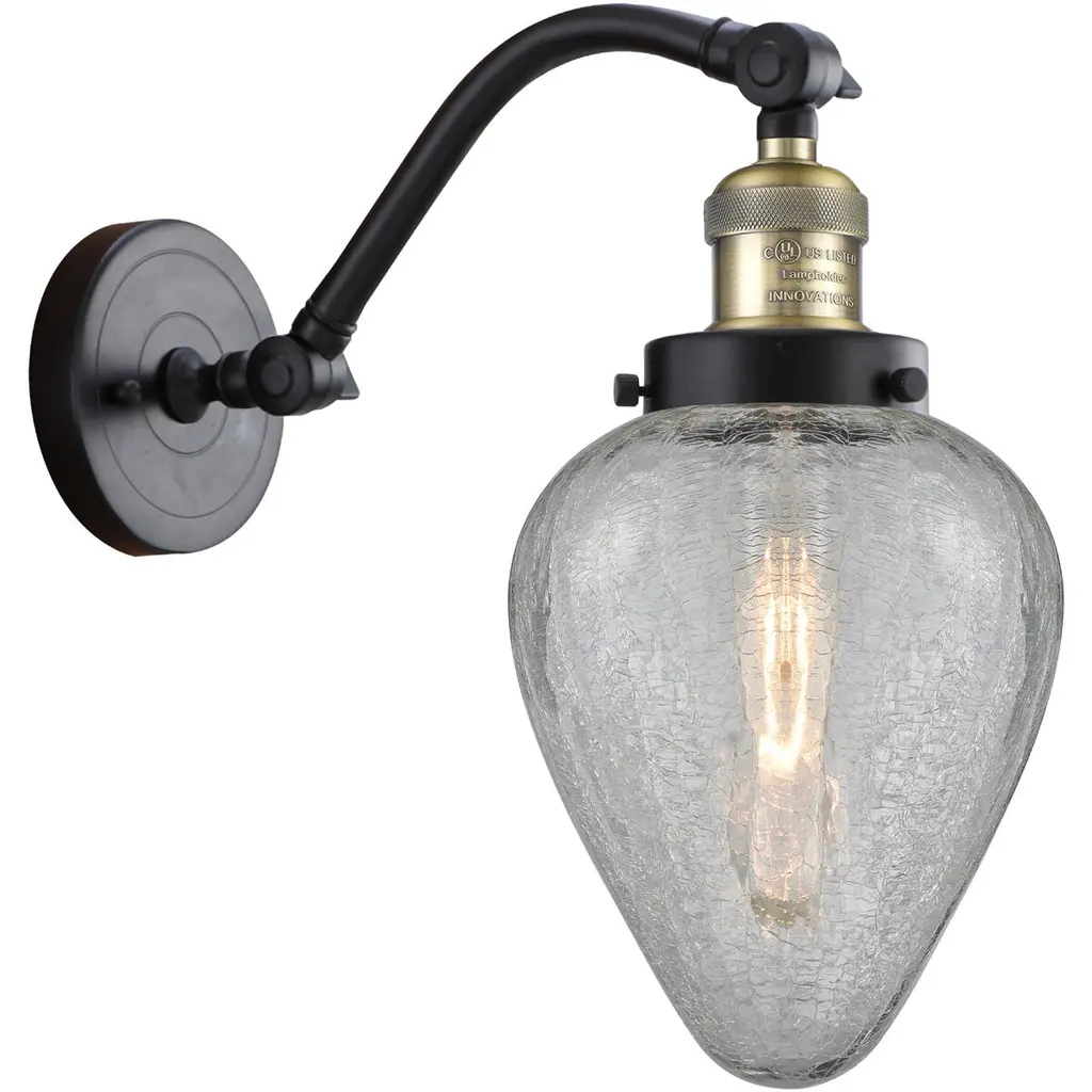 INNOVATIONS LIGHTING 515-1W-BAB-G165-LED Geneseo 1 Light Sconce. The Geneseo 1 Light Sconce is part of the Franklin Restoration Collection. Solid Brass 180 Degree Adjustable Swivels with internal teeth that lock in at 5 degree intervals . Family Name: Geneseo. Collection Name: Franklin Restoration. Metal Finish(Body): Black Antique Brass. Metal Finish (Canopy/Backplate): Black. Material: Steel, Cast Brass, Glass. Dimension(in): 11.5(H) x 6.5(W) x 10(Ext). Glass Shade Description: Clear Crackle Geneseo. Glass Type: Crackled. Glass or Metal Shade Shape: Teardrop. Glass or Metal Shade Color: Clear Crackle. Shade Material: Glass. Shade Size(Diameter x Height): 6.5 X 8.75. Shade Dimension(in): 6.5(Dia) x 8.75(H). Canopy Dimensions(in): 4.5. Backplate Dimensions(in): 4.5 x 0.75. Bulb: (1)3.5W Medium Base LED(Included), Dimmable. Color Temperature: 2700. Lumens: 350. Color Rendering Index(CRI): 82. Life Expectancy(Hours): 15000. Voltage : 120. Warranty: 2 Year Finish, Lifetime Electrical. Solid Brass 180 Degree Adjustable Swivels with internal teeth that lock in at 5 degree intervals . Fixture can be hung with bulbs facing up or down. 4.5 inch 2mm Heavy Cast Backplate. Double Swivel Series. Distance from outlet opening to top of fixture 8.75. Rated for 100 Watt Maximum. UL/CUL Damp Rated. In order to maintain the finish we recommend simply using water and a cheesecloth towel. Compatible with Incandescent, LED, Fluoresent and Halogen bulbs.