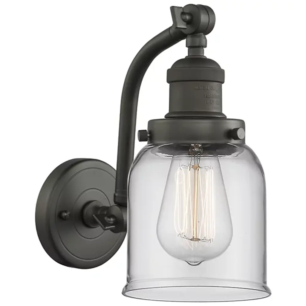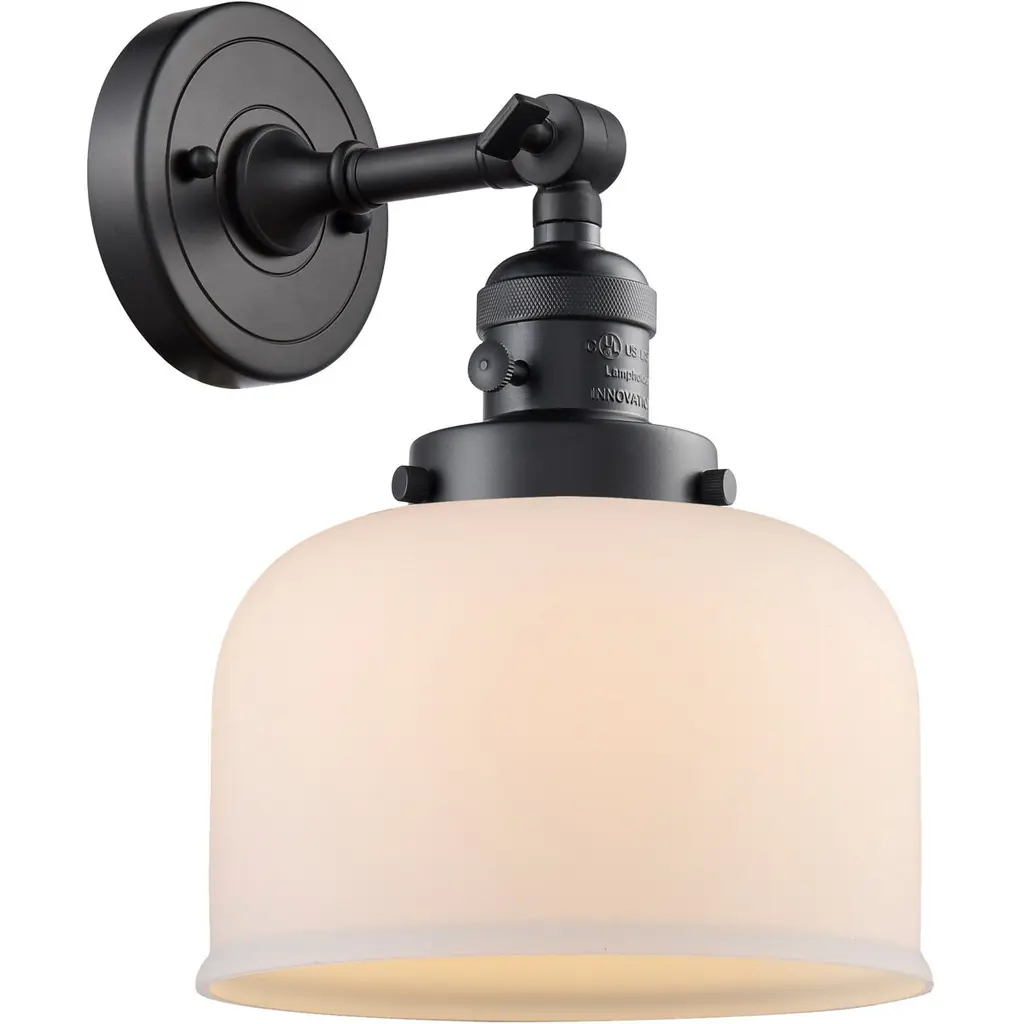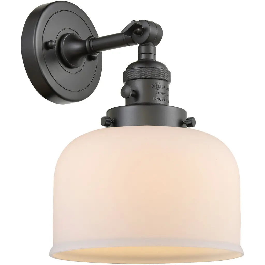 INNOVATIONS LIGHTING 515-1W-OB-G71-LED Large Bell 1 Light Sconce part of the Franklin Restoration Collection. The Large Bell 1 Light Sconce is part of the Franklin Restoration Collection.Solid Brass 180 Degree Adjustable Swivels with internal teeth that lock in at 5 degree intervals. Collection: Franklin Restoration. Material: Steel, Cast Brass, Glass. Metal Finish(Body): Oil Rubbed Bronze. Metal Finish(Canopy/Backplate): Oil Rubbed Bronze. Dimension(in): 8(W) x 11.5(H) x 10(Ext). Bulb: (1)3.5 Watt LED Vintage Medium Base Bulb Included,Dimmable. Color Temperature: 2700. Color Rendering Index(CRI): 82. Lumens): 350. Voltage: 120. Glass: Matte White Cased Large Bell/Frosted. Shade Shape: Bell. Shade Material: Glass. Shade Size(in): 8 X 5.75. Shade Fitter Measurement: 3.25 inch Fitter. Canopy Dimension(in): 4.5. Backplate Dimension(in): 4.5x0.75. Solid Brass 180 Degree Adjustable Swivels with internal teeth that lock in at 5 degree intervals. Fixture can be hung with bulbs facing up or down. UL/CUL Damp Rated. Warranty: 2 Year Finish, Lifetime Electrical.