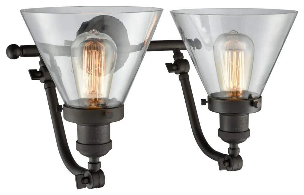 INNOVATIONS LIGHTING 515-2W-OB-G42 Large Cone 2 Light Bath Vanity Light part of the Franklin Restoration Collection. The Large Cone 2 Light Bath Vanity Light is part of the Franklin Restoration Collection.Solid Brass 180 Degree Adjustable Swivels with internal teeth that lock in at 5 degree intervals. Collection: Franklin Restoration. Material: Steel, Cast Brass, Glass. Metal Finish(Body): Oil Rubbed Bronze. Metal Finish(Canopy/Backplate): Oil Rubbed Bronze. Dimension(in): 18(W) x 12(H) x 10(Ext). Bulb: (2)100 Medium Base Vintage Bulb recommended(Not Included). Voltage: 120. Glass: Clear Large Cone/Transparent. Shade Shape: Cone. Shade Material: Glass. Shade Size(in): 7.75 X 6. Shade Fitter Measurement: 3.25 inch Fitter. Canopy Dimension(in): 4.5. Backplate Dimension(in): 4.5x0.75. Solid Brass 180 Degree Adjustable Swivels with internal teeth that lock in at 5 degree intervals. Fixture can be hung with bulbs facing up or down. UL/CUL Damp Rated. Warranty: 2 Year Finish, Lifetime Electrical.