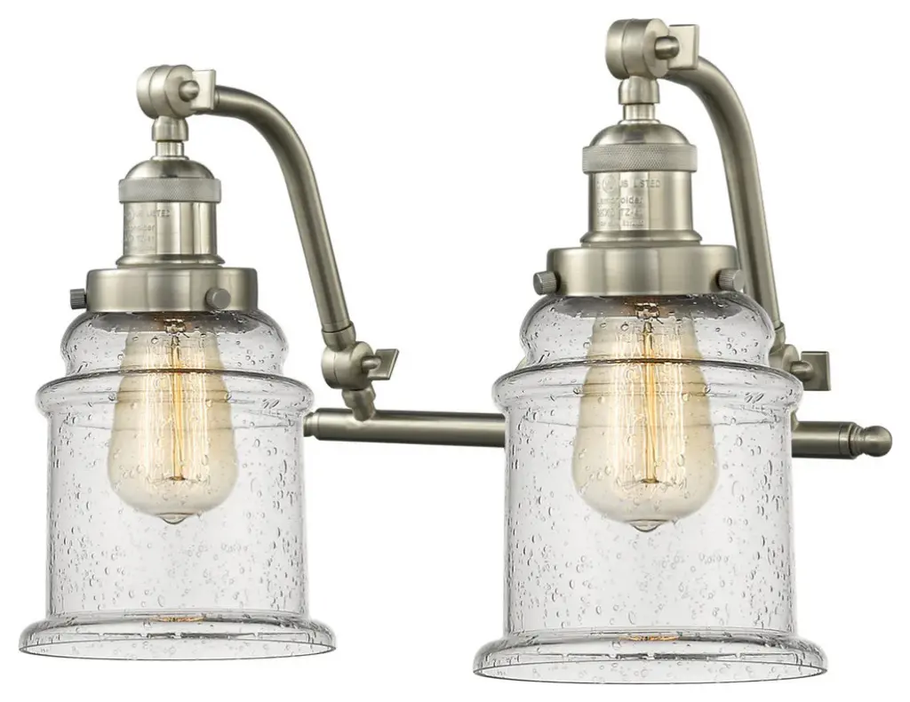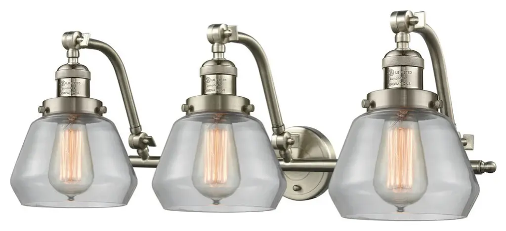 INNOVATIONS LIGHTING 515-2W-SN-G172 Fulton 2 Light Bath Vanity Light part of the Franklin Restoration Collection. The Fulton 2 Light Bath Vanity Light is part of the Franklin Restoration Collection.Solid Brass 180 Degree Adjustable Swivels with internal teeth that lock in at 5 degree intervals. Collection: Franklin Restoration. Material: Steel, Cast Brass, Glass. Metal Finish(Body): Brushed Satin Nickel. Metal Finish(Canopy/Backplate): Brushed Satin Nickel. Dimension(in): 18(W) x 12(H) x 10(Ext). Bulb: (2)100 Medium Base Vintage Bulb recommended(Not Included). Voltage: 120. Glass: Clear Fulton/Transparent. Shade Shape: Cone. Shade Material: Glass. Shade Size(in): 6.75 X 5.25. Shade Fitter Measurement: 3.25 inch Fitter. Canopy Dimension(in): 4.5. Backplate Dimension(in): 4.5x0.75. Solid Brass 180 Degree Adjustable Swivels with internal teeth that lock in at 5 degree intervals. Fixture can be hung with bulbs facing up or down. UL/CUL Damp Rated. Warranty: 2 Year Finish, Lifetime Electrical.