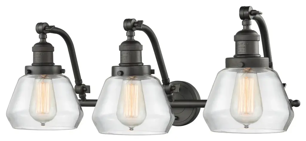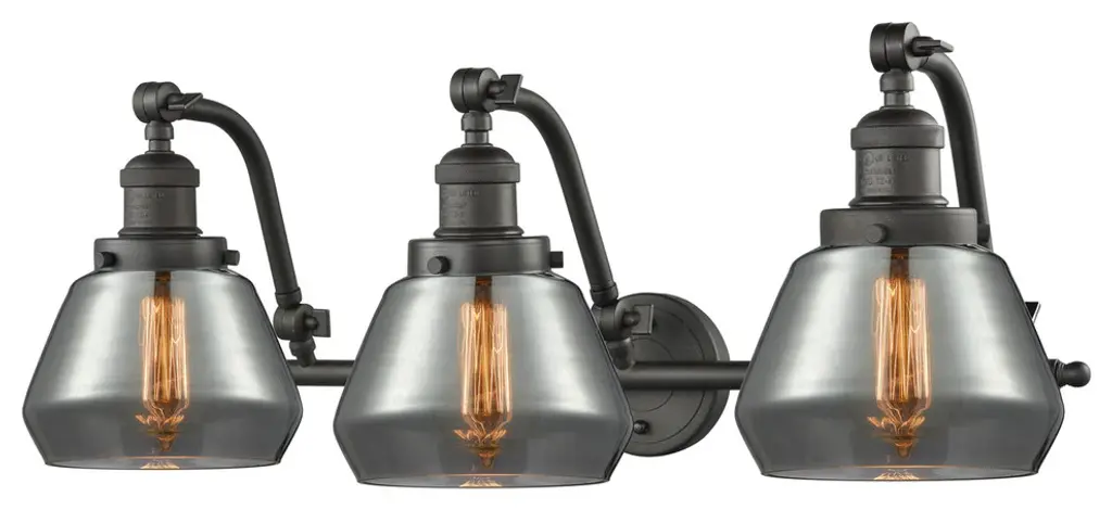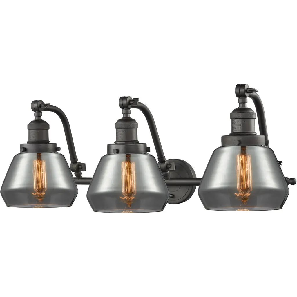 INNOVATIONS LIGHTING 515-3W-OB-G63 Small Cone 3 Light Bath Vanity Light part of the Franklin Restoration Collection. The Small Cone 3 Light Bath Vanity Light is part of the Franklin Restoration Collection.Solid Brass 180 Degree Adjustable Swivels with internal teeth that lock in at 5 degree intervals. Collection: Franklin Restoration. Material: Steel, Cast Brass, Glass. Metal Finish(Body): Oil Rubbed Bronze. Metal Finish(Canopy/Backplate): Oil Rubbed Bronze. Dimension(in): 28(W) x 12(H) x 10(Ext). Bulb: (3)100 Medium Base Vintage Bulb recommended(Not Included). Voltage: 120. Glass: Plated Smoke Small Cone/Colorful. Shade Shape: Cone. Shade Material: Glass. Shade Size(in): 6.25 X 5.75. Shade Fitter Measurement: 3.25 inch Fitter. Canopy Dimension(in): 4.5. Backplate Dimension(in): 4.5x0.75. Solid Brass 180 Degree Adjustable Swivels with internal teeth that lock in at 5 degree intervals. Fixture can be hung with bulbs facing up or down. UL/CUL Damp Rated. Warranty: 2 Year Finish, Lifetime Electrical.