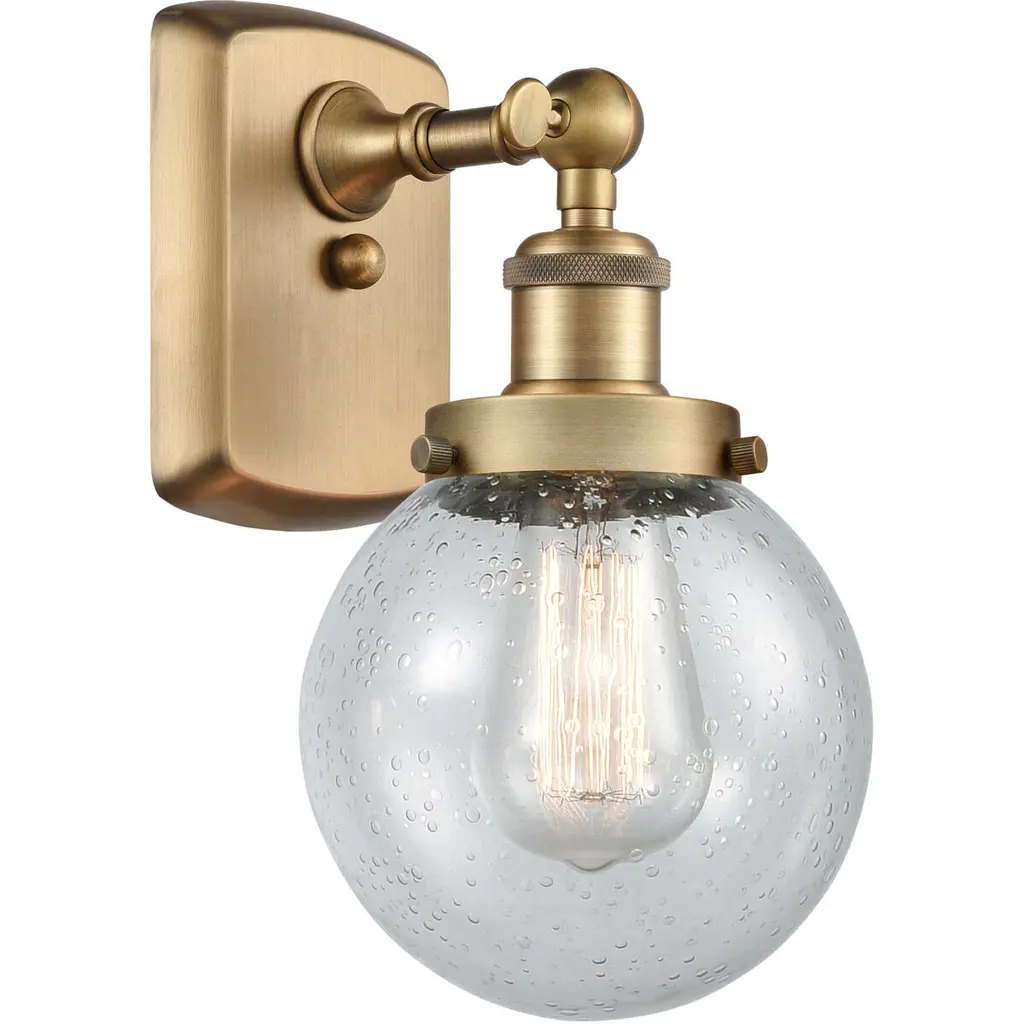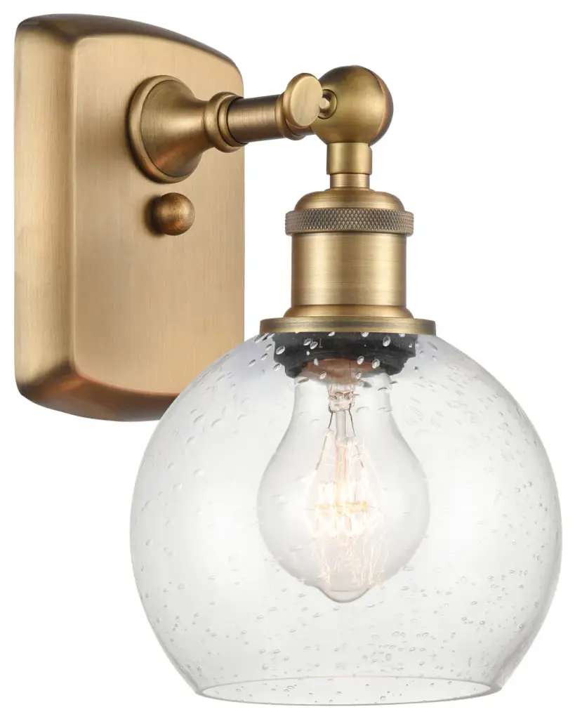 Innovations Lighting 516-1W-AB-G124-8-LED Athens 1 Light 8 inch Sconce. Style: Industrial, Modern Contempo, Restoration-Vintage, Transitional . Collection: Ballston. Material: Steel, Cast Brass, Glass. Metal Finish(Body): Antique Brass. Metal Finish(Canopy/Backplate): Antique Brass. Dimension(in): 13(H) x 8(W) x 9(Ext). Bulb: (1)3.5 Watt LED Vintage Medium Base Bulb Included. Voltage: 120. Dimmable: Yes. Color Temperature: 2700. CRI: 82. Lumens: 350. Maximum Wattage Per Socket: 100. Glass Shade Description: Seedy Athens. Shade Material: Glass. Glass or Metal Shade Color: Seedy. Glass Type: Seeded. Shade Size Dimension(in): 8(Dia) x 7(H). Shade Fitter Measurement: Neckless with a 2.125 inch Hole. Backplate Dimenison(in): 6(H) x 4.5(W) x 0.75(Depth). UL and ETL Certification: Damp Location.