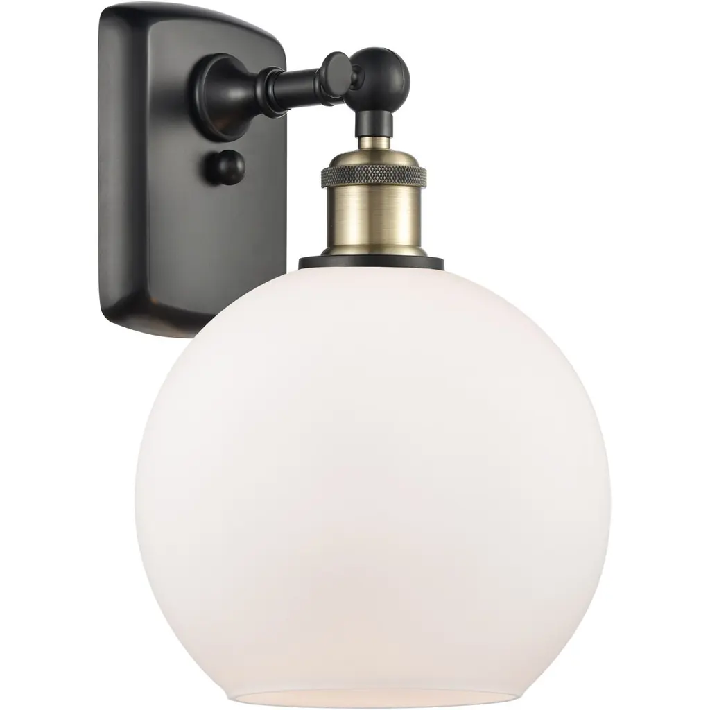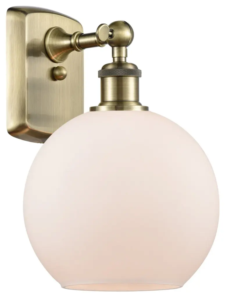 Innovations Lighting 516-1W-AC-G121-8 Athens 1 Light 8 inch Sconce. Style: Industrial, Modern Contempo, Restoration-Vintage, Transitional . Collection: Ballston. Material: Steel, Cast Brass, Glass. Metal Finish(Body): Antique Copper. Metal Finish(Canopy/Backplate): Antique Copper. Dimension(in): 13(H) x 8(W) x 9(Ext). Bulb: (1)60W Medium Base Vintage Bulb recommended(Not Included). Voltage: 120. Dimmable: Yes. Color Temperature: 2200. CRI: 99.9. Lumens: 220. Maximum Wattage Per Socket: 100. Glass Shade Description: Cased Matte White Athens. Shade Material: Glass. Glass or Metal Shade Color: Matte White. Glass Type: Frosted. Shade Size Dimension(in): 8(Dia) x 7(H). Shade Fitter Measurement: Neckless with a 2.125 inch Hole. Backplate Dimenison(in): 6(H) x 4.5(W) x 0.75(Depth). ADA Compliant: No. UL and ETL Certification: Damp Location.