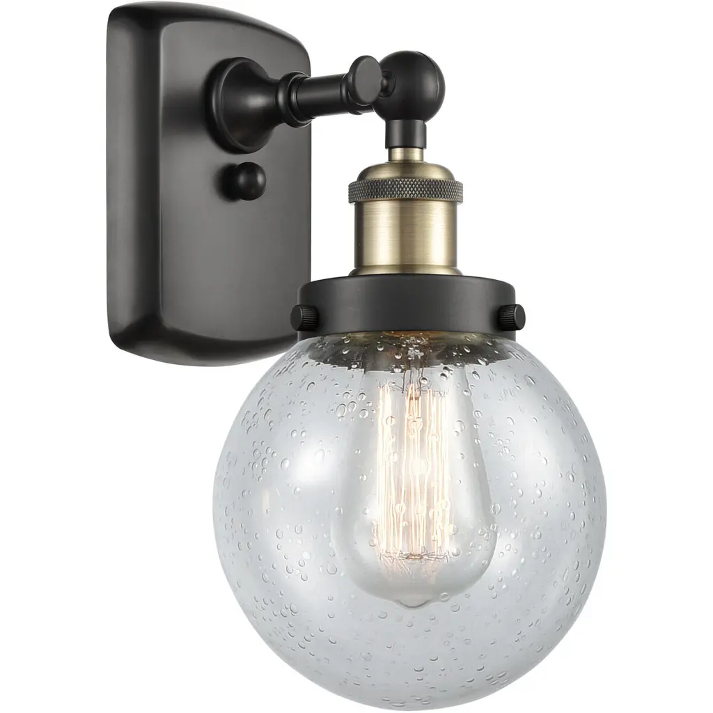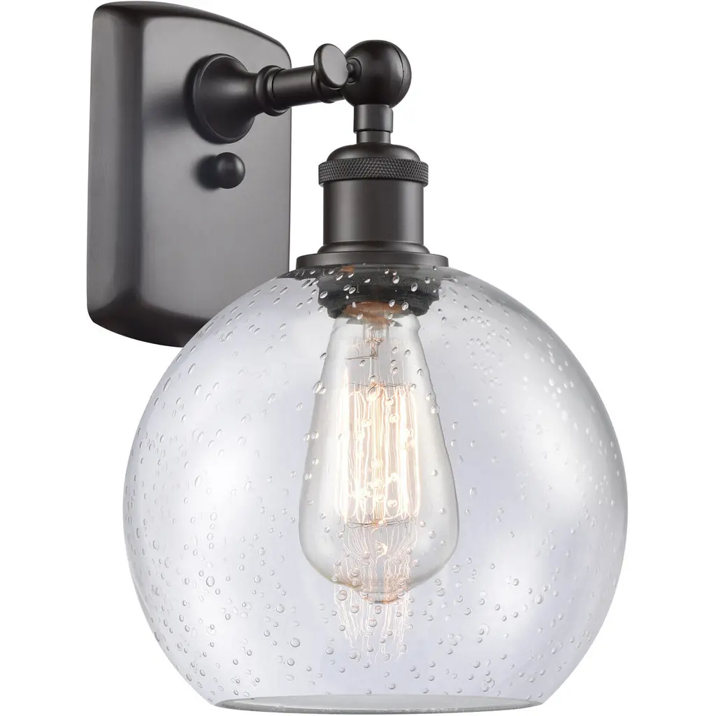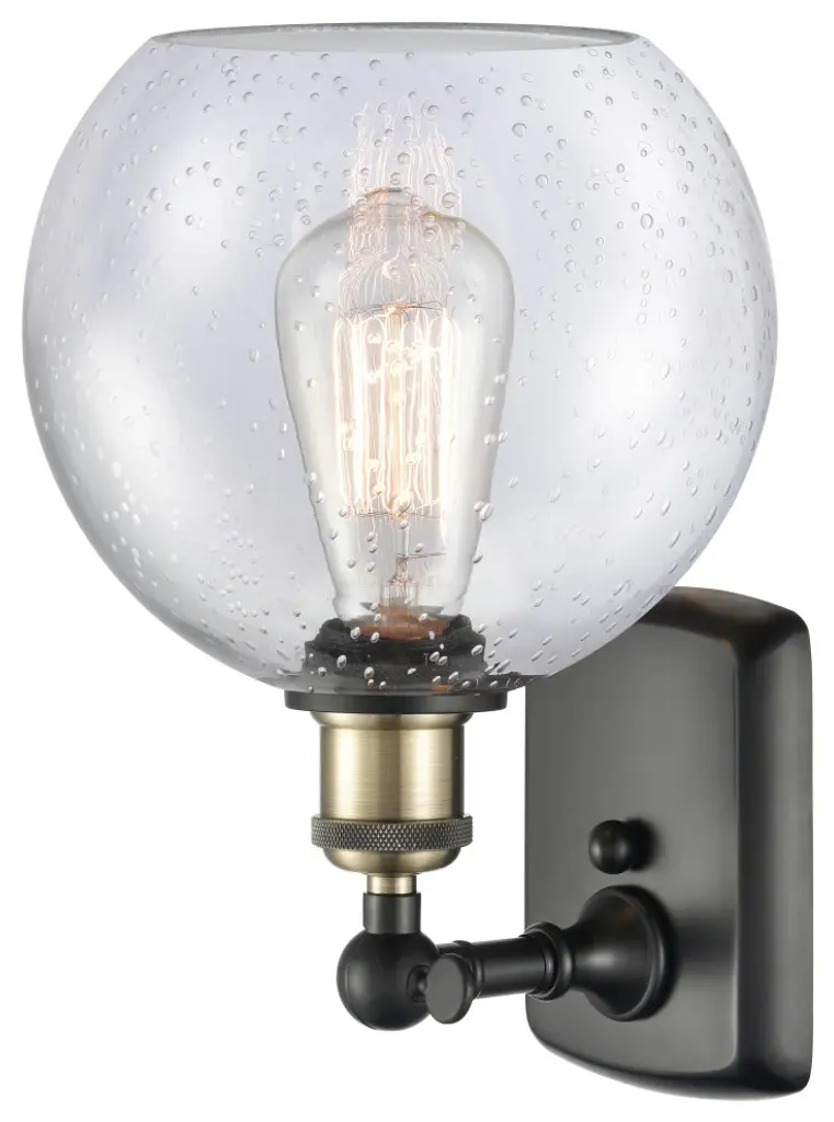 Innovations Lighting 516-1W-BAB-G124-8 Athens 1 Light 8 inch Sconce. Style: Industrial, Modern Contempo, Restoration-Vintage, Transitional . Collection: Ballston. Material: Steel, Cast Brass, Glass. Metal Finish(Body): Black Antique Brass. Metal Finish(Canopy/Backplate): Black Antique Brass. Dimension(in): 13(H) x 8(W) x 9(Ext). Bulb: (1)60W Medium Base Vintage Bulb recommended(Not Included). Voltage: 120. Dimmable: Yes. Color Temperature: 2200. CRI: 99.9. Lumens: 220. Maximum Wattage Per Socket: 100. Glass Shade Description: Seedy Athens. Shade Material: Glass. Glass or Metal Shade Color: Seedy. Glass Type: Seeded. Shade Size Dimension(in): 8(Dia) x 7(H). Shade Fitter Measurement: Neckless with a 2.125 inch Hole. Backplate Dimenison(in): 6(H) x 4.5(W) x 0.75(Depth). ADA Compliant: No. UL and ETL Certification: Damp Location.