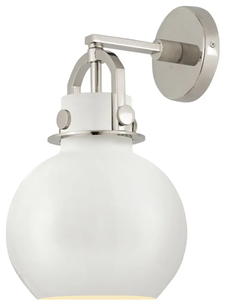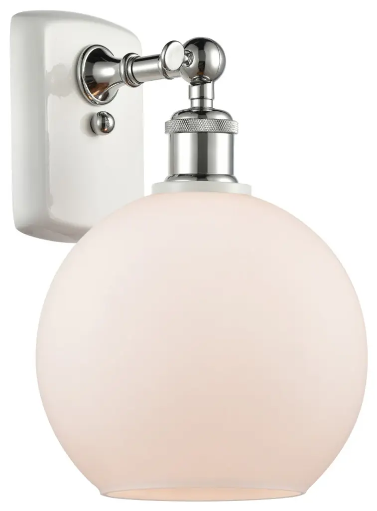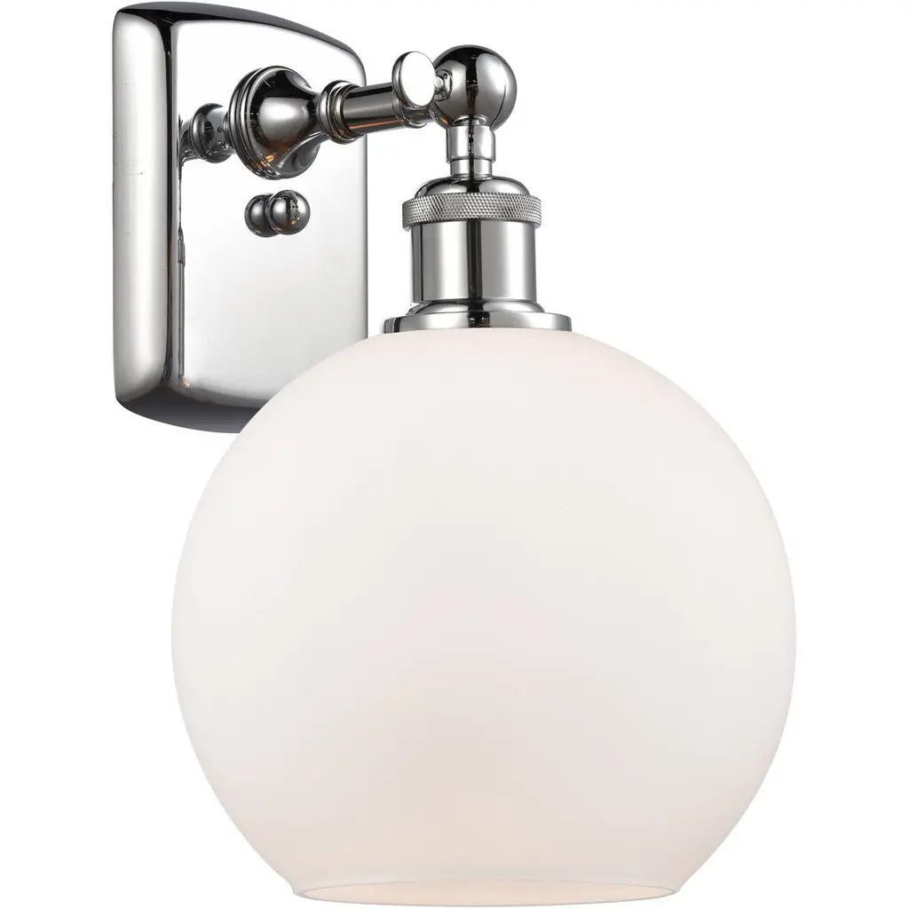 Innovations Lighting 516-1W-PC-G121-8-LED Athens 1 Light 8 inch Sconce. Style: Industrial, Modern Contempo, Restoration-Vintage, Transitional . Collection: Ballston. Material: Steel, Cast Brass, Glass. Metal Finish(Body): Polished Chrome. Metal Finish(Canopy/Backplate): Polished Chrome. Dimension(in): 13(H) x 8(W) x 9(Ext). Bulb: (1)3.5 Watt LED Vintage Medium Base Bulb Included. Voltage: 120. Dimmable: Yes. Color Temperature: 2700. CRI: 82. Lumens: 350. Maximum Wattage Per Socket: 100. Glass Shade Description: Cased Matte White Athens. Shade Material: Glass. Glass or Metal Shade Color: Matte White. Glass Type: Frosted. Shade Size Dimension(in): 8(Dia) x 7(H). Shade Fitter Measurement: Neckless with a 2.125 inch Hole. Backplate Dimenison(in): 6(H) x 4.5(W) x 0.75(Depth). UL and ETL Certification: Damp Location.