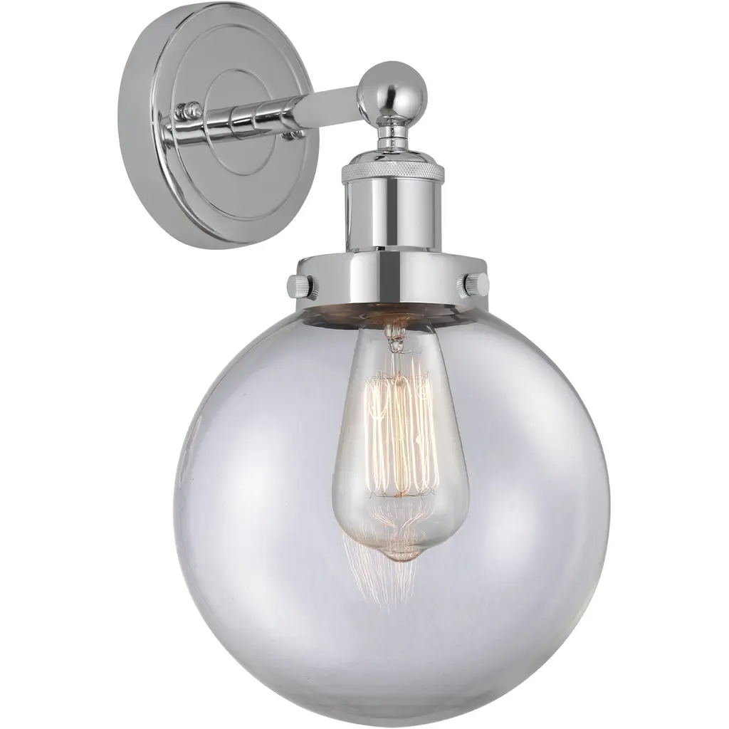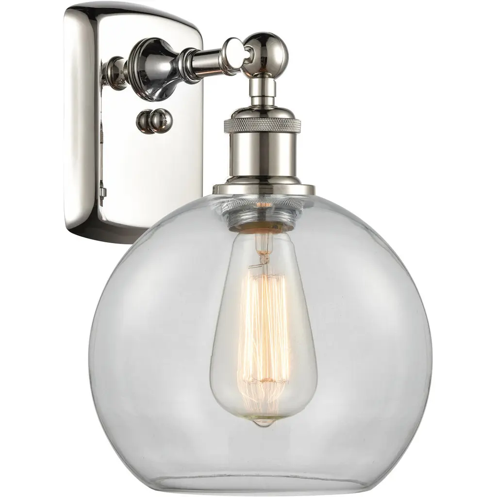 Innovations Lighting 516-1W-PC-G122-8 Athens 1 Light 8 inch Sconce. Style: Industrial, Modern Contempo, Restoration-Vintage, Transitional . Collection: Ballston. Material: Steel, Cast Brass, Glass. Metal Finish(Body): Polished Chrome. Metal Finish(Canopy/Backplate): Polished Chrome. Dimension(in): 13(H) x 8(W) x 9(Ext). Bulb: (1)60W Medium Base Vintage Bulb recommended(Not Included). Voltage: 120. Dimmable: Yes. Color Temperature: 2200. CRI: 99.9. Lumens: 220. Maximum Wattage Per Socket: 100. Glass Shade Description: Clear Athens. Shade Material: Glass. Glass or Metal Shade Color: Clear. Glass Type: Transparent . Shade Size Dimension(in): 8(Dia) x 7(H). Shade Fitter Measurement: Neckless with a 2.125 inch Hole. Backplate Dimenison(in): 6(H) x 4.5(W) x 0.75(Depth). UL and ETL Certification: Damp Location.