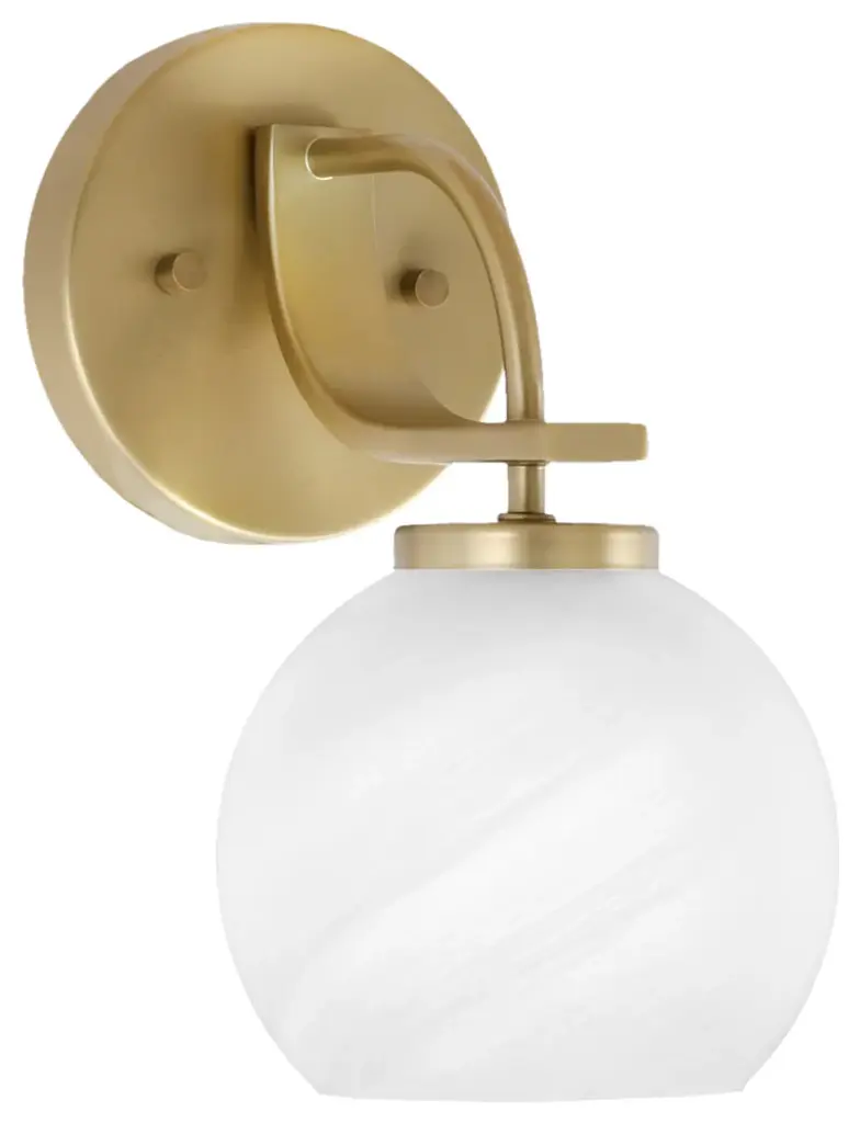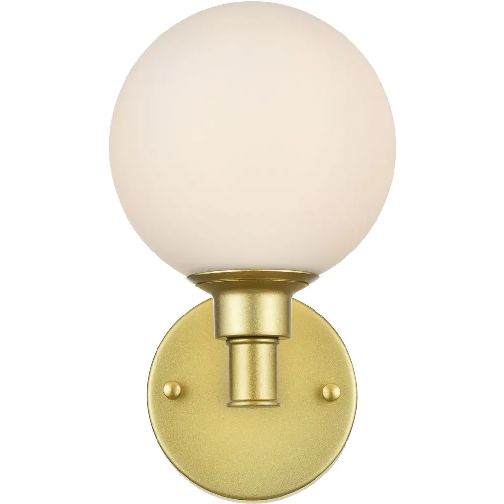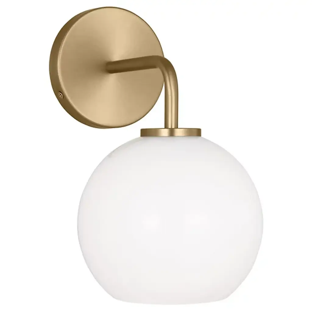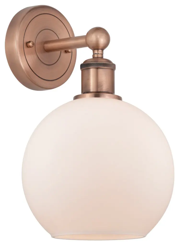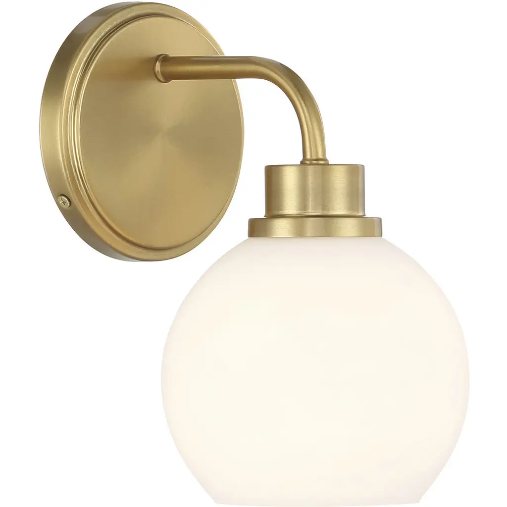 Innovations Lighting 516-1W-SG-G121-8-LED Athens 1 Light 8 inch Sconce. Style: Industrial, Modern Contempo, Restoration-Vintage, Transitional . Collection: Ballston. Material: Steel, Cast Brass, Glass. Metal Finish(Body): Satin Gold. Metal Finish(Canopy/Backplate): Satin Gold. Dimension(in): 13(H) x 8(W) x 9(Ext). Bulb: (1)3.5 Watt LED Vintage Medium Base Bulb Included. Voltage: 120. Dimmable: Yes. Color Temperature: 2700. CRI: 82. Lumens: 350. Maximum Wattage Per Socket: 100. Glass Shade Description: Cased Matte White Athens. Shade Material: Glass. Glass or Metal Shade Color: Matte White. Glass Type: Frosted. Shade Size Dimension(in): 8(Dia) x 7(H). Shade Fitter Measurement: Neckless with a 2.125 inch Hole. Backplate Dimenison(in): 6(H) x 4.5(W) x 0.75(Depth). UL and ETL Certification: Damp Location.