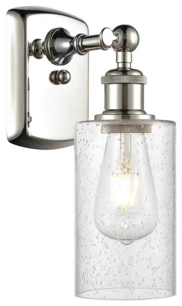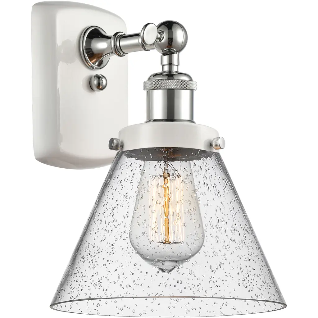 Innovations Lighting 916-1W-WPC-G54-LED Small Bell 1 Light Sconce part of the Ballston Collection. Style: Industrial, Modern Contempo, Restoration-Vintage, Transitional . Collection: Ballston. Material: Steel, Cast Brass, Glass. Metal Finish(Body): White and Polished Chrome. Metal Finish(Canopy/Backplate): White. Accent Color: Polished Chrome. Dimension(in): 12(H) x 5(W) x 6.5(Ext). Bulb: (1)3.5 Watt LED Vintage Medium Base Bulb Included. Voltage: 120. Dimmable: Yes. Color Temperature: 2700. CRI: 82. Lumens: 350. Maximum Wattage Per Socket: 100. Glass Shade Description: Seedy Small Bell. Shade Material: Glass. Glass or Metal Shade Color: Seedy. Glass Type: Seeded. Shade Size Dimension(in): 5(Dia) x 6(H). Shade Fitter Measurement: 3.25 inch Fitter. Backplate Dimenison(in): 6(H) x 4.5(W) x 0.75(Depth). UL and ETL Certification: Damp Location.