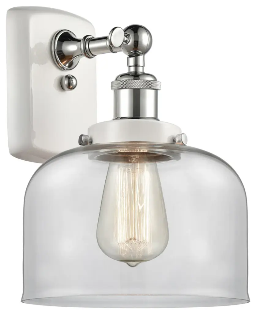 INNOVATIONS 410-1W-SN-G412-8CL Newton Bell 1 8 inch Sconce Satin Nickel. Style: Industrial, Farmhouse, Restoration-Vintage. Collection Name: Downtown Urban. Metal Finish(Body): Satin Nickel. Material: Steel, Cast Brass, Glass. Dimension(in): 14.25(H) x 8(W) x 9.25(Ext). Bulb: (1)60W Medium Base Incandescent(Not Included). Voltage: 120. Dimmable: Yes. Color Temperature (Kelvin): 2200. Color Rendering Index (CRI): 99.9. Lumens: 220. Life Expectancy (Hours): 2000. Glass Shade Description: Clear Newton Bell. Glass Type: Clear. Shade Shape: Bell. Glass or Metal Shade Color: Clear. Shade Material: Glass. Shade Dimension(in): 8(W) x 9.625(H). ADA Compliant: No. California Proposition 65 Warning Required: Yes. UL/ETL Certification Type: Damp Location.