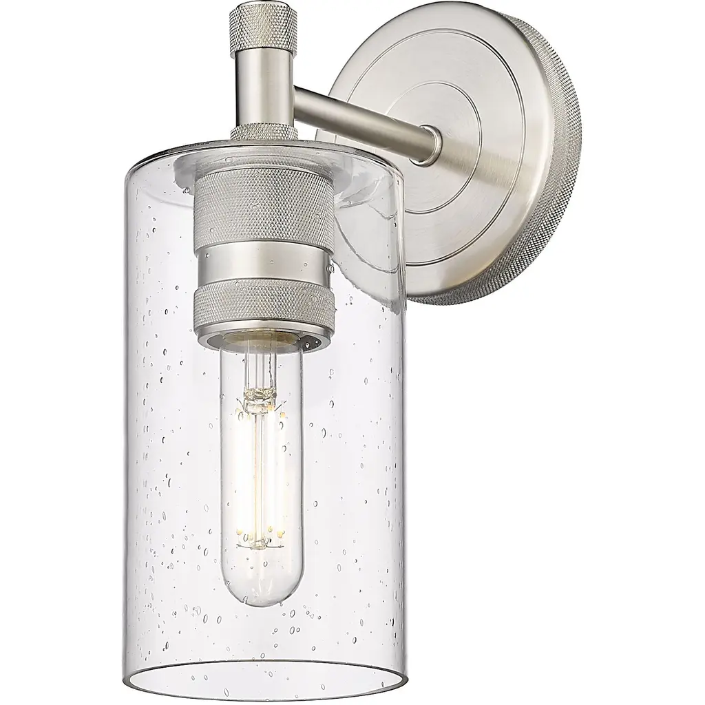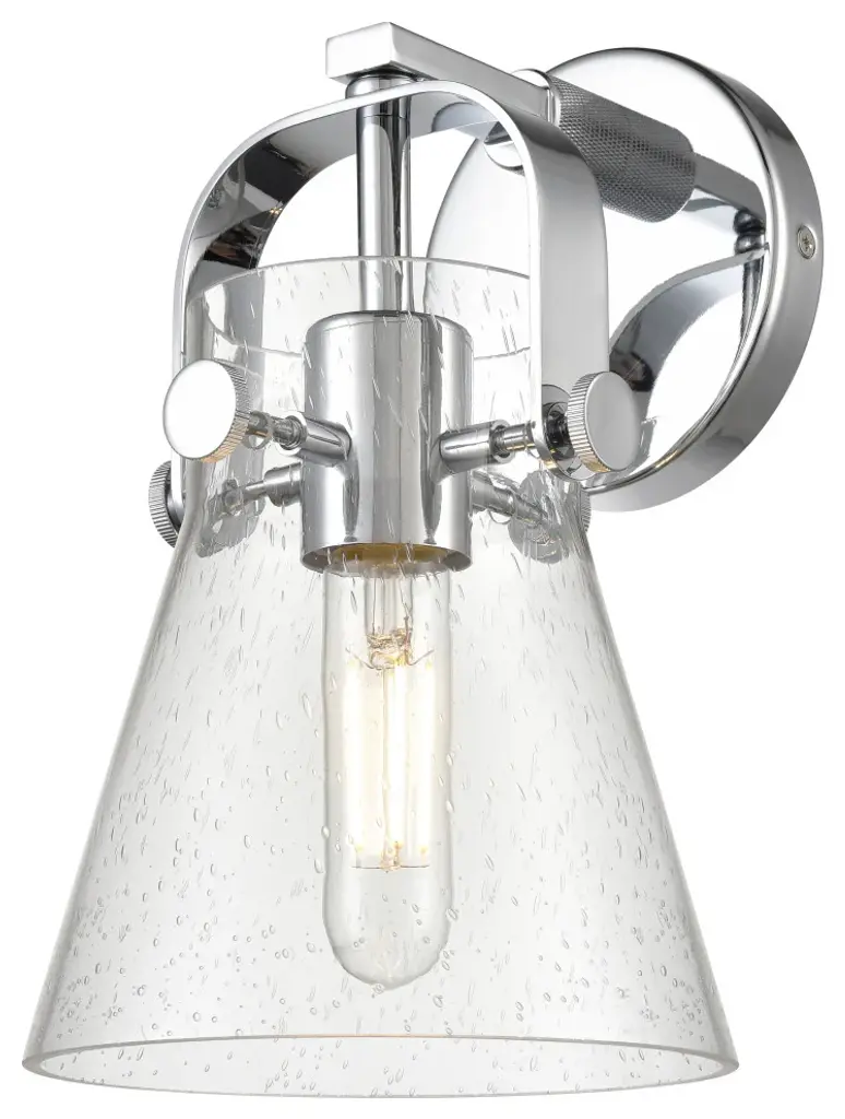 INNOVATIONS 411-1W-SN-G411-8SDY Newton Cone 1 8 inch Sconce Satin Nickel. Style: Industrial, Farmhouse, Restoration-Vintage. Collection Name: Downtown Urban. Metal Finish(Body): Satin Nickel. Material: Steel, Cast Brass, Glass. Dimension(in): 14.25(H) x 8(W) x 9.25(Ext). Bulb: (1)60W Medium Base Incandescent(Not Included). Voltage: 120. Dimmable: Yes. Color Temperature (Kelvin): 2200. Color Rendering Index (CRI): 99.9. Lumens: 220. Life Expectancy (Hours): 2000. Glass Shade Description: Seedy Newton Cone. Glass Type: Seeded. Shade Shape: Cone. Glass or Metal Shade Color: Seedy. Shade Material: Glass. Shade Dimension(in): 8(W) x 9.875(H). ADA Compliant: No. California Proposition 65 Warning Required: Yes. UL/ETL Certification Type: Damp Location.