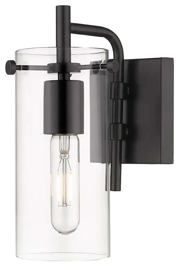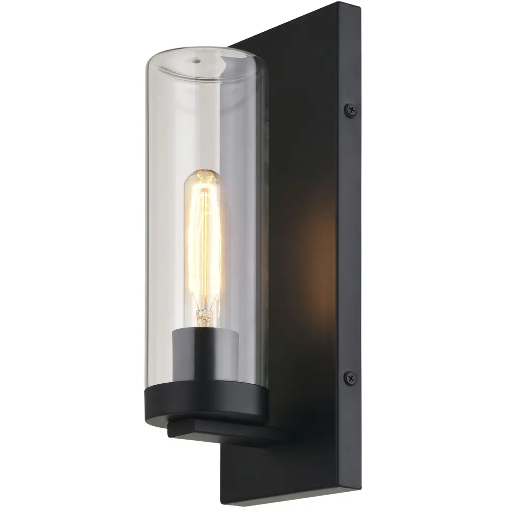 INNOVATIONS 413-1W-BK-G413-1W-4SM Pilaster 1 4.5 inch Sconce Matte Black. Style: Industrial, Farmhouse, Restoration-Vintage. Collection Name: Downtown Urban. Metal Finish(Body): Matte Black. Material: Steel, Cast Brass, Glass. Dimension(in): 17(H) x 4.5(W) x 5.5(Ext). Bulb: (1)5W LED(Included). Voltage: 120. Dimmable: Yes. Color Temperature (Kelvin): 2700. Color Rendering Index (CRI): 90. Lumens: 500. Life Expectancy (Hours): 15000. Glass Shade Description: Light Smoke Pilaster. Glass Type: Smoked. Shade Shape: Cylinder. Glass or Metal Shade Color: Light Smoke. Shade Material: Glass. Shade Dimension(in): 4(W) x 12(H). ADA Compliant: No. Sloped Ceiling Compatible: Yes. California Proposition 65 Warning Required: Yes. UL/ETL Certification Type: Damp Location.