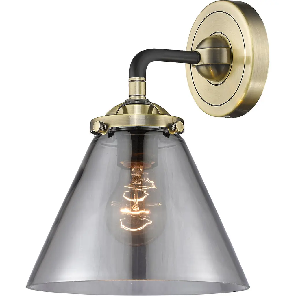 INNOVATIONS 423-1W-BB-G411-6SM Pilaster II Cone 1 6.5 inch Sconce Brushed Brass. Style: Industrial, Farmhouse, Restoration-Vintage. Collection Name: Downtown Urban. Metal Finish(Body): Brushed Brass. Material: Steel, Cast Brass, Glass. Dimension(in): 10.125(H) x 6.5(W) x 7.625(Ext). Bulb: (1)6W LED(Included). Voltage: 120. Dimmable: Yes. Color Temperature (Kelvin): 2700. Color Rendering Index (CRI): 90. Lumens: 750. Life Expectancy (Hours): 15000. Glass Shade Description: Light Smoke Pilaster II Cone. Glass Type: Smoked. Shade Shape: Cone. Glass or Metal Shade Color: Light Smoke. Shade Material: Glass. Shade Dimension(in): 6.5(W) x 7(H). ADA Compliant: No. California Proposition 65 Warning Required: Yes. UL/ETL Certification Type: Damp Location.