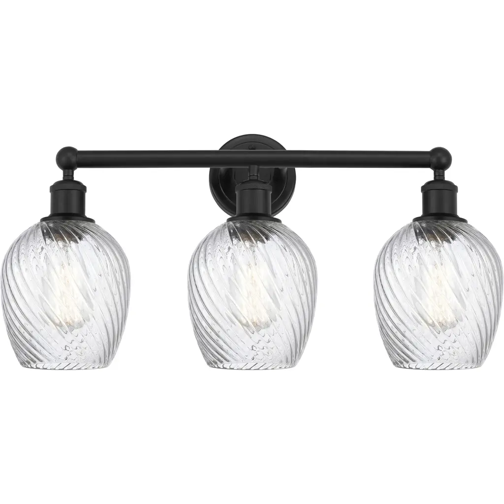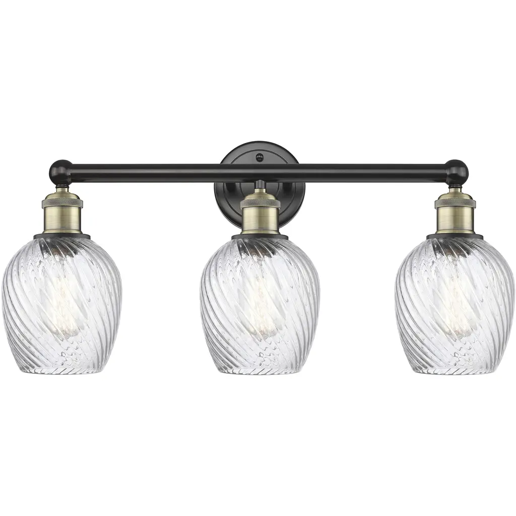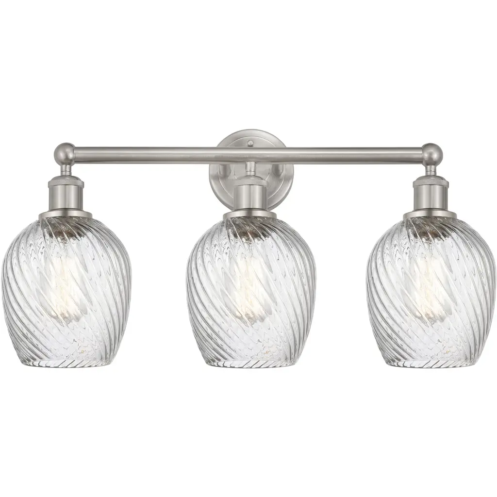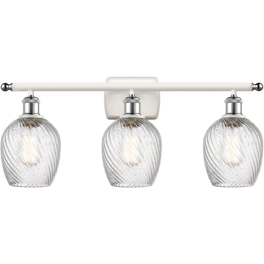 INNOVATIONS 616-3W-PC-G292 Salina 3 23 inch Bath Vanity Light Polished Chrome. Style: Industrial, Modern Contempo, Restoration-Vintage, Transitional . Collection Name: Downtown Urban. Metal Finish(Body): Polished Chrome. Material: Steel, Cast Brass, Glass. Dimension(in): 11.625(H) x 23.75(W) x 7.375(Ext). Bulb: (3)60W Medium Base Incandescent(Not Included). Voltage: 120. Dimmable: Yes. Color Temperature (Kelvin): 2200. Color Rendering Index (CRI): 99.9. Lumens: 220. Life Expectancy (Hours): 2000. Glass Shade Description: Clear Spiral Fluted Salina. Glass Type: Transparent . Shade Shape: Globe/Orb. Glass or Metal Shade Color: Clear Spiral Fluted. Shade Material: Glass. Shade Dimension(in): 5.75(W) x 6.375(H). Fitter Measurement (Glass Or Metal Shade Fitter Size): Neckless with a 1.675 inch opening. ADA Compliant: No. California Proposition 65 Warning Required: Yes. UL/ETL Certification Type: Damp Location.