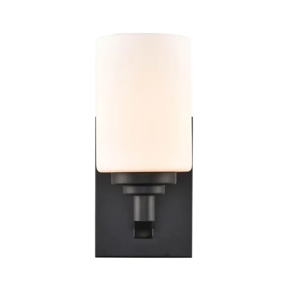 INNOVATIONS 426-1W-BK-G426-8WH Utopia 1 4.75 inch Sconce Matte Black. Style: Contemporary, Farmhouse, Restoration-Vintage. Collection Name: Downtown Urban. Metal Finish(Body): Matte Black. Material: Steel, Cast Brass, Glass. Dimension(in): 12(H) x 4.75(W) x 6.25(Ext). Bulb: (1)6W LED(Included). Voltage: 120. Dimmable: Yes. Color Temperature (Kelvin): 2700. Color Rendering Index (CRI): 90. Lumens: 750. Life Expectancy (Hours): 15000. Glass Shade Description: White Utopia. Glass Type: Frosted. Shade Shape: Cylinder. Glass or Metal Shade Color: White. Shade Material: Glass. Shade Dimension(in): 3.875(W) x 8.25(H). ADA Compliant: No. California Proposition 65 Warning Required: Yes. UL/ETL Certification Type: Damp Location.