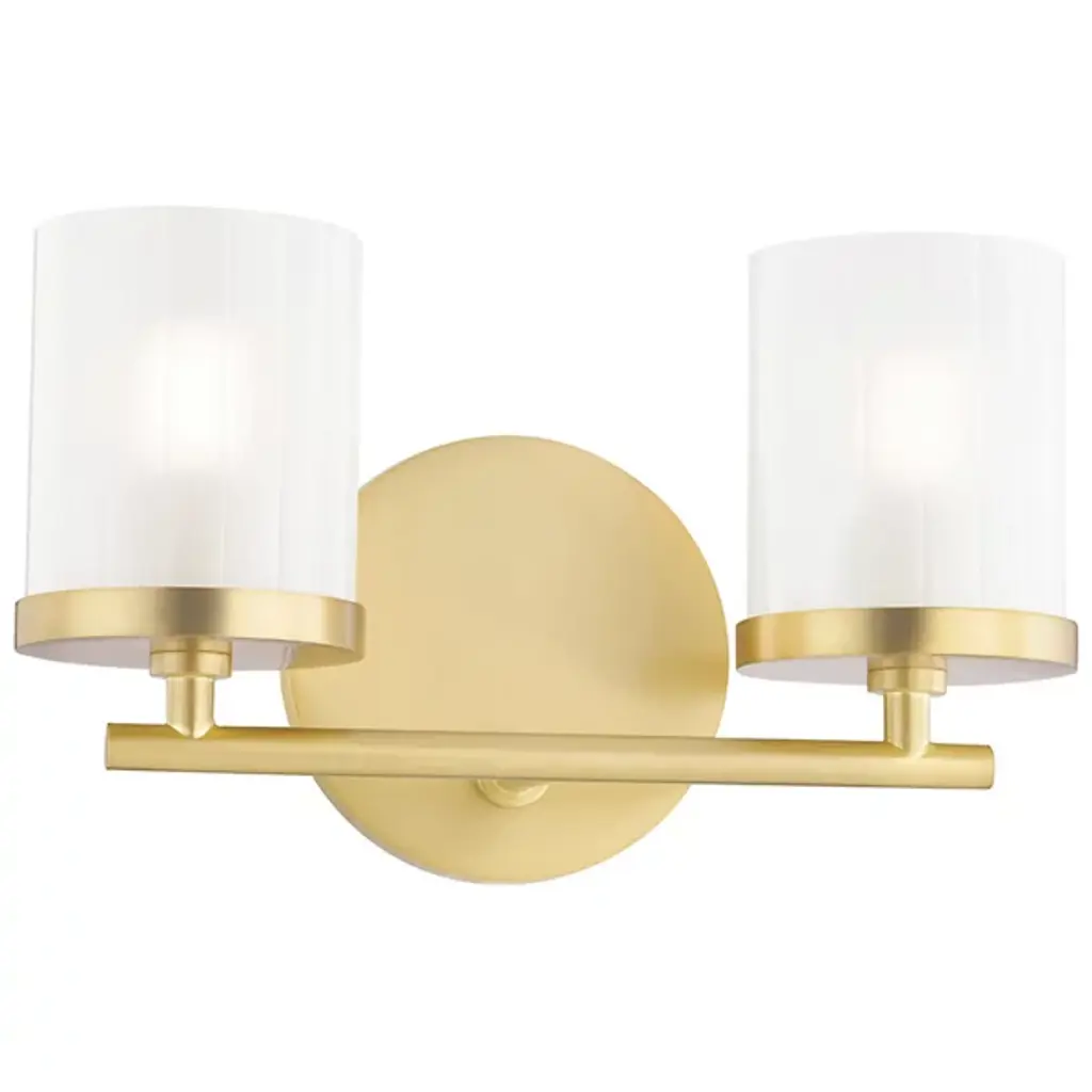 INNOVATIONS 426-2W-BB-G426-8WH Utopia 2 15 inch Bath Vanity Light Brushed Brass. Style: Contemporary, Farmhouse, Restoration-Vintage. Collection Name: Downtown Urban. Metal Finish(Body): Brushed Brass. Material: Steel, Cast Brass, Glass. Dimension(in): 11.625(H) x 15(W) x 6.25(Ext). Bulb: (2)6W LED(Included). Voltage: 120. Dimmable: Yes. Color Temperature (Kelvin): 2700. Color Rendering Index (CRI): 90. Lumens: 750. Life Expectancy (Hours): 15000. Glass Shade Description: White Utopia. Glass Type: Frosted. Shade Shape: Cylinder. Glass or Metal Shade Color: White. Shade Material: Glass. Shade Dimension(in): 3.875(W) x 8.25(H). ADA Compliant: No. California Proposition 65 Warning Required: Yes. UL/ETL Certification Type: Damp Location.