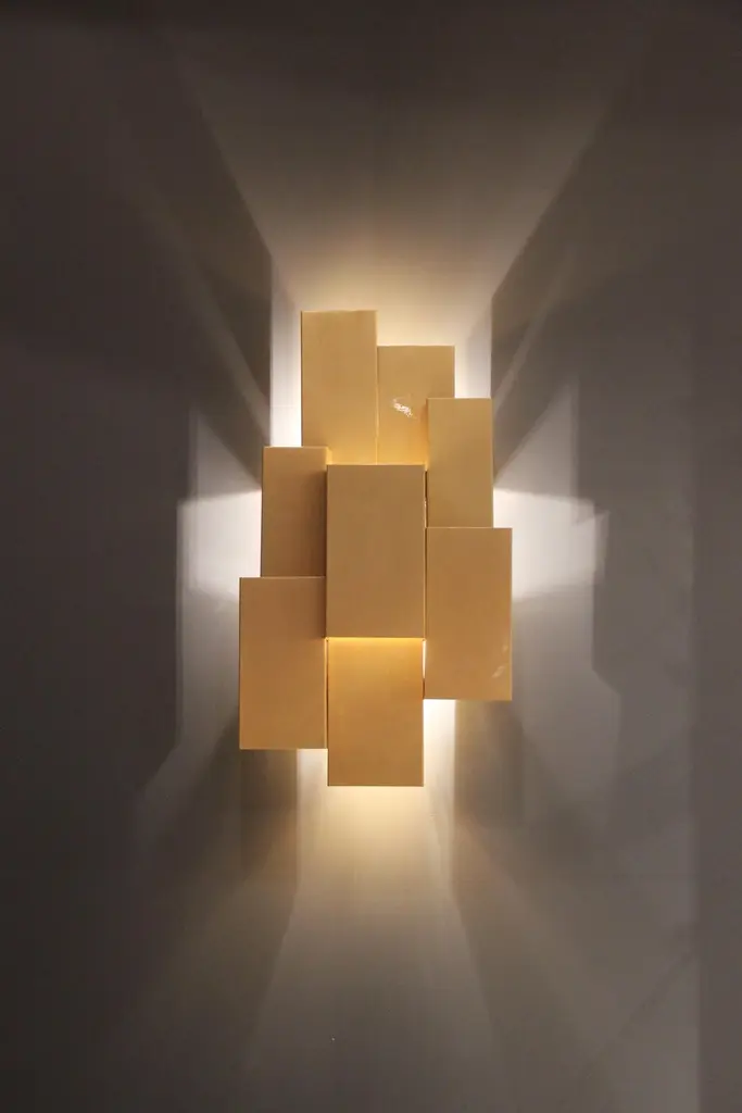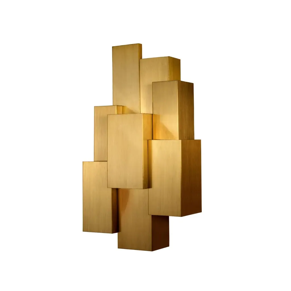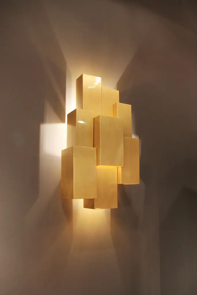 Inspiring trees recreates a treetop and is fully handcrafted. The rays of light pierce the geometric design in an unexpected way, almost ethereal.Slender and seemingly minimal, Inspiring Trees is a lighting piece that carries form and meaning. It recreates a vertical ‘treetop’ and is fully handcrafted in brushed brass.The light is distributed by the three levels of the ‘treetop’ and diffuses, controlled by the geometry of several overlapping pieces. It is a unique lamp specially designed to decorate hospitality projects such as luxury hotels that look for unique contemporary wall lamps.Product detailsHandcrafted brushed brass finished in gloss varnish.Product optionsHammered, brushed, oxidized brushed or aged brushed brass or copper or steel.Weight3Kg 6.7 lbs Electrical characteristicsMains: 3 wires connection - Live ; Neutral ; EarthFrequency: 50-60HzUSAVoltage: 110-130VACLamp: LED E12 candelabrum, 2 x 40W max.EUROPEVoltage: 220-240VACLamp: LED E14, 2 x 40W max.Made to order. Custom sizes and other finishes are available under request. Designed by Joana Santos Barbosa, 2014. Handmade in Portugal.