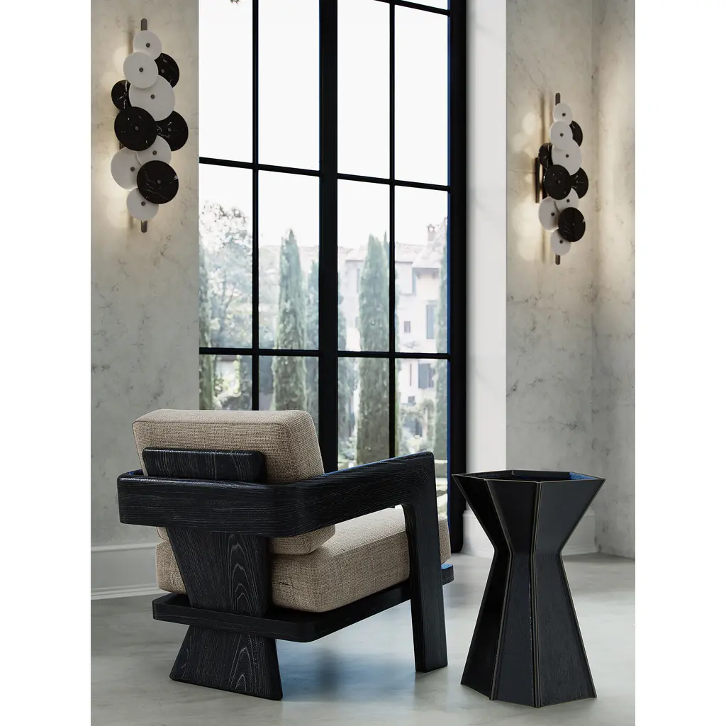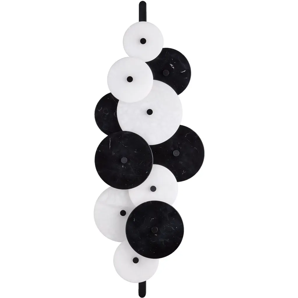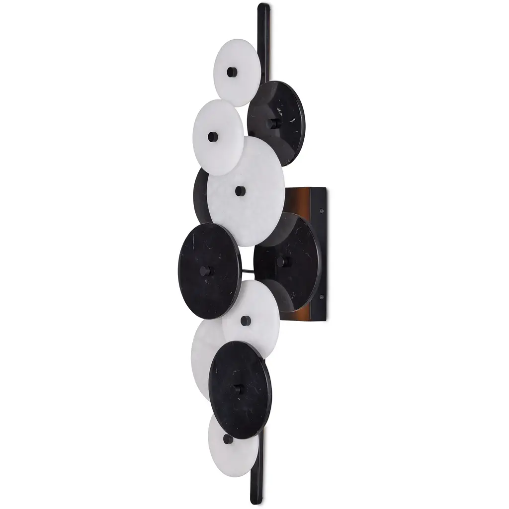The Inyo Wall Sconce was designed to be an exemplar of contrast. Fitted with integrated LED bulbs, the illumination bounces off the wall and shines through the natural alabaster discs. The darker discs are made of black marble, and the metal brads and stem are in a satin black finish. The black and white wall sconce can be mounted vertically or horizontally.