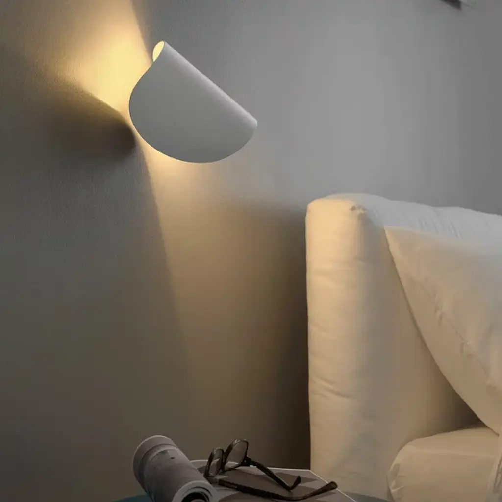 A small fixture with powerful utility, the Io LED Wall Sconce by FontanaArte is functional art. Designed by Claesson Koivisto Rune in 2015, this award-winning fixture presents a minimal and ethereal aesthetic. Its curved disc shape hovers over the wall, attached by a concealed mount that allows it to be rotated by 360-degrees. Its integrated LED light source is funneled through both ends, creating an atmospheric effect across a wall, and when titled, it offers a more direct and focused beam of light in the desired direction.