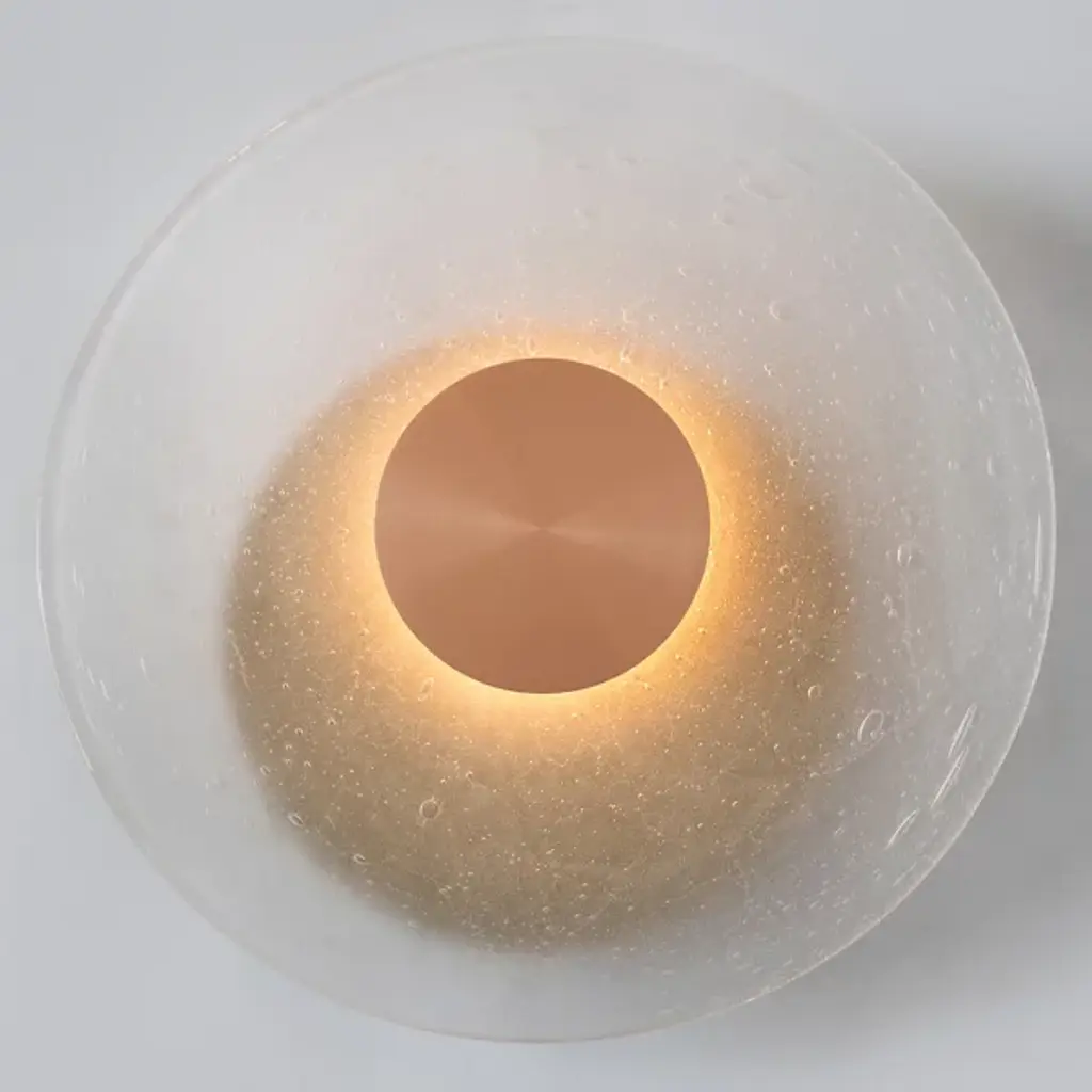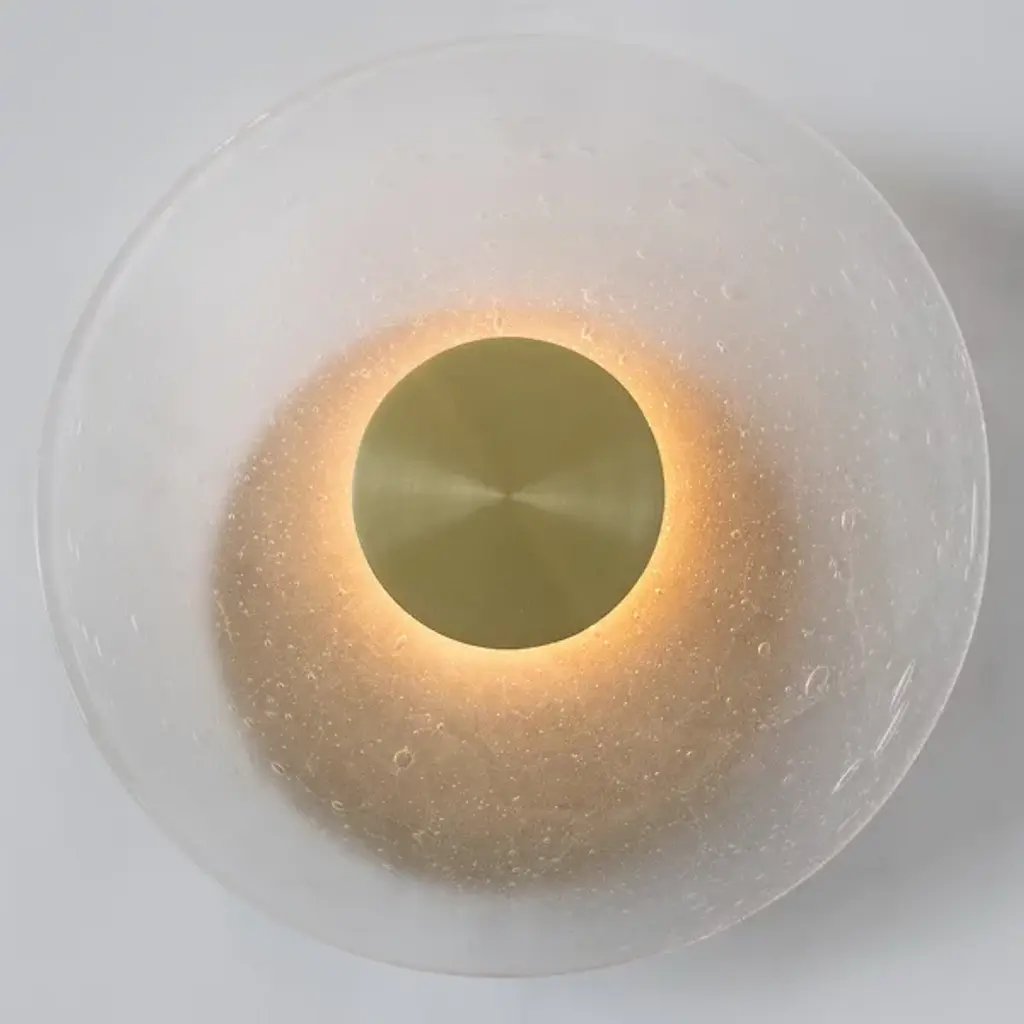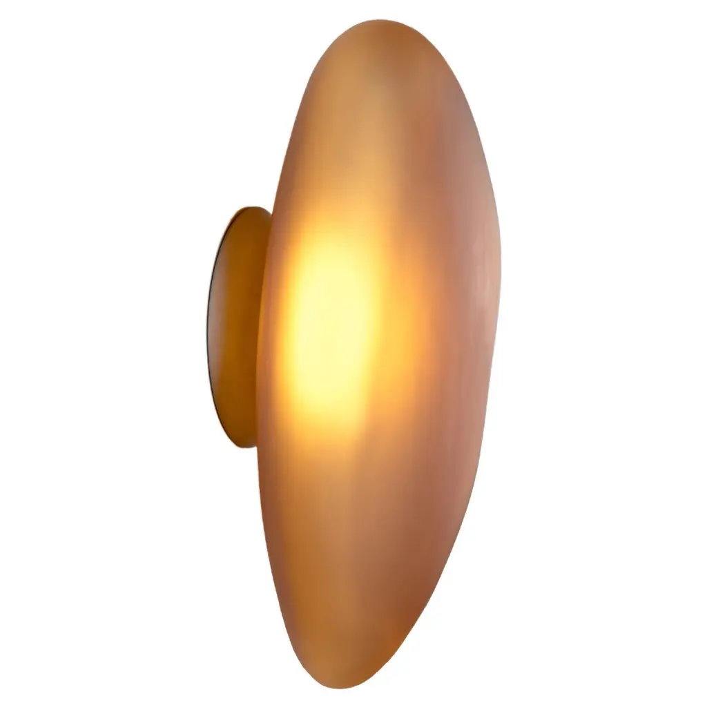 Iris LED Wall Sconce from Ridgely Studio Like is distinct to you as a handblown glass piece. It evokes the colorful, light-regulating rings of one’s eye that it shares its name with. Poetry, craftsmanship, and creativity highlight this piece by Zac Ridgely, a creator with an artistic approach to design. The sconce welcomes a standalone or expansive grouped display with help from a compact steel backplate. The backplate produces a front-facing disc that draws a bold silhouette while concealing the brilliant light source. Handblown by master artisans, the glass shade impresses with textural notes like that of the eye’s iris. This glass display receives a deep golden hue from the LEDs’ radiant glow.