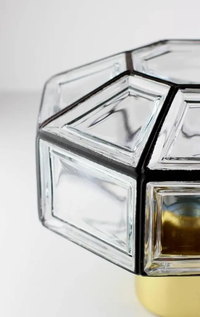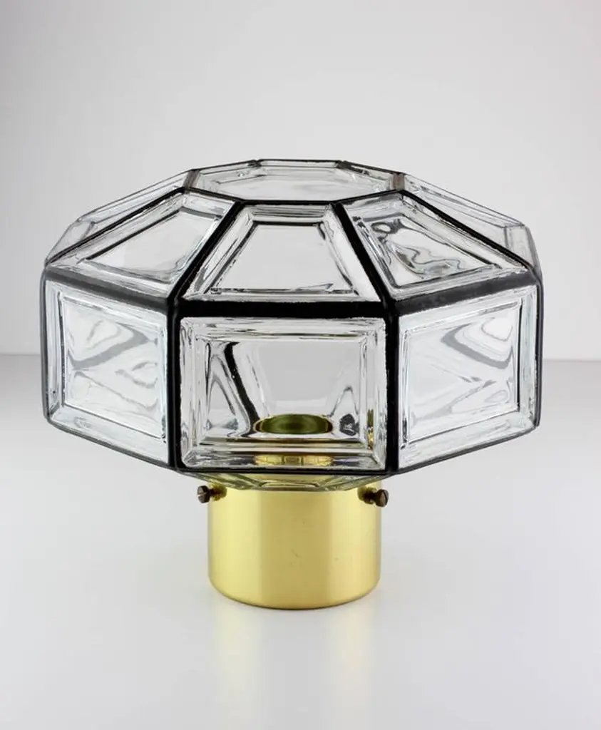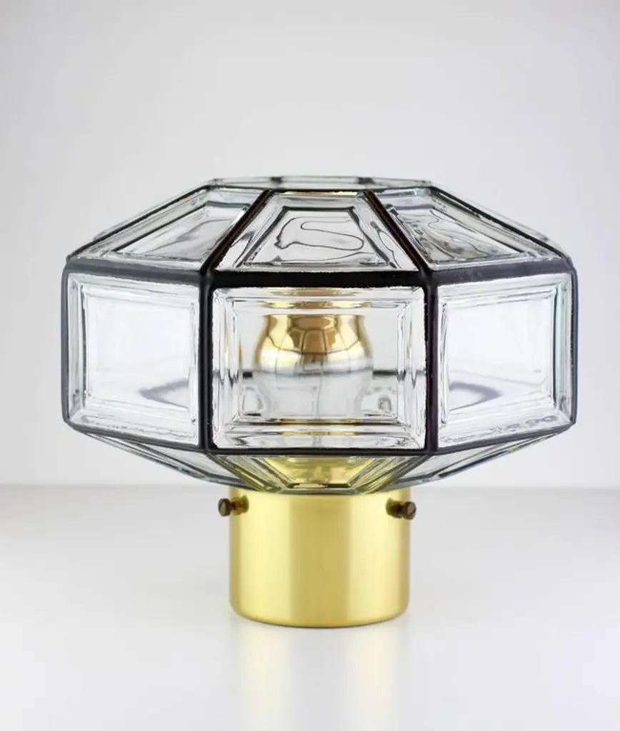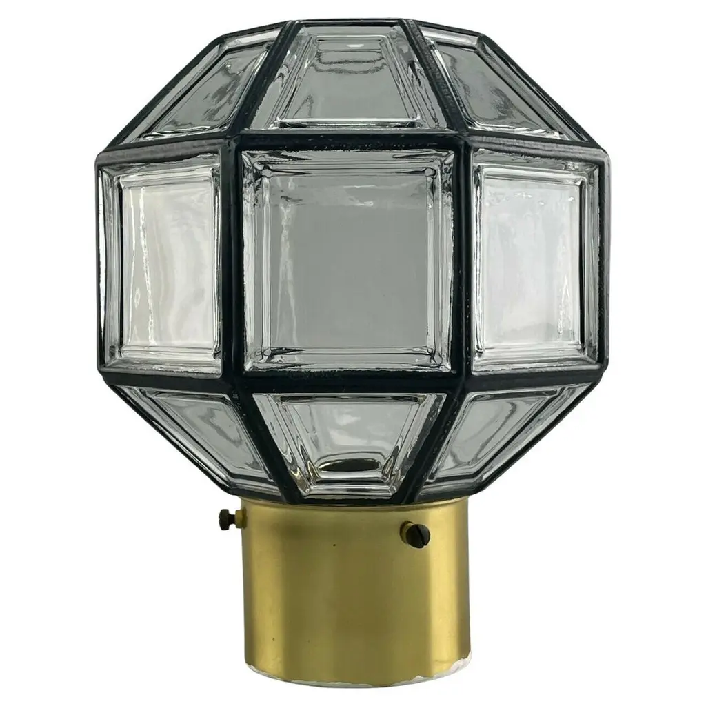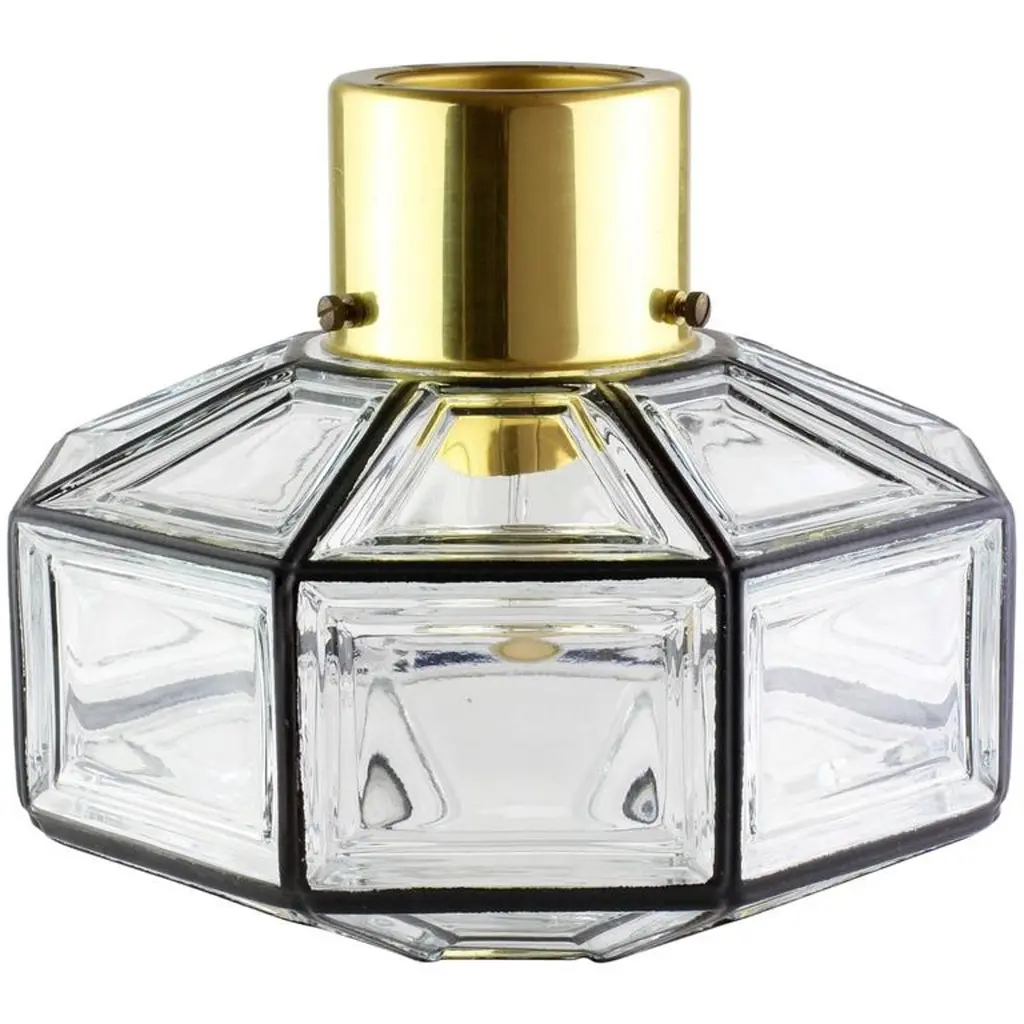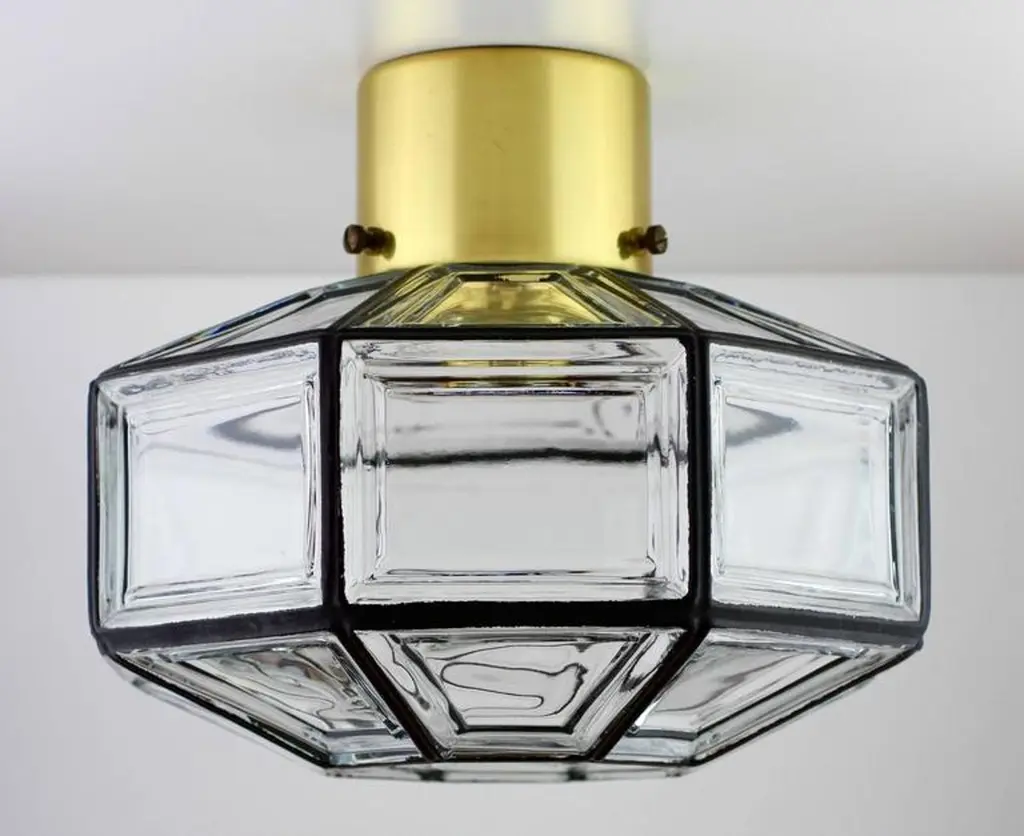 One of a pair of octagonally shaped, Mid-Century Minimalist German made flush mount lights or sconces manufactured by Glashütte Limburg, circa 1965. This Contemporary Art Deco and lantern style Plafonnier casts a fantastic light when mounted on the ceiling or wall and used with a gold crowned reflector bulb. We have matching large and small Pendants available - just visit our 1stdibs store for more information.Newly rewired, the light requires one single E27 screw fit lightbulb (60Watt max.) priced individually.