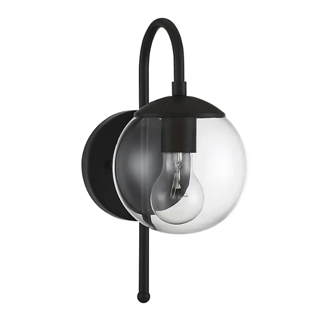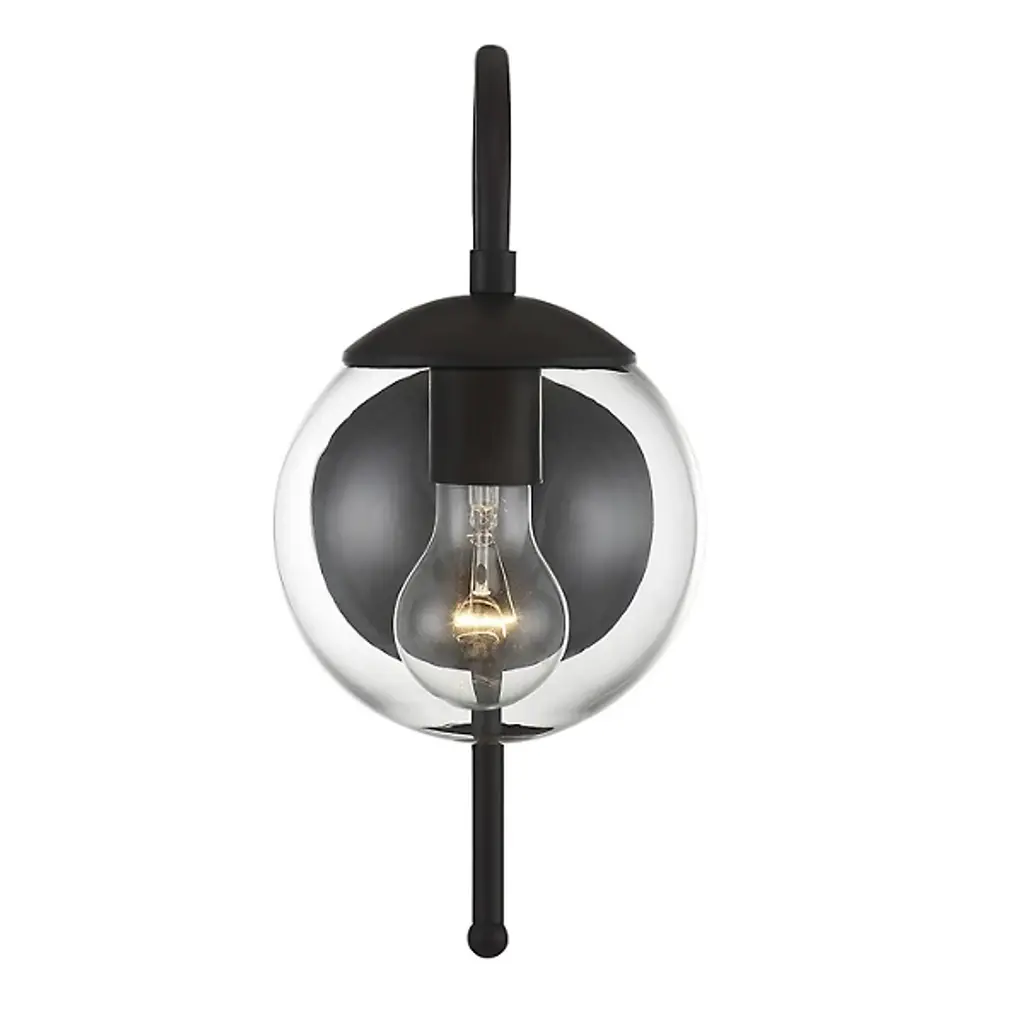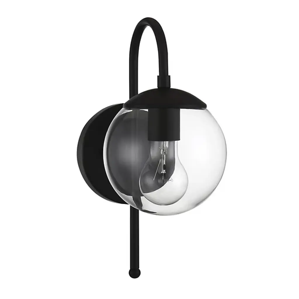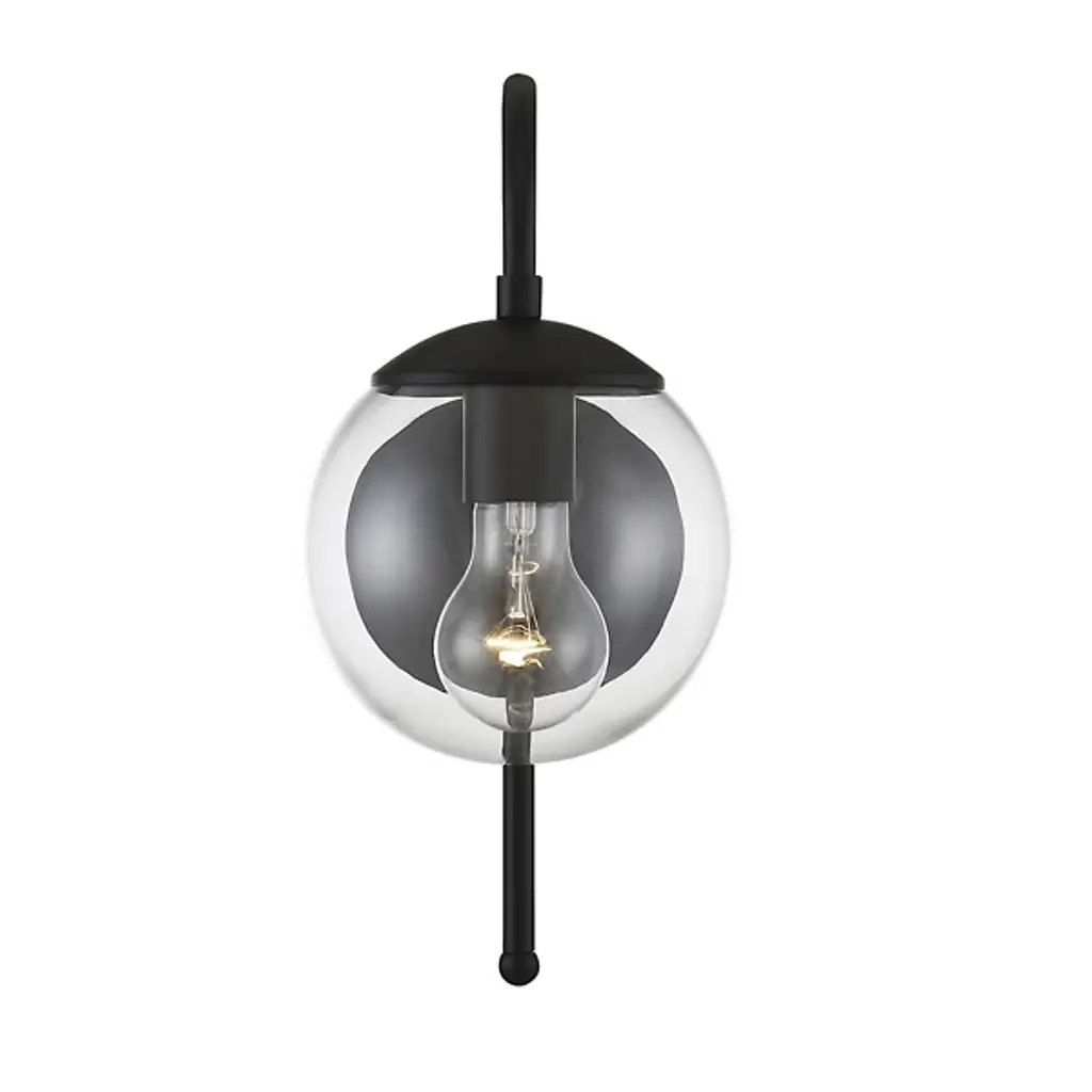 The Isaiah Outdoor Wall Sconce by Alder & Ore is a stark fixture with elegant appeal. Mounted by a rounded backplate, an elongated arm extends up and forward to hold a globe-shaped shade. Constructed from clear glass, the glossy orb encloses the fixture’s inner lamping, allowing the incandescent bulb to shine on full display. Its extended tail is capped with a rounded final for an added touch of character, making this fixture a chic addition to any exterior space.