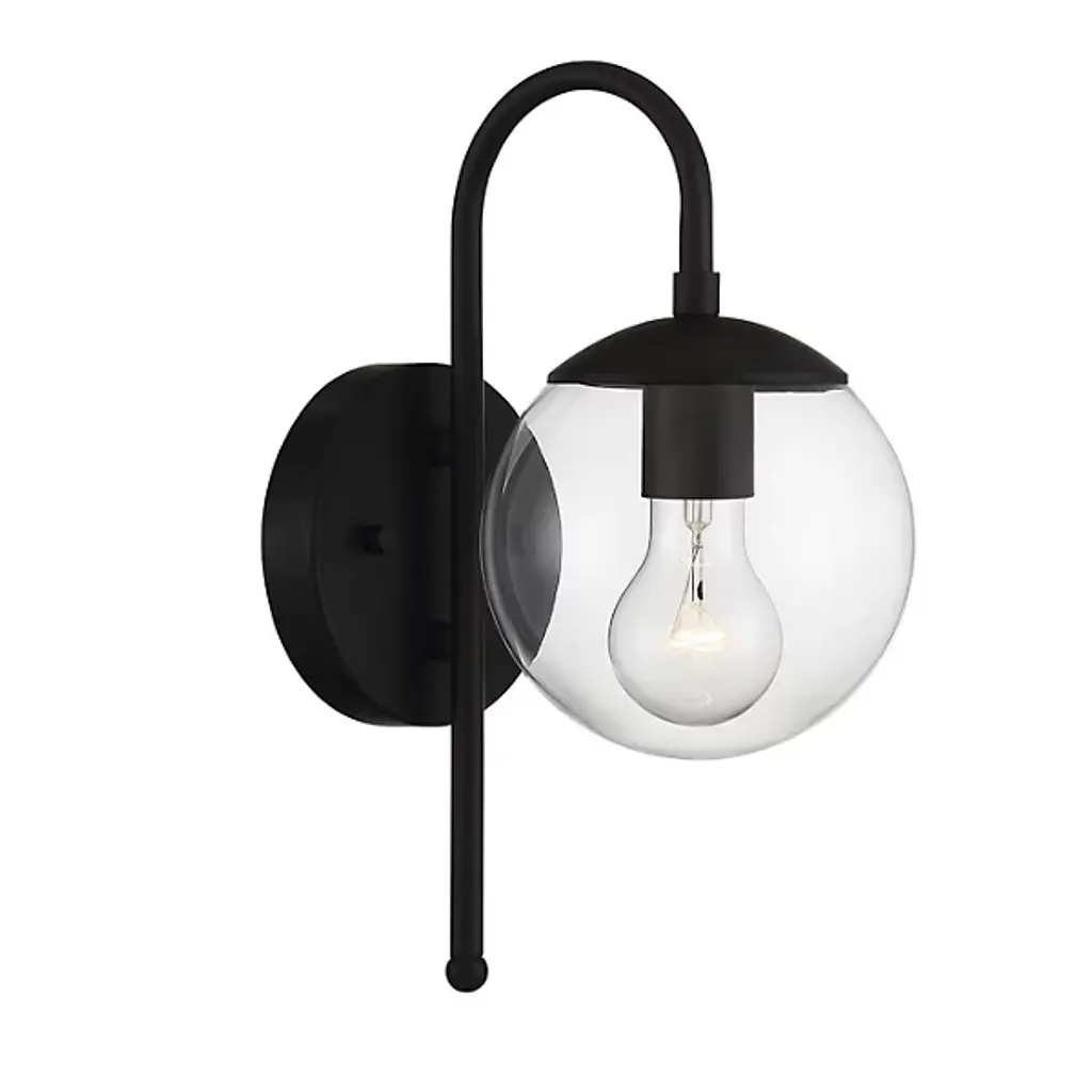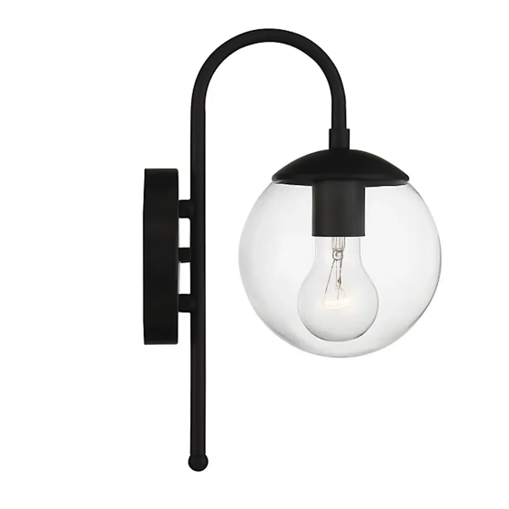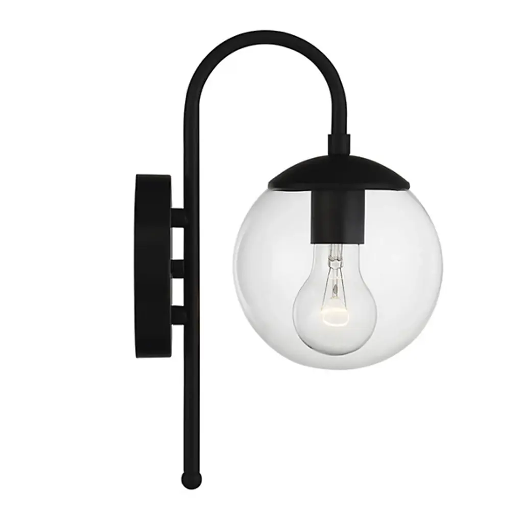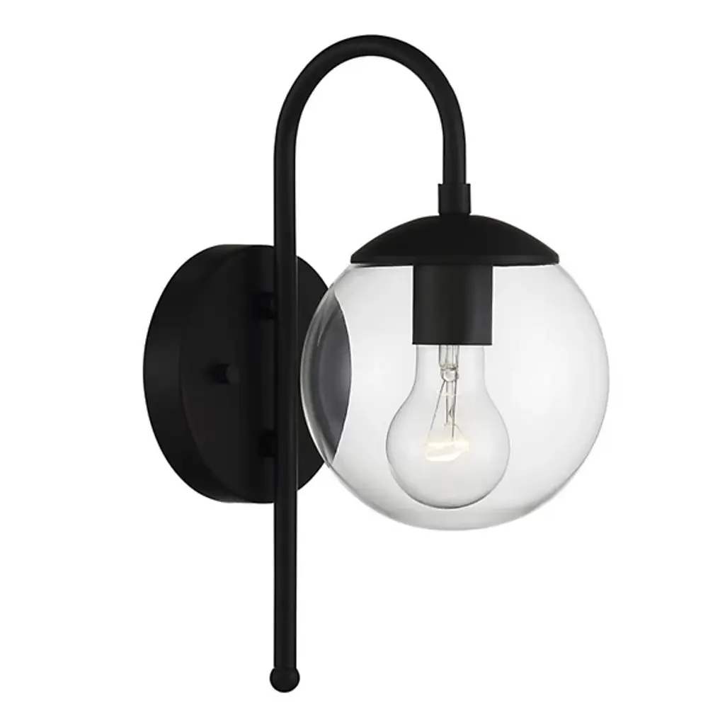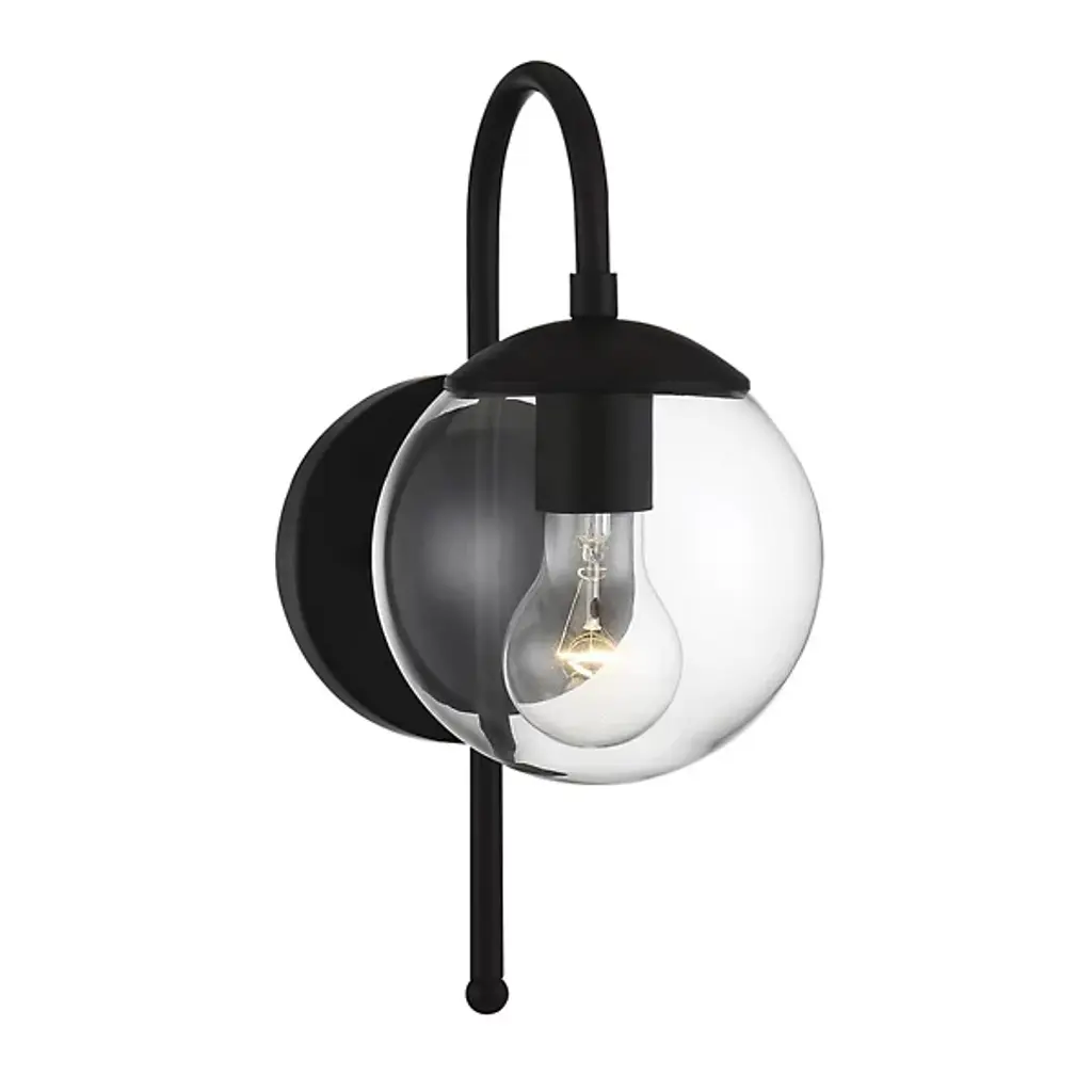 The Isaiah Outdoor Wall Sconce by Alder & Ore is a stark fixture with elegant appeal. Mounted by a rounded backplate, an elongated arm extends up and forward to hold a globe-shaped shade. Constructed from clear glass, the glossy orb encloses the fixture’s inner lamping, allowing the incandescent bulb to shine on full display. Its extended tail is capped with a rounded final for an added touch of character, making this fixture a chic addition to any exterior space.