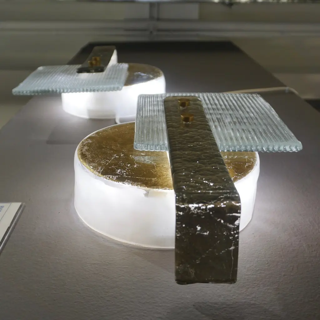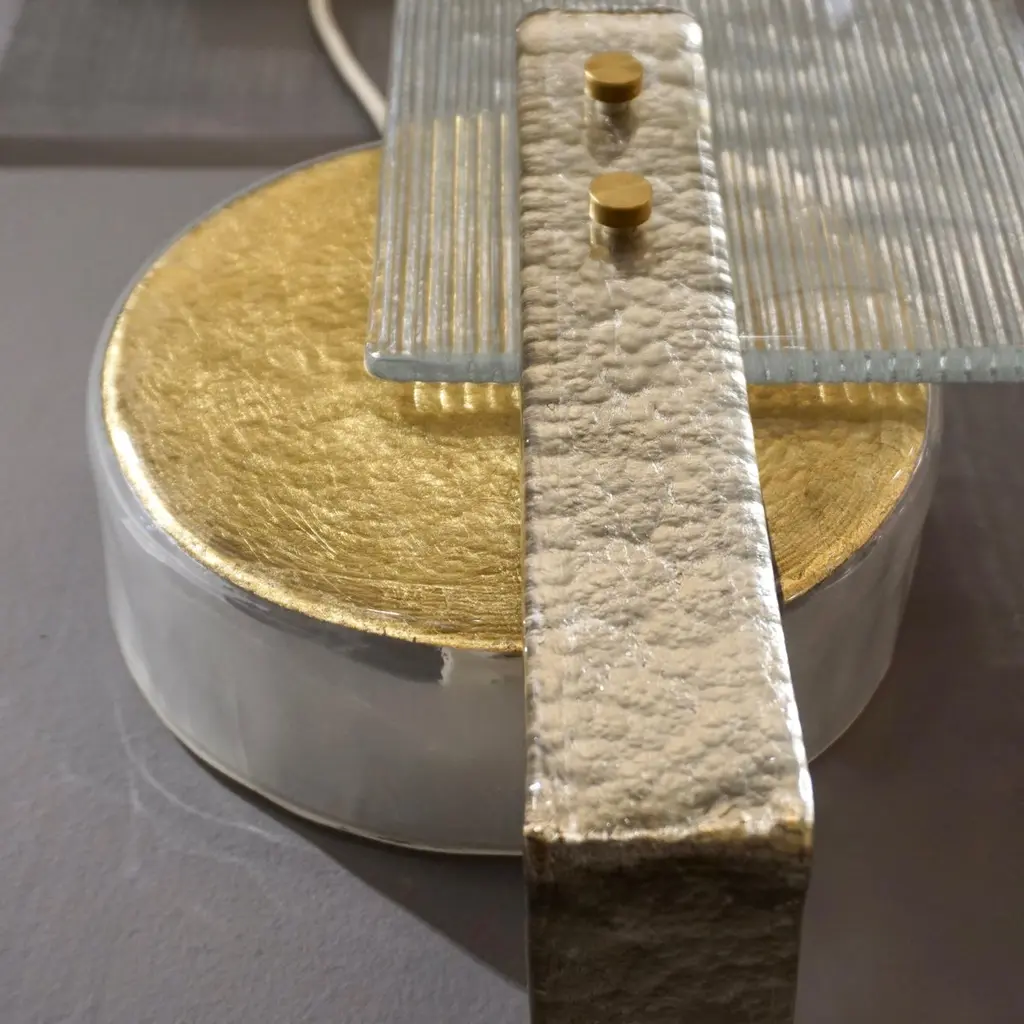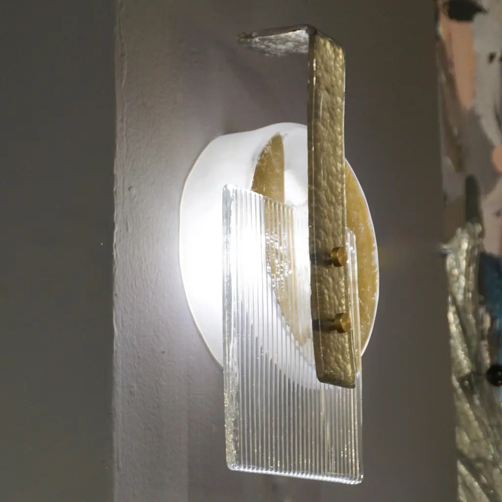 Contemporary Venetian elegant modernist geometric wall light/ flush mount, abstract sculpture Design, entirely handcrafted and cleverly composed of three sophisticated textured Murano Art glass pieces: an L-shape glass element worked with hammered silver leaf to add depth to the finish, a ribbed crystal clear square and a round textured frosted white disc worked with a gold decor, executed by hand-applied gold leaf with a craquelure pattern to let light shine through. Mounted on white lacquered metal backplates.Fitted with G9 bulbs.Can be mounted upside down, positioned diagonally to your liking or used as flushmount.