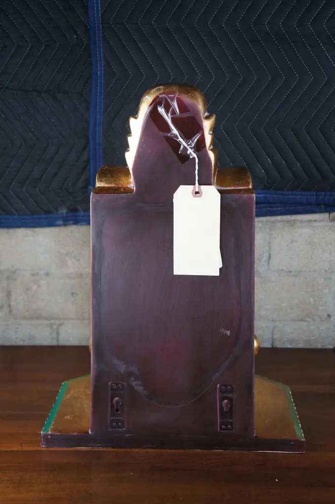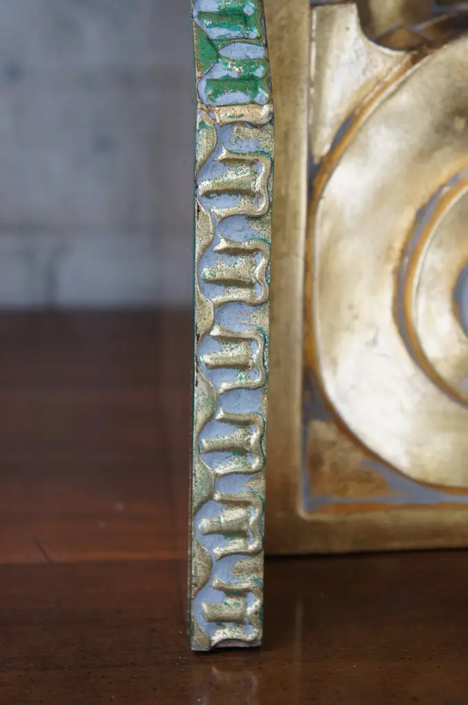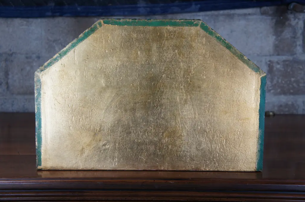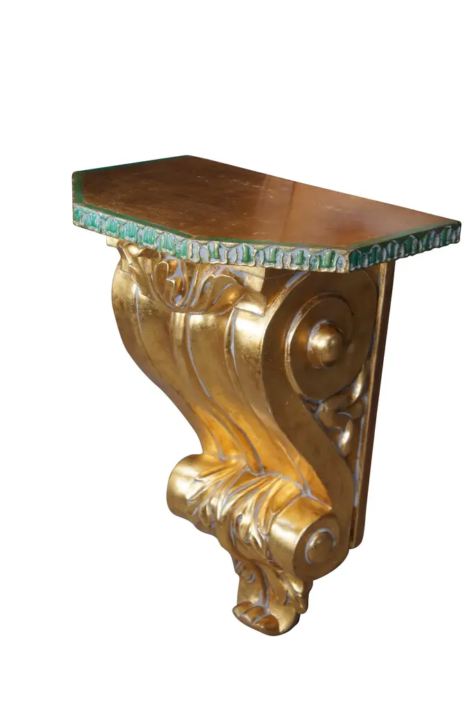 Early 21st century Baroque Style gold leaf designed gilt composite wall bracket / sconce / shelf, featuring a scrolled design accented with acanthus leaves and a pentagonal / clipped corner top edged in green. Style no 1008; 24 Available Dimensions: 15 x 10 x 20