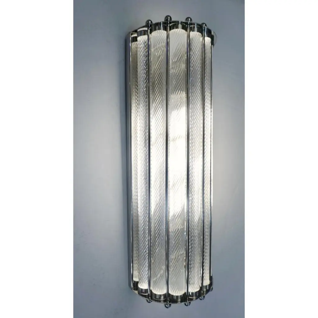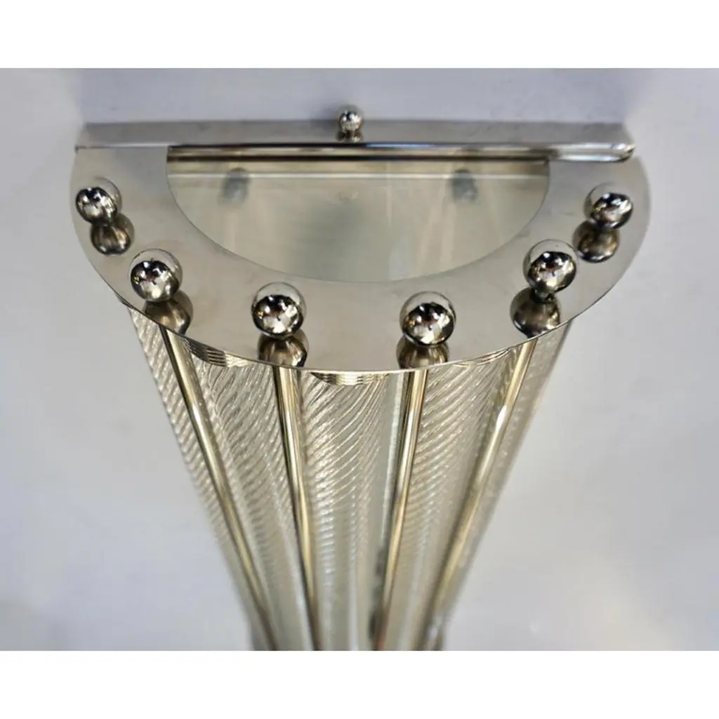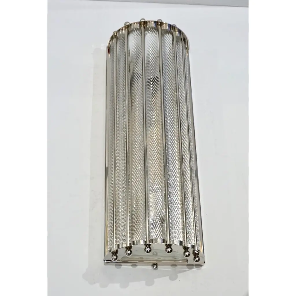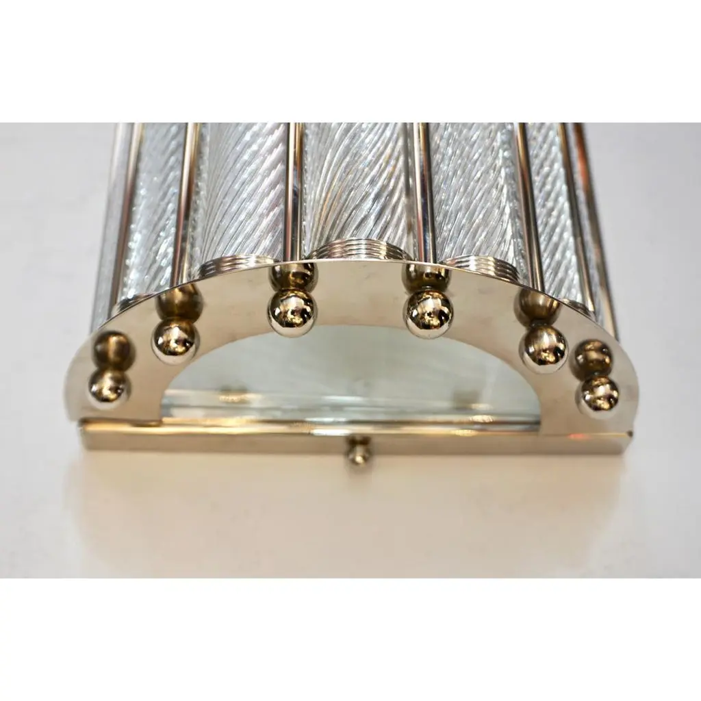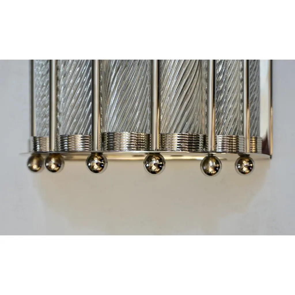 One pair is available now. Contemporary customizable Italian Art Deco Design pair of semi-circular wall lights, entirely handcrafted, with a polished nickel finish. The nicely scalloped airy structure supports crystal clear Murano glass rods worked with the sophisticated technique Torchon, handcrafted twisted glass, that not only makes the fixture more precious but multiplies the light reflections. This can also be ordered to hang horizontal or as a flushmount as well.High quality of construction and details with a decorative curved nickel band and elegant frosted Murano glass to enclose both top and bottom.The backplate is 7.5 inches wide.Options available for different finishes and sizes. This pair in Satin Nickel finish costs $5,380Weight: approx. 12 lbs Each.Also see lanterns and drum chandeliers in this same style.Fitted with 2 standard E26 Edison sockets