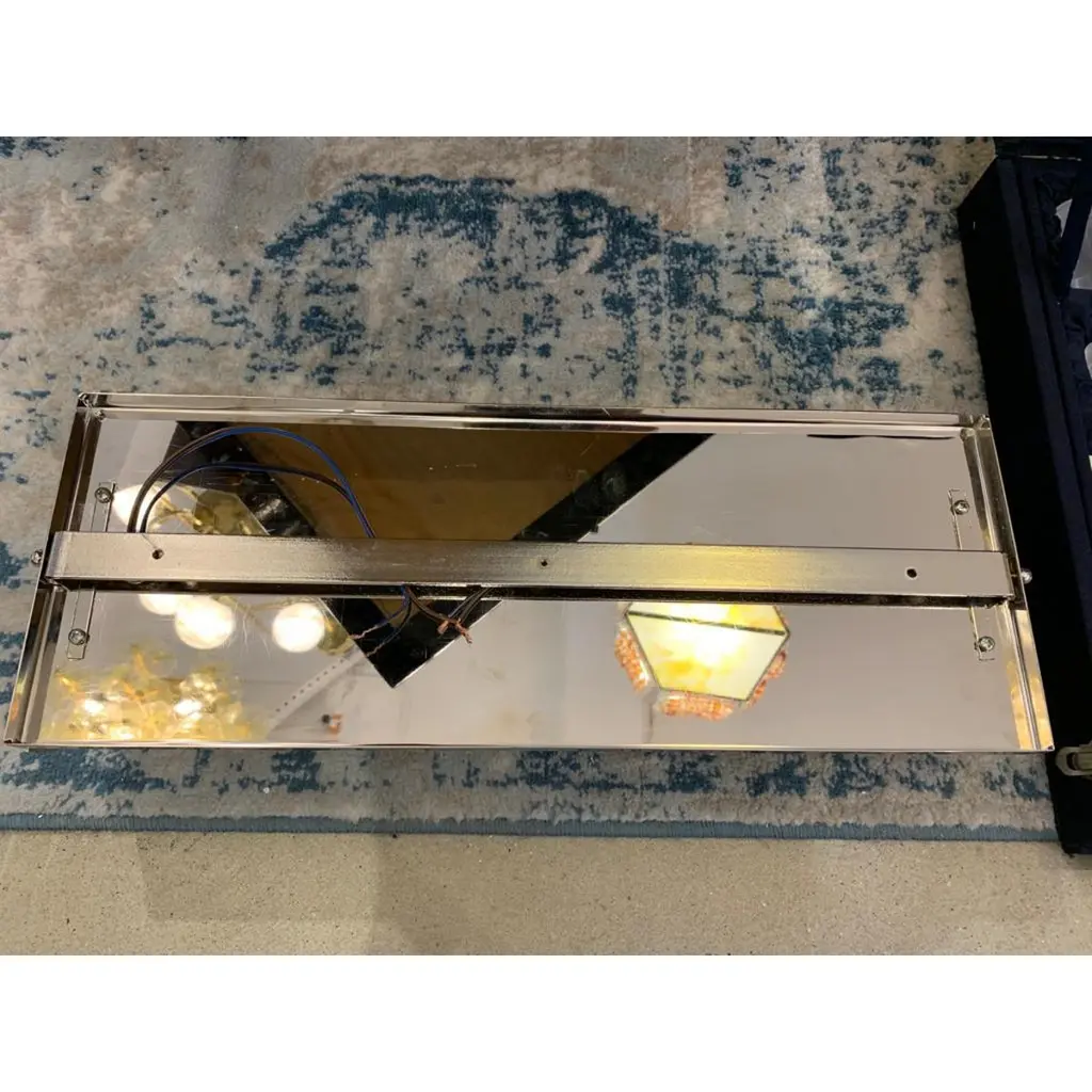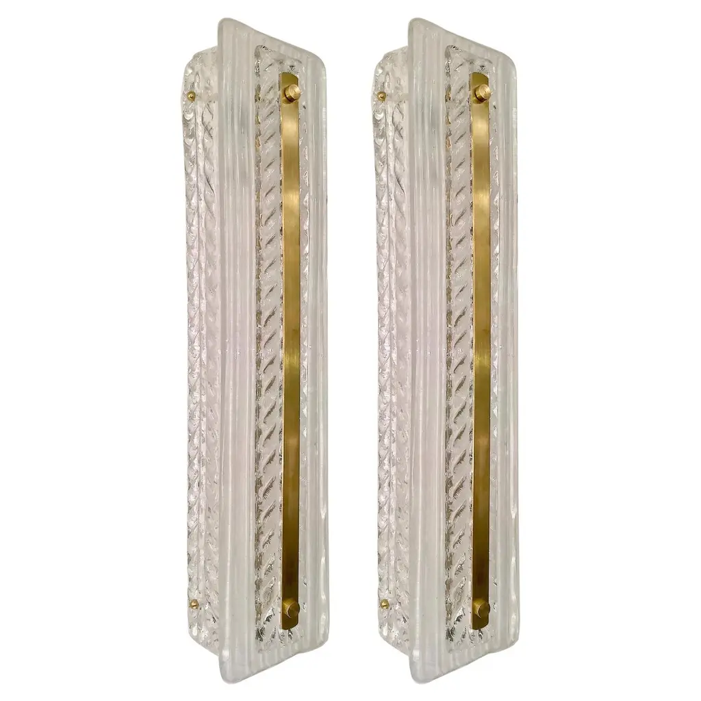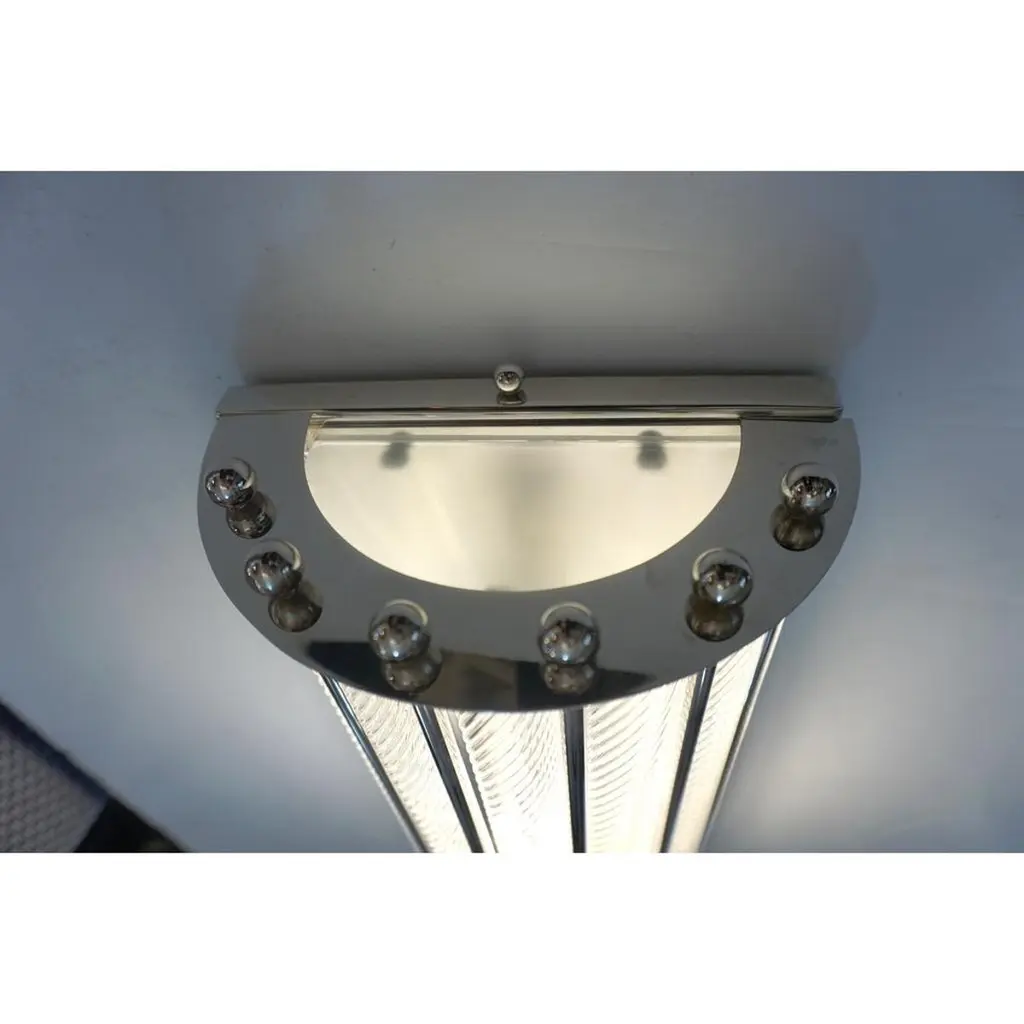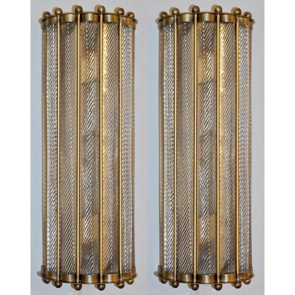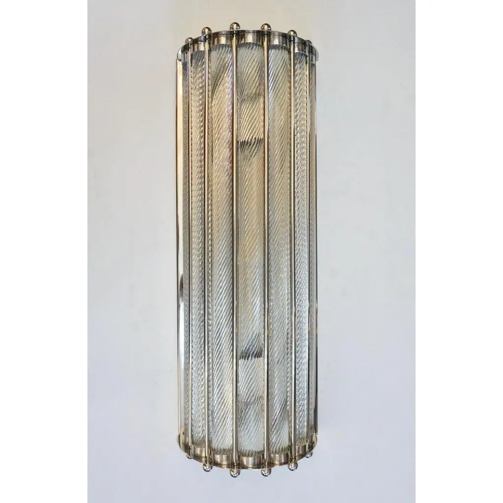 One pair is available now. Contemporary customizable Italian Art Deco Design pair of semi-circular wall lights, entirely handcrafted, with a polished nickel finish. The nicely scalloped airy structure supports crystal clear Murano glass rods worked with the sophisticated technique Torchon, handcrafted twisted glass, that not only makes the fixture more precious but multiplies the light reflections. This can also be ordered to hang horizontal or as a flushmount as well.High quality of construction and details with a decorative curved nickel band and elegant frosted Murano glass to enclose both top and bottom.The backplate is 7.5 inches wide.Options available for different finishes and sizes. This pair in Satin Nickel finish costs $5,380Weight: approx. 12 lbs Each.Also see lanterns and drum chandeliers in this same style.Fitted with 2 standard E26 Edison sockets