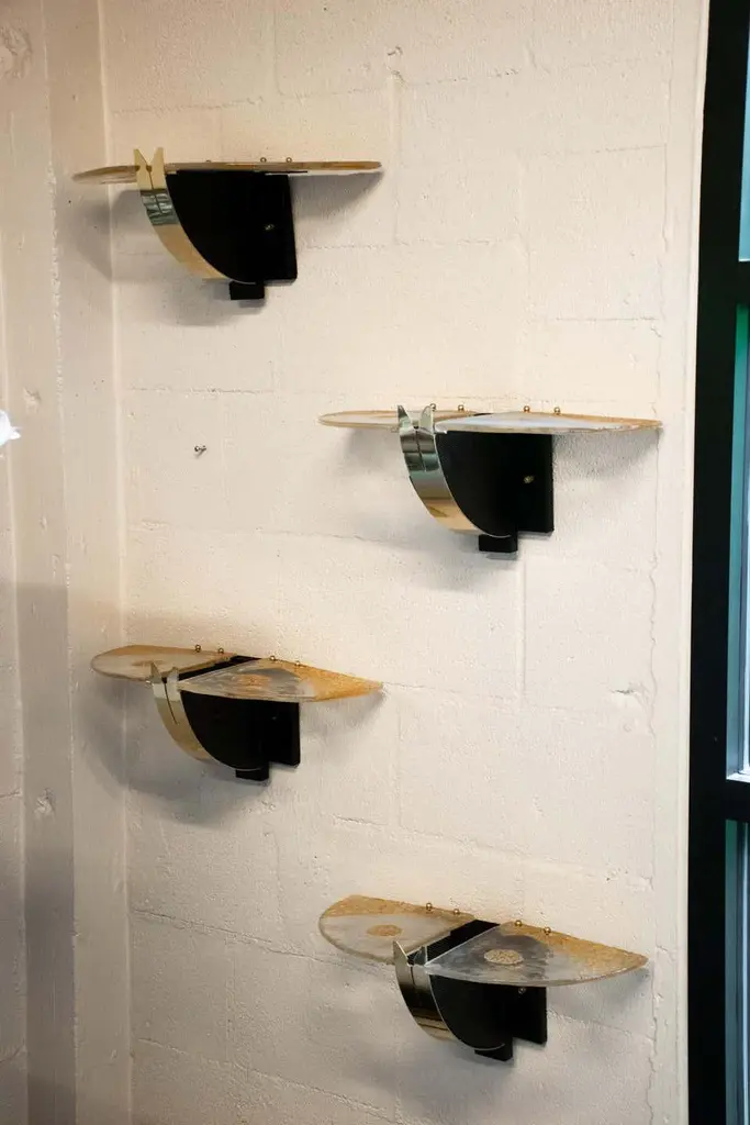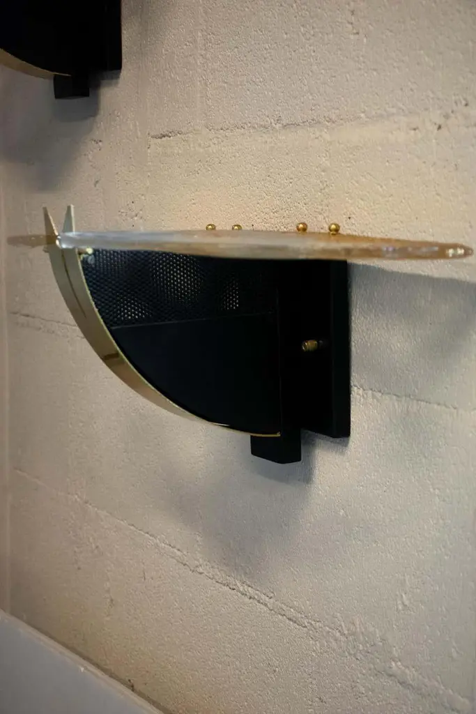Italian Mazzega wall sconces with black and brass bases and amber Murano glass panels. Glass shines up from center of fixture, which holds one candelabra based bulb. Attributed to Carlo Nason, designer. Wired for mounting to junction box. Sold in pairs. Two pairs available. Italy, 1970s or 1980s.