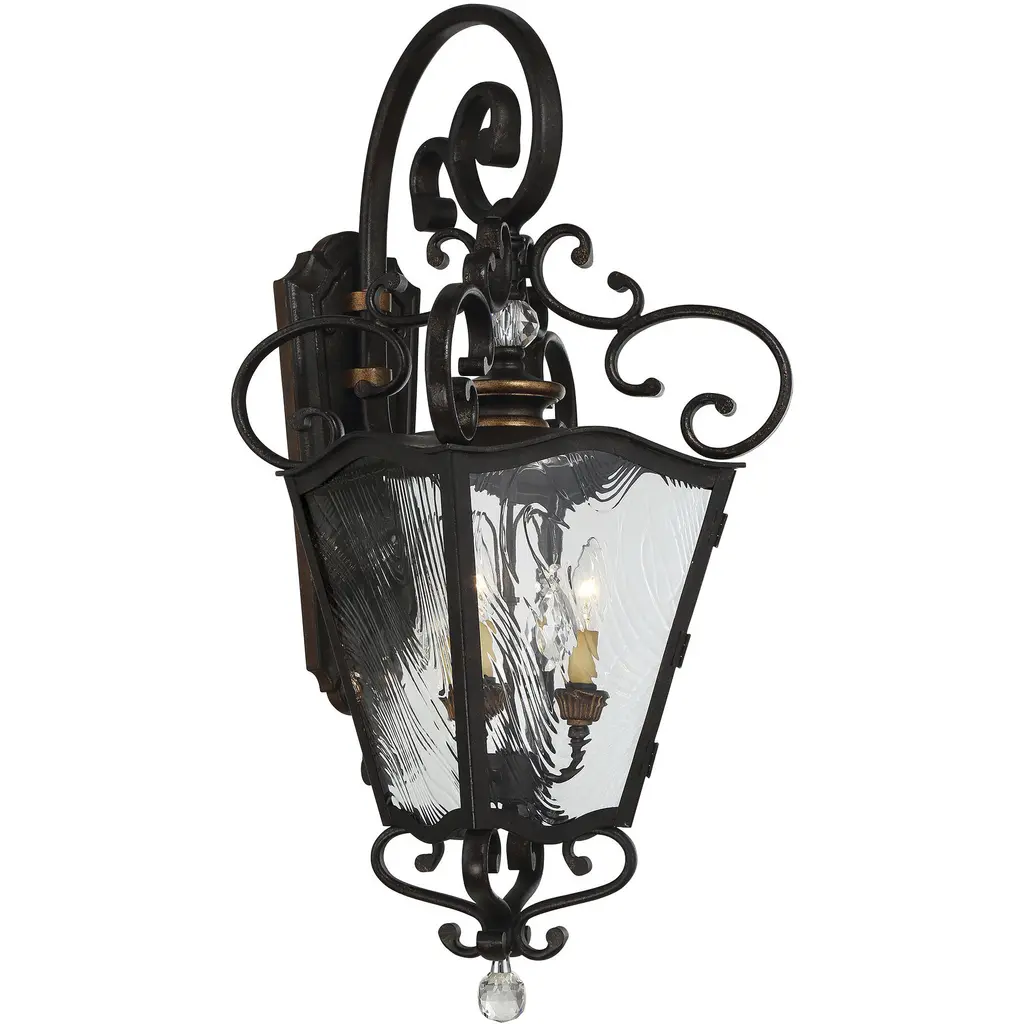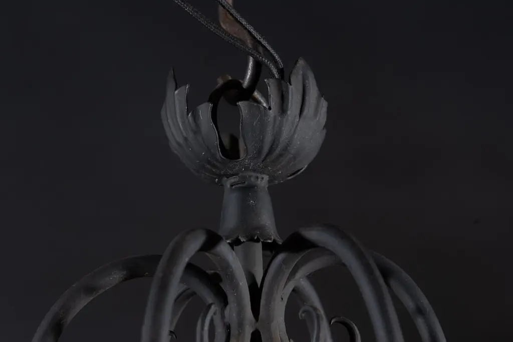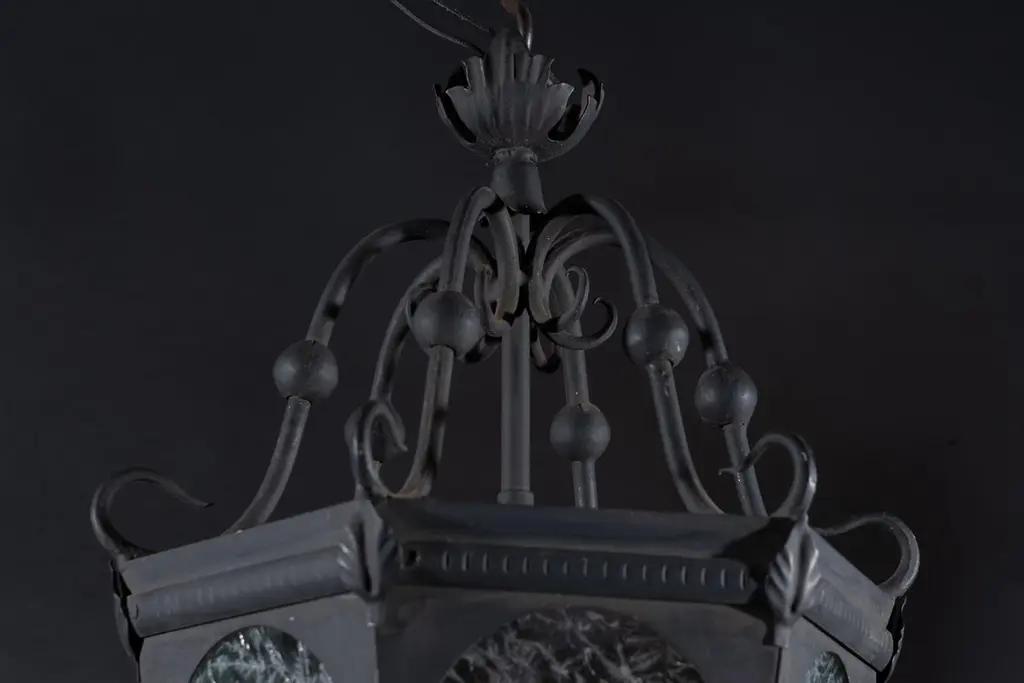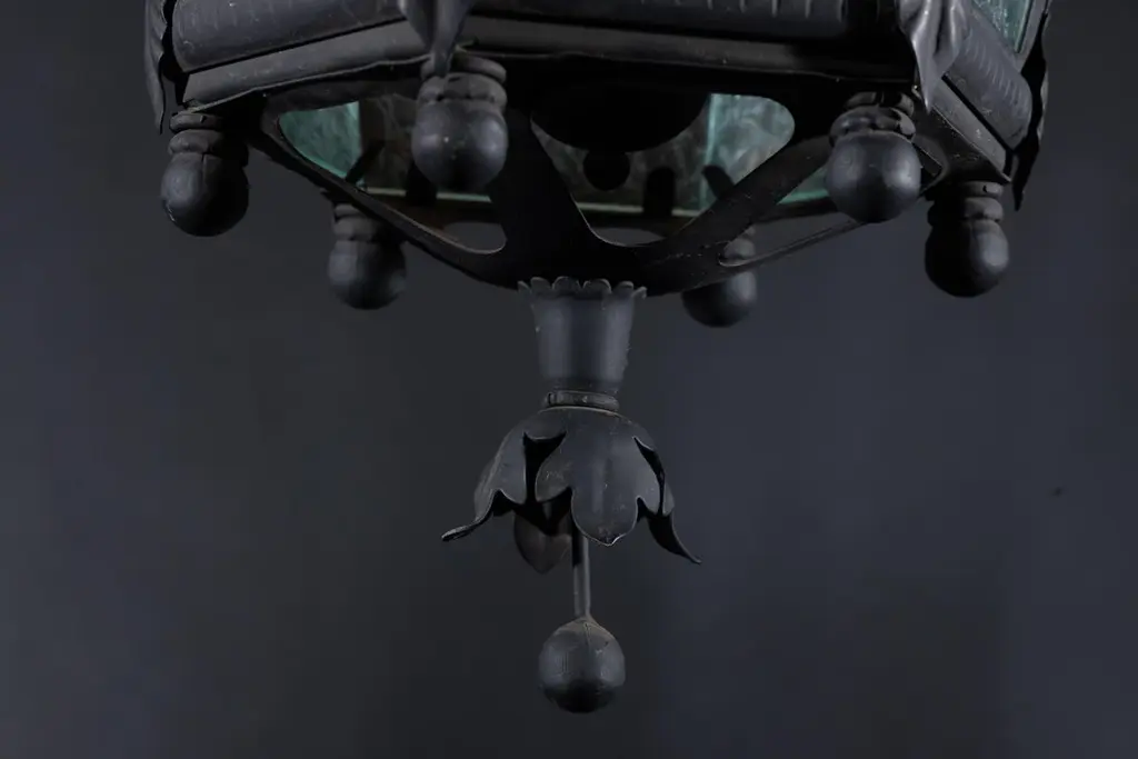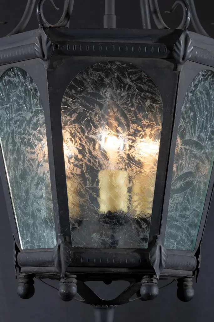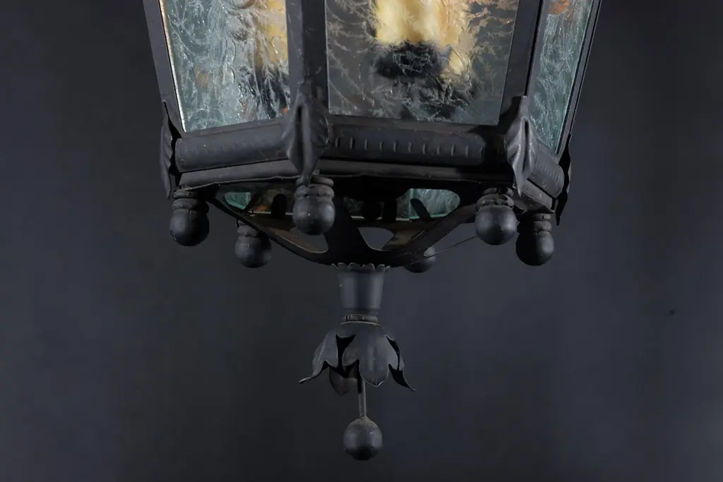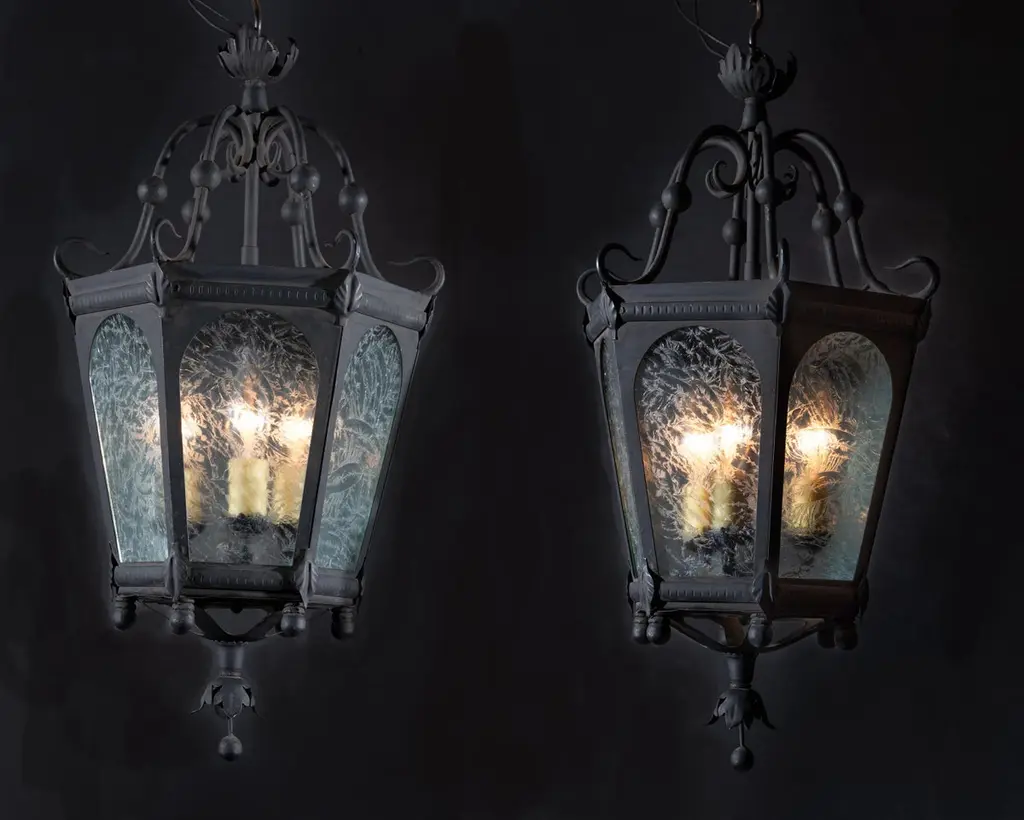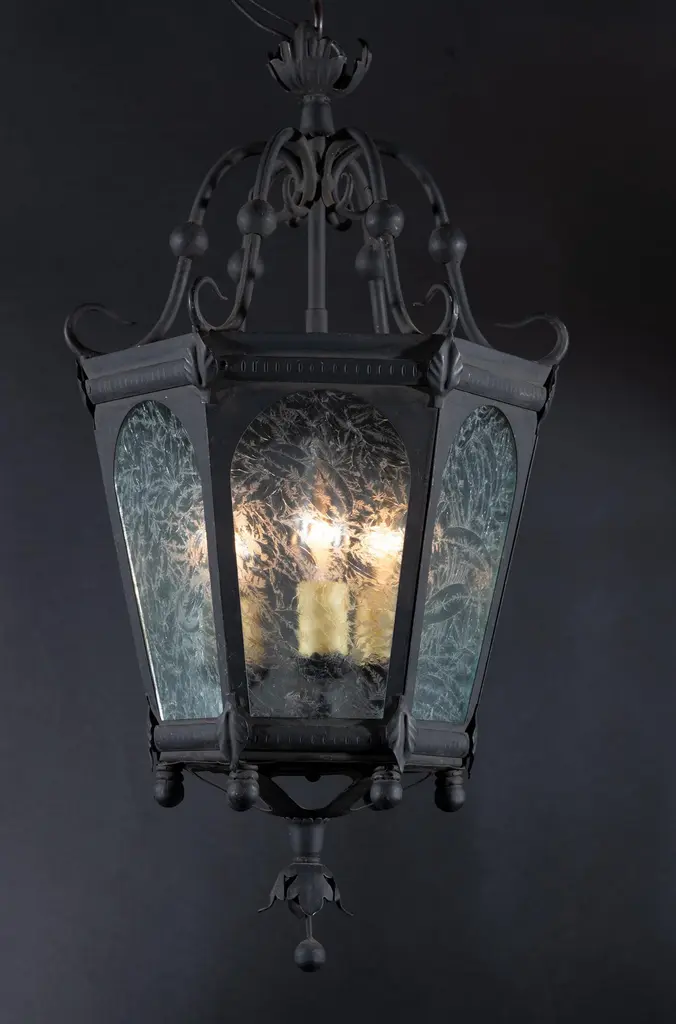 This fantastic gothic style lantern is made of painted iron and dates back to the mid 20th century. The lantern features six panels with beautifully etched glass and a simple floral crown. The center stem supports three lights, and is attached to the body by beautifully curled arms at top. Each light is held by simply detailed bobeches. The piece is decorated with simple leaves and ends with a floral finial.Each piece in our shop is professionally rewired and in working order. They have been rewired at our fourth generation antique store in The French Quarter of New Orleans. Each chandelier and lantern comes with a vintage canopy, three feet of chain, and ample wire, and each sconce comes with all materials needed to mount. Each piece is newly wired with UL approved wire and sockets and is fully operable.This piece is a collection of a fourth generation, family owned business in New Orleans called The French Antique Shop. The store was first opened by Marie and Marcel Granet in Paris when they married in 1927. A jewish family, they came to the United States before the outbreak of the Second World War, leaving on the last boat out of Paris' port, Le Havre. When they reached New Orleans, they fell in love with the Vieux Carre as it reminded them of home. Their first shop here in New Orleans was located on Chartres Street in the French Quarter and was stocked originally with pieces they had brought with them from Paris. They moved to Royal Street and settled in their present expanded location at 225 Royal Street in 1947. Today, the shop is run by the third and fourth generation, Marc, and his two sons Michael and Brian. By purchasing from our shop, you're supporting a family run business which focuses on artisan made, high quality craft with an emphasis on quality. Thank you for helping us continue a dream started four generations ago!