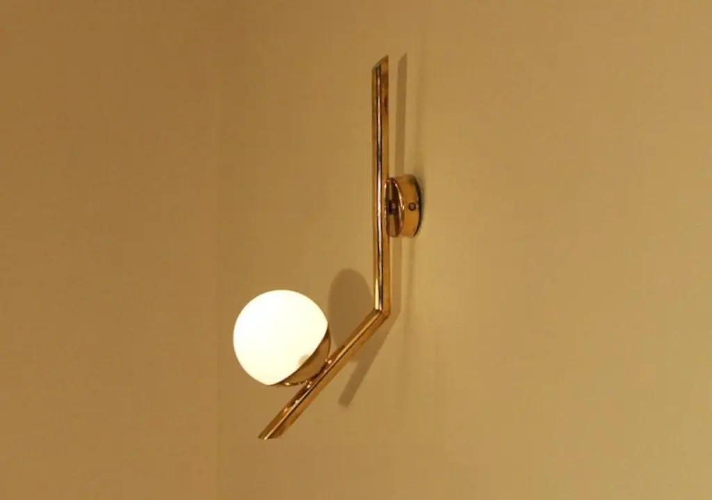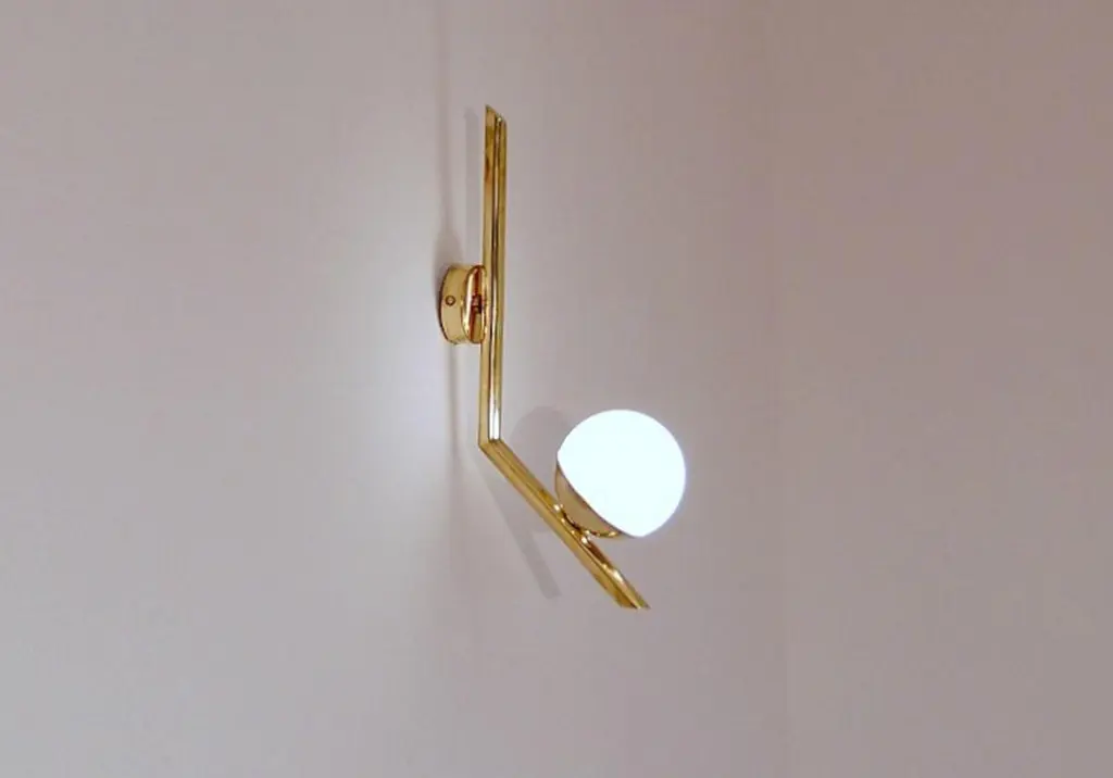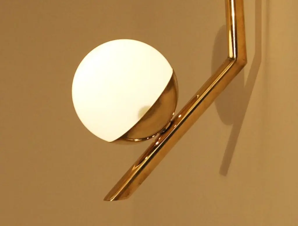 Elegant wall light shown in unlacquered natural brass with opaline milky glass globe fabricated in Italy by Fabio Ltd. This is a modern, contemporary interpretation of a classic wall light, strongly influenced by Italian Mid-Century Modernism such as maker Stilnovo.Total dimensions as shown are 5" width, 8" depth and 20" height, but can be customized to suit your space.This piece may use any 1 E14 candelabra base bulb up to 40 watts (or use LED). Bulbs are not included.Order reference #: FABIOLTD W788