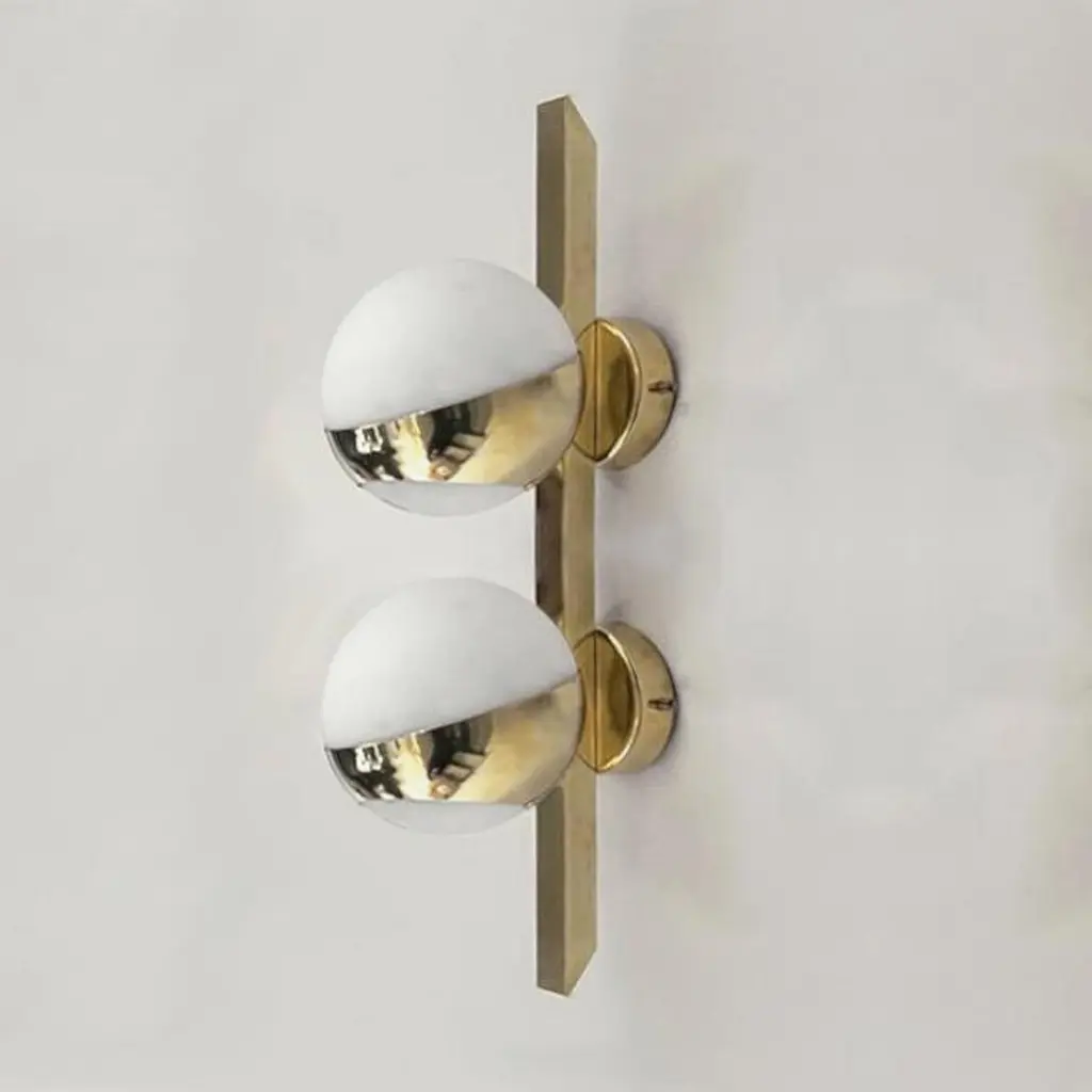 Elegant wall light shown in un-lacquered natural brass with opaline milky glass globes fabricated in Italy by Fabio Ltd. This is a modern, contemporary interpretation of a classic wall light, strongly influenced by Italian Mid-Century Modernism such as maker Stilnovo.Total dimensions as shown are 4.7" width, 6.4" depth and 12" overall height, but can be customized to suit your space.This piece may use any 2 E14 candelabra base bulbs up to 40 watts each (or use LED). Bulbs are not included.Order reference #: FABIOLTD W779