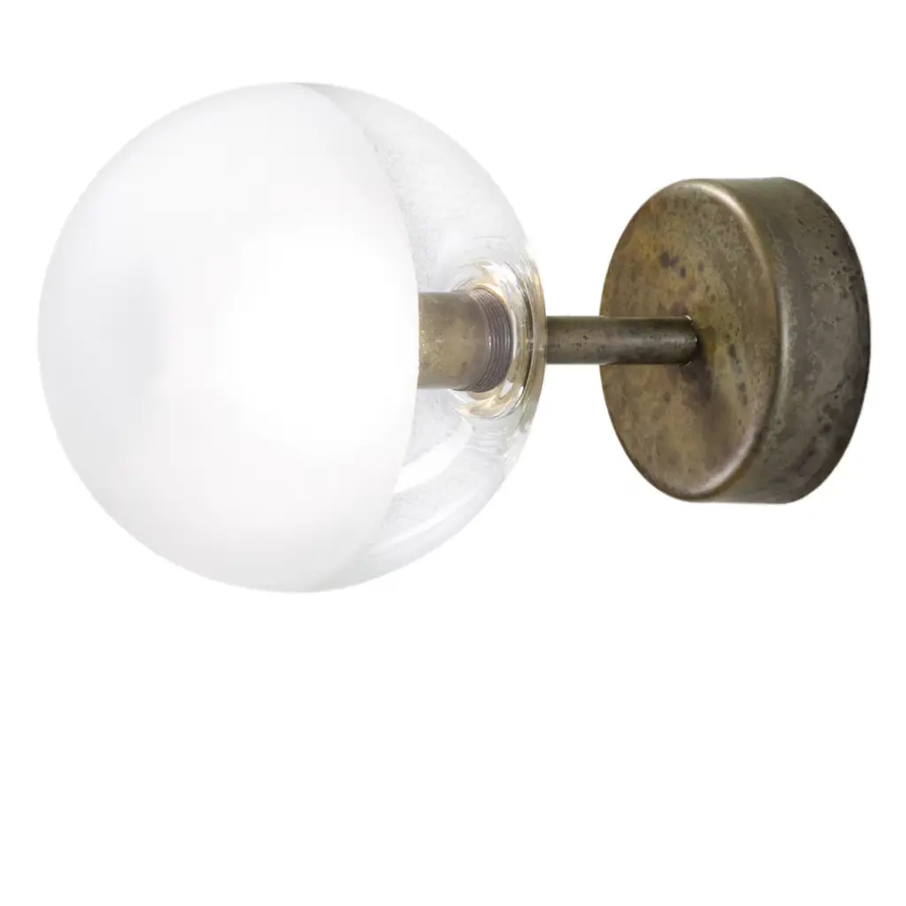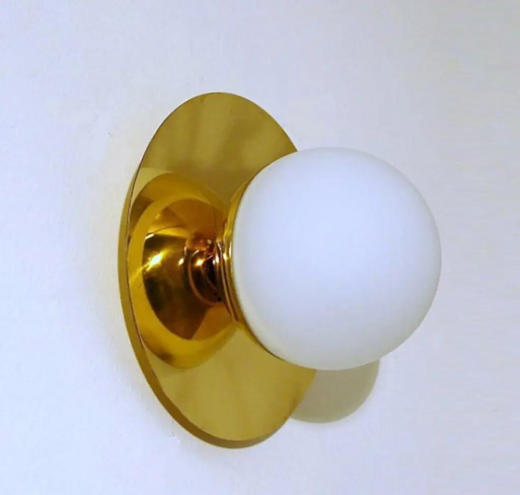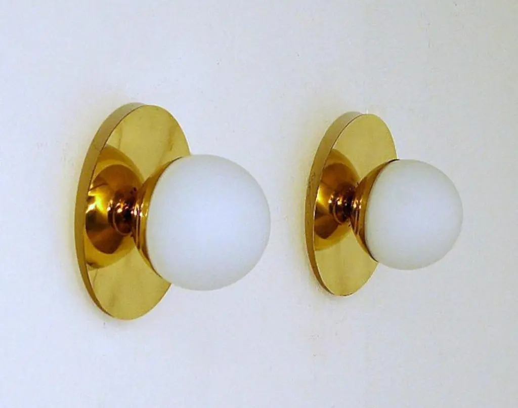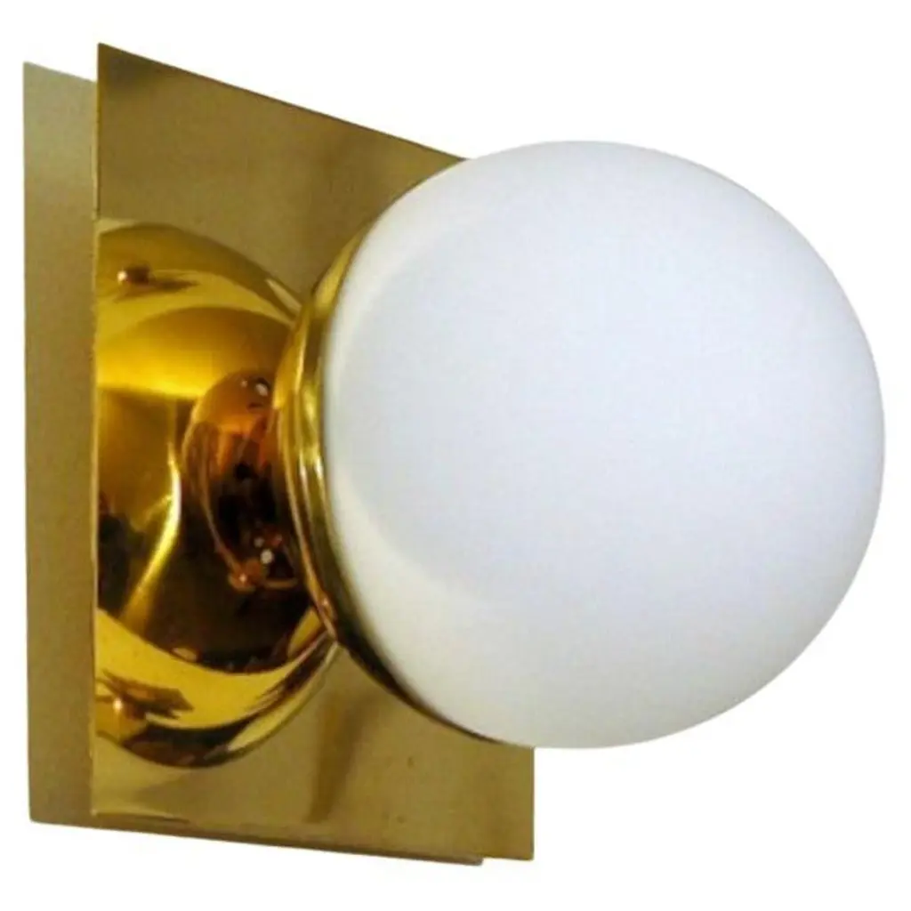 Elegant wall light or flush mount shown in polished brass with opaline milky glass globe fabricated in Italy by Fabio Ltd. This is a modern, contemporary interpretation of a classic wall light, strongly influenced by Italian Mid-Century Modernism such as maker Stilnovo.Total dimensions as shown are 8" diameter and 6" depth, but can be customized to suit your space.This piece may use any 1 E14 candelabra base bulb up to 40 watts (or use LED). Bulbs are not included.Order reference #: FABIOLTD W785