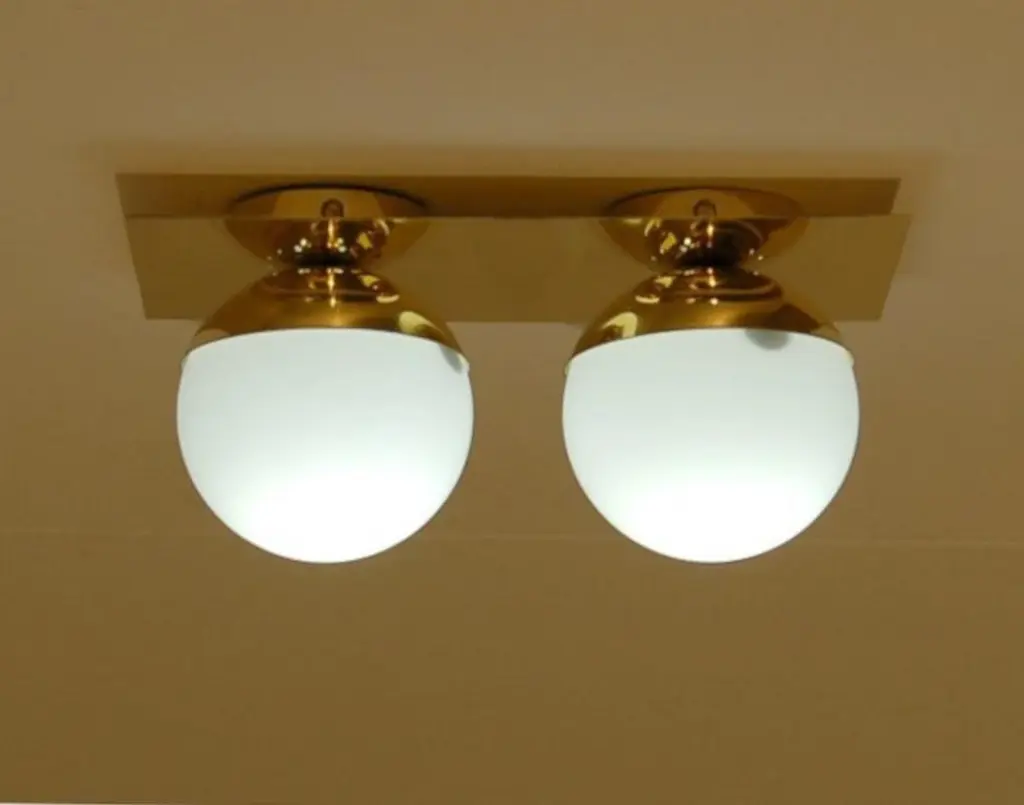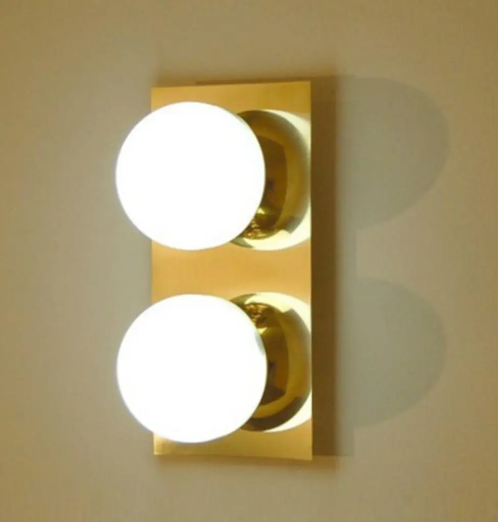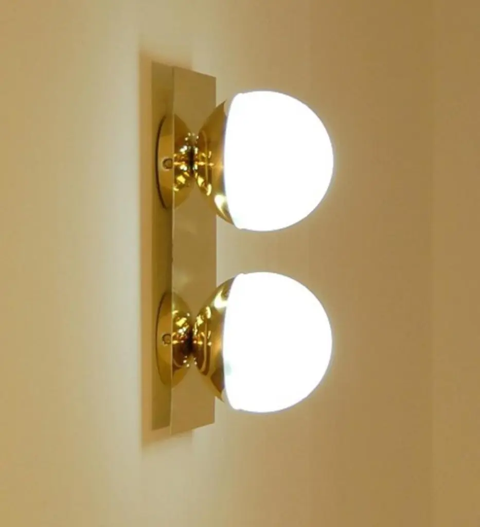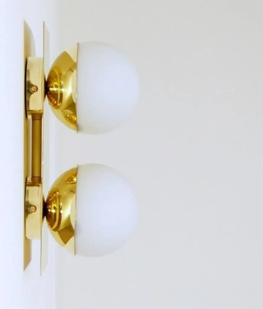 Elegant wall light or flush mount shown in polished brass with opaline milky glass globes fabricated in Italy by Fabio Ltd. This is a modern, contemporary interpretation of a classic wall light, strongly influenced by Italian Mid-Century Modernism such as maker Stilnovo.Total dimensions as shown are 6" width and 12" height, but can be customized to suit your space.This piece may use any 2 E14 candelabra base bulbs up to 40 watts each (or use LED). Bulbs are not included.Order reference #: FABIOLTD W784