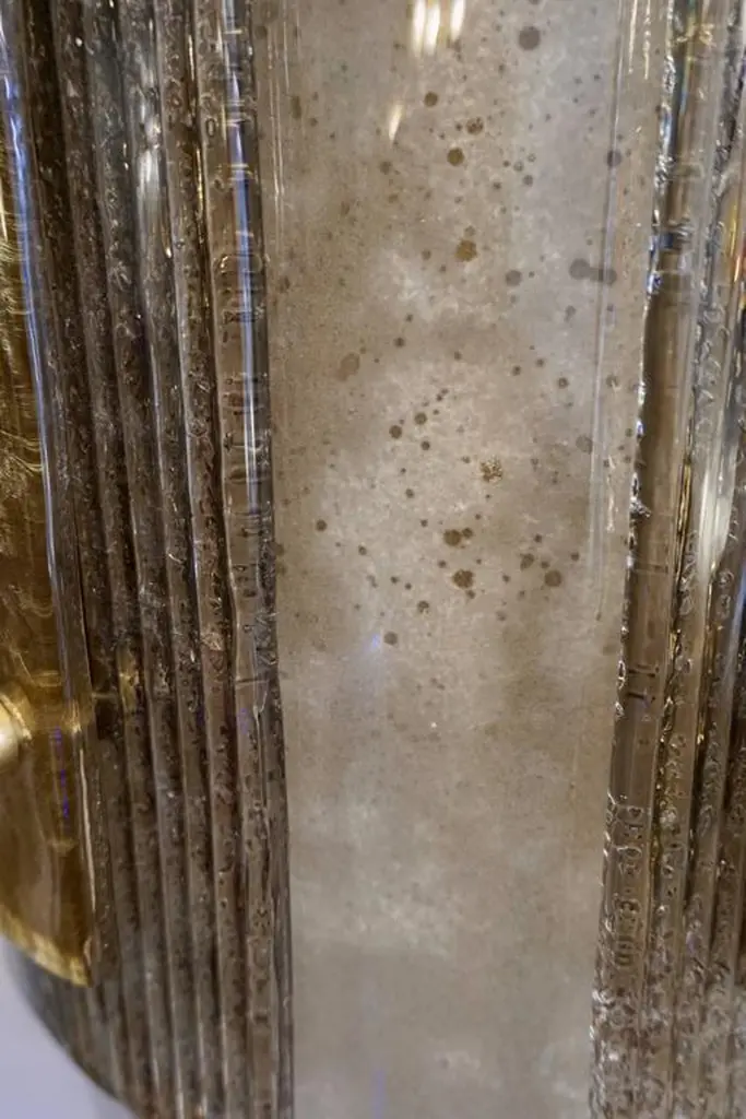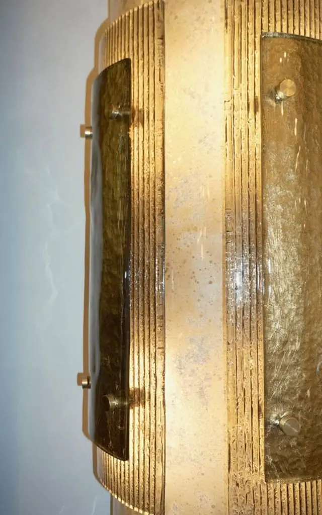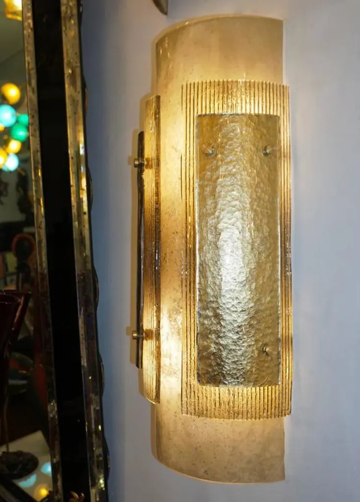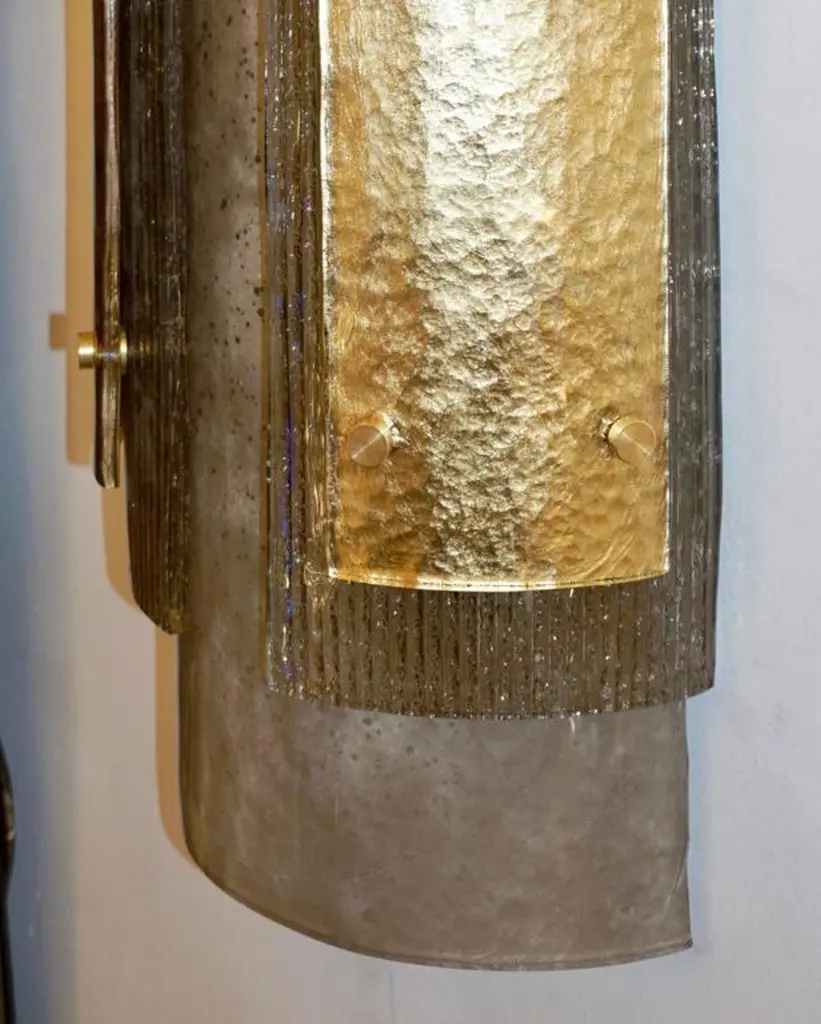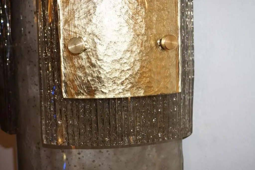 Contemporary Italian wall lights in high quality curved blown murano glass, entirely handcrafted, three different textures and colors, the frosted smoked grey body is decorated with two stepped glass layers: one with a sophisticated pattern on the reverse to give a delicate striped texture, the second worked with pure gold leaf with a craquelure pattern to let light shine through. On a handmade lacquered metal structure.Fitted with 4 standard Edison sockets. Weight 29lbs each.