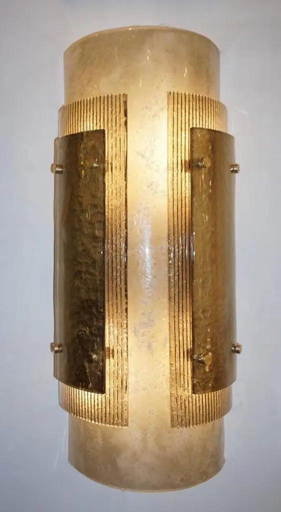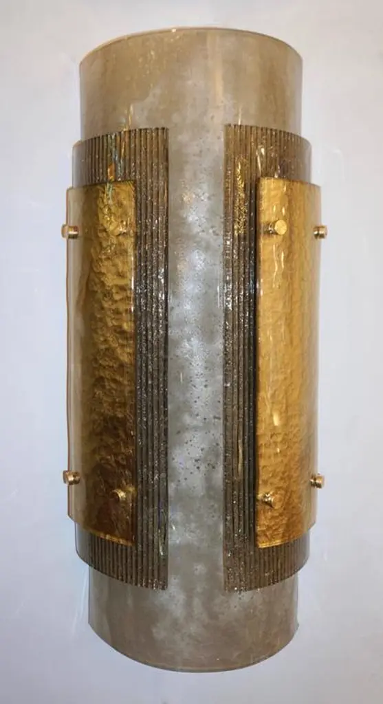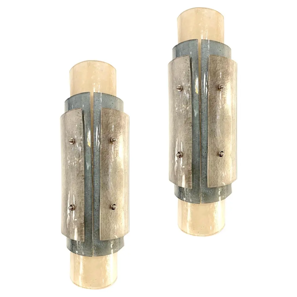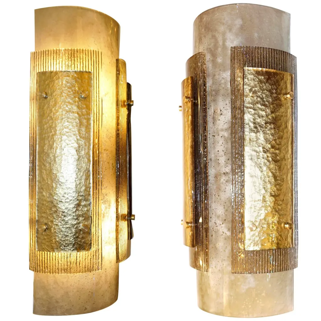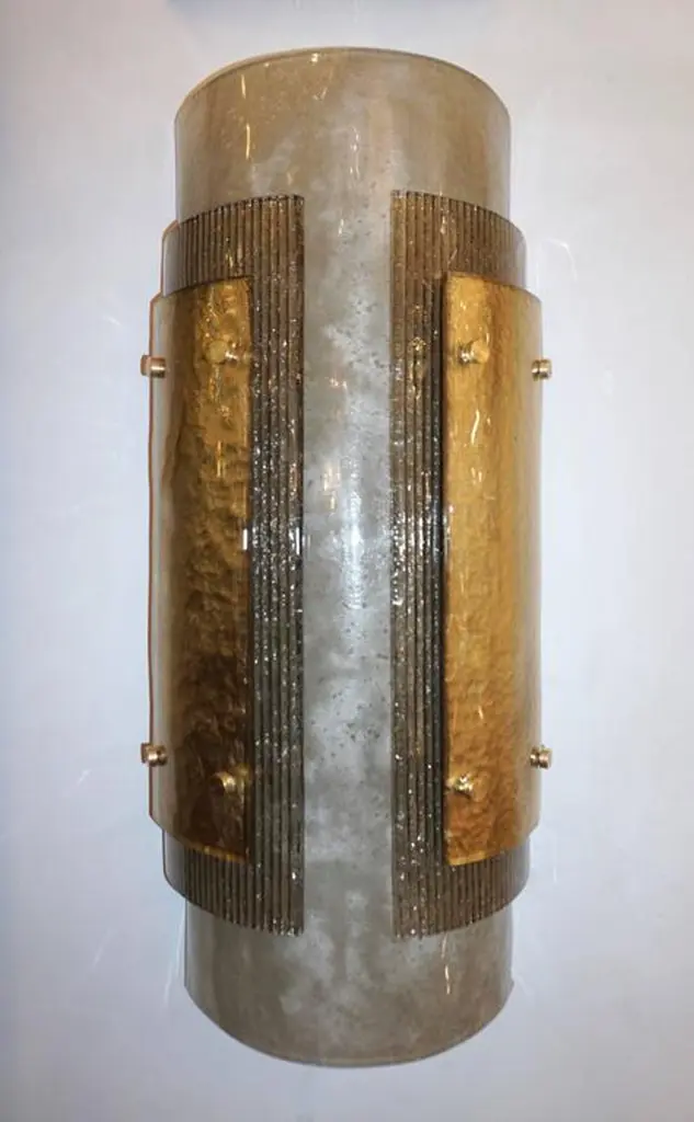 Italian Pair Of Modern Gold Smoked Gray And Frosted Ivory Murano Glass Sconces