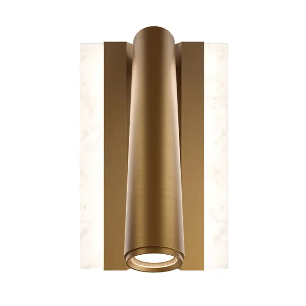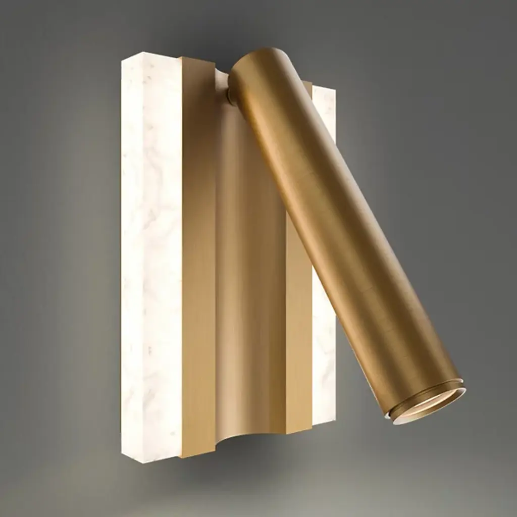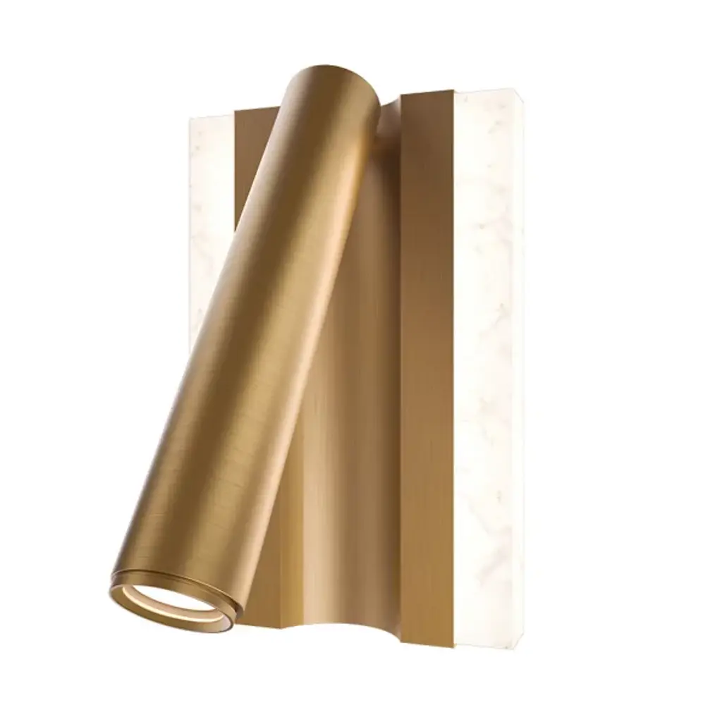 The Ivery LED Wall Sconce from Modern Forms features geometric aluminum framing that cradles a panel of beautifully variegated faux alabaster, creating dual lighting effects from a single fixture. The brass channel detail runs through the center while the swivel head extends outward for focused task illumination. This design incorporates ambient lighting through the translucent alabaster panel and directional lighting from the adjustable head. The fixture includes touch switch controls with hold-to-dim functionality plus USB and USB-C ports for comprehensive bedside or workspace convenience.
