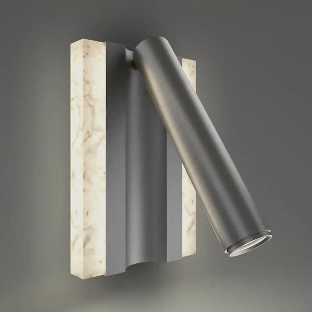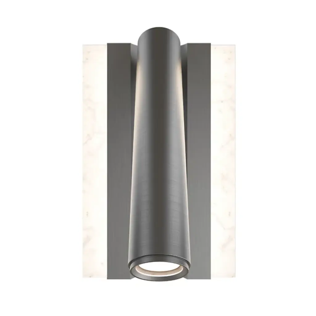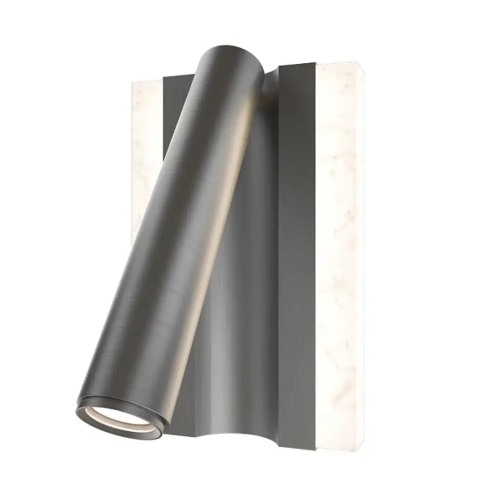 The Ivery LED Wall Sconce from Modern Forms features geometric aluminum framing that cradles a panel of beautifully variegated faux alabaster, creating dual lighting effects from a single fixture. The brass channel detail runs through the center while the swivel head extends outward for focused task illumination. This design incorporates ambient lighting through the translucent alabaster panel and directional lighting from the adjustable head. The fixture includes touch switch controls with hold-to-dim functionality plus USB and USB-C ports for comprehensive bedside or workspace convenience.