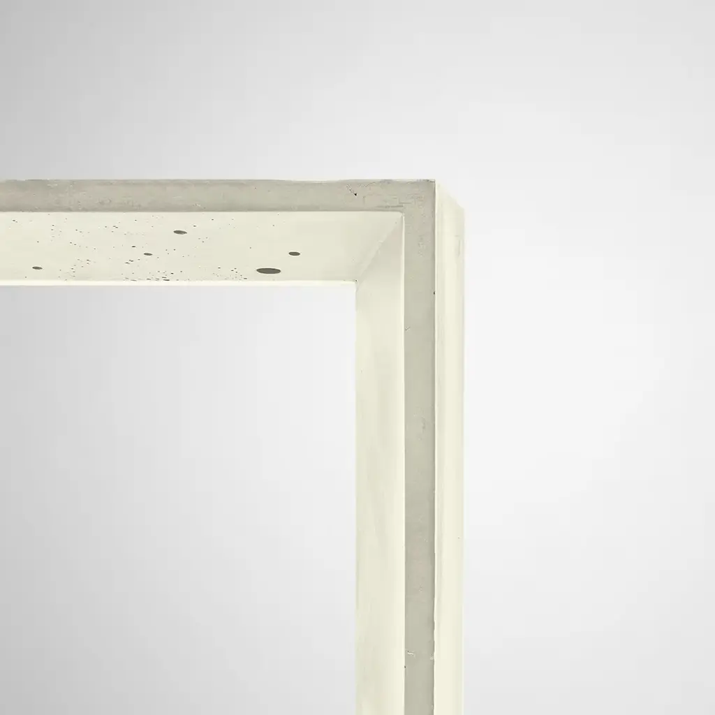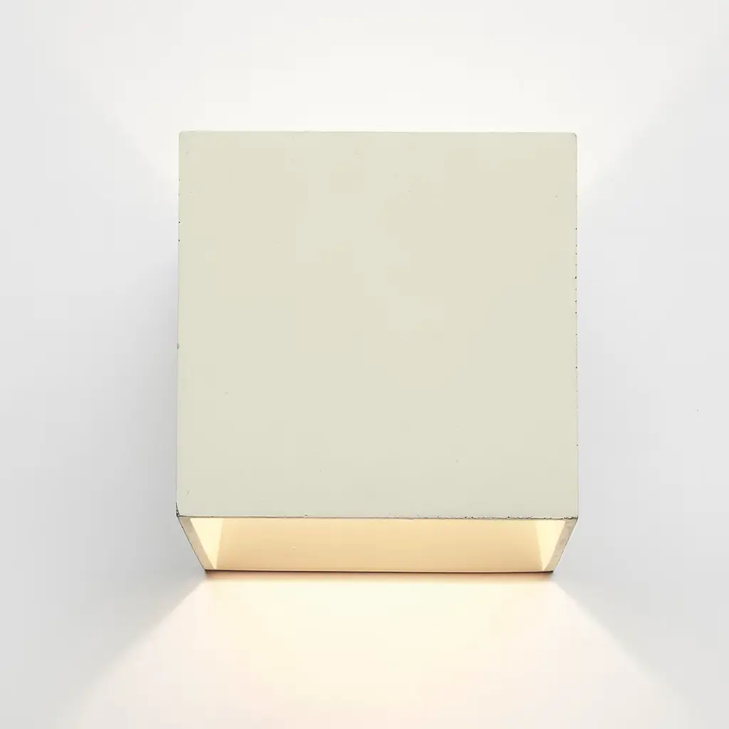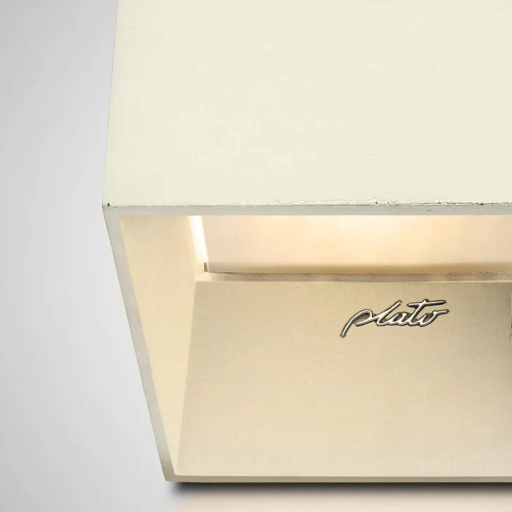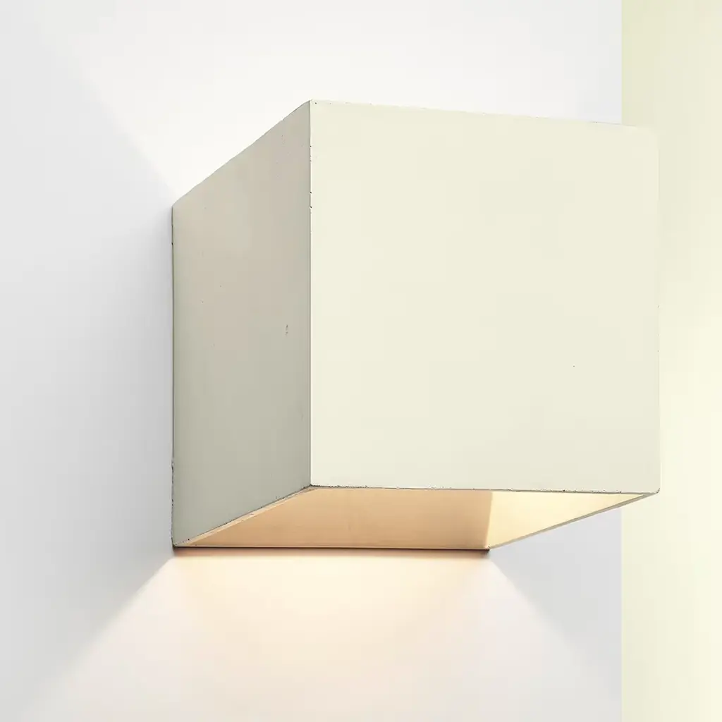 Part of a collection of 12 lighting fixtures of different colors, this elegant and minimalist sconce is crafted by hand at Plato's workshop in Rome. The cubic silhouette is made of ultra-thin concrete in a delicate ivory color that will suit a contemporary and monochromatic decor. The geometric shape will easily blend with any interior, while the acrylic glass bottom creates inviting ambient light suitable for any room. The lamp weight 1.1 kg and is hardwired. The suggested light bulb (not included) is a G9 max 10W LED. This piece is suitable for interiors only.