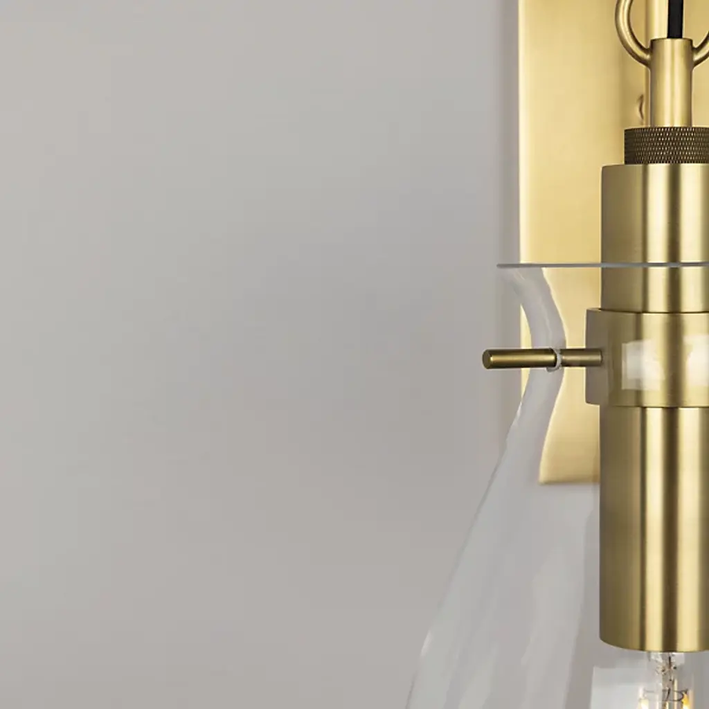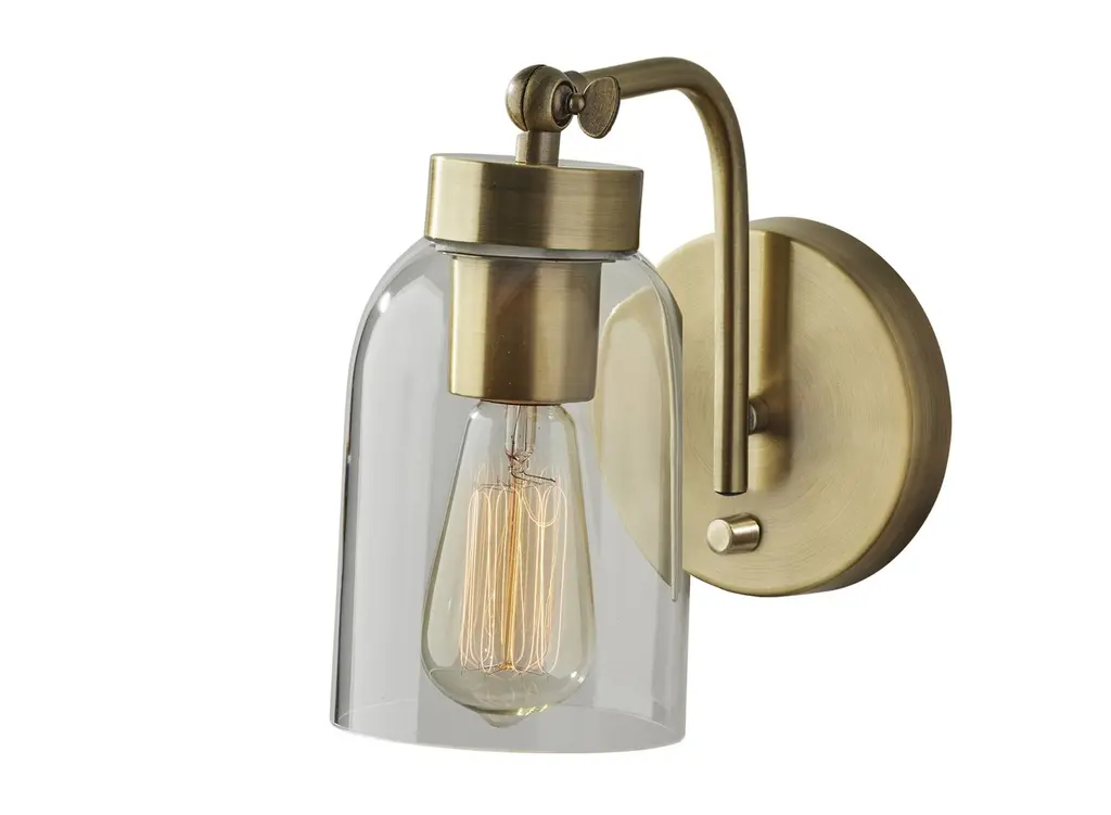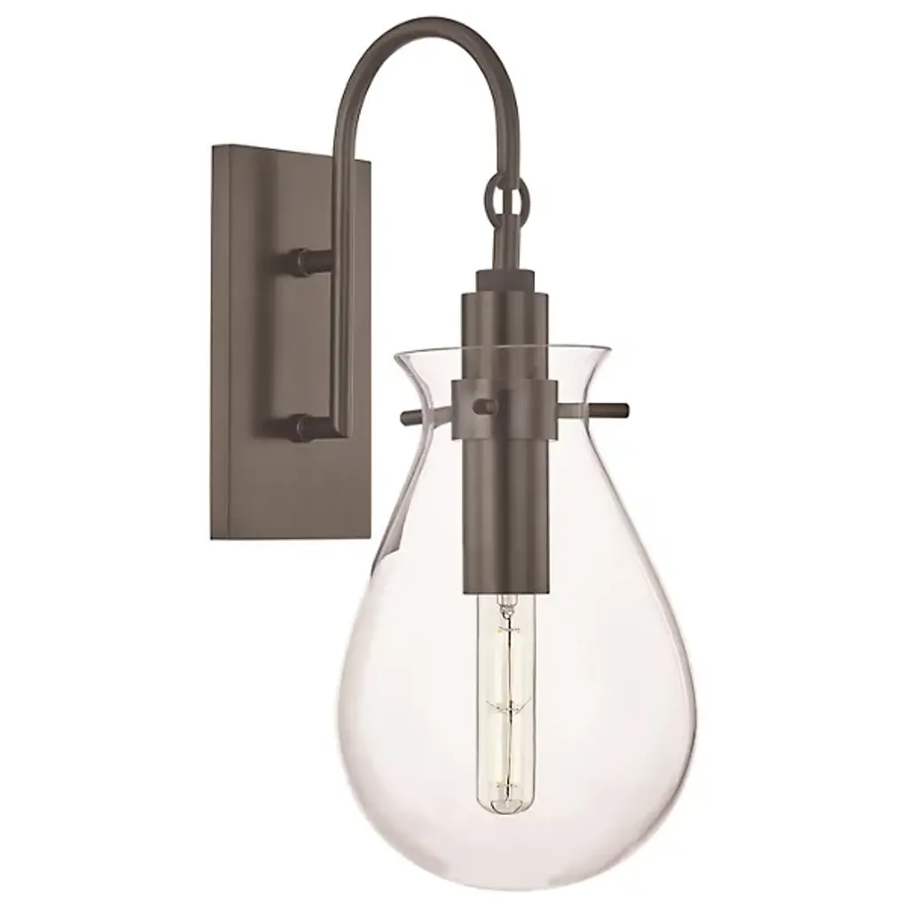 Industrial simplicity with contemporary California beach house appeal. Designed by Becki Owens for Hudson Valley Lighting, the Ivy LED Wall Sconce combines classic architectural shapes and factory chic details for a fresh modern feel in a kitchen, bathroom, bedroom or hallway. Crafted from Metal, this wall mount showcases a shapely Glass shade suspended by a cylinder socket. From the curved arm, a ring screw with knurled fittings exposes the black cord lending a coastal industrial vibe. Fitted out with a replaceable LED bulb, the down-facing sconce is perfect in pairs, illuminating open shelving in a modern kitchen or alongside a nautical style bathroom vanity mirror.