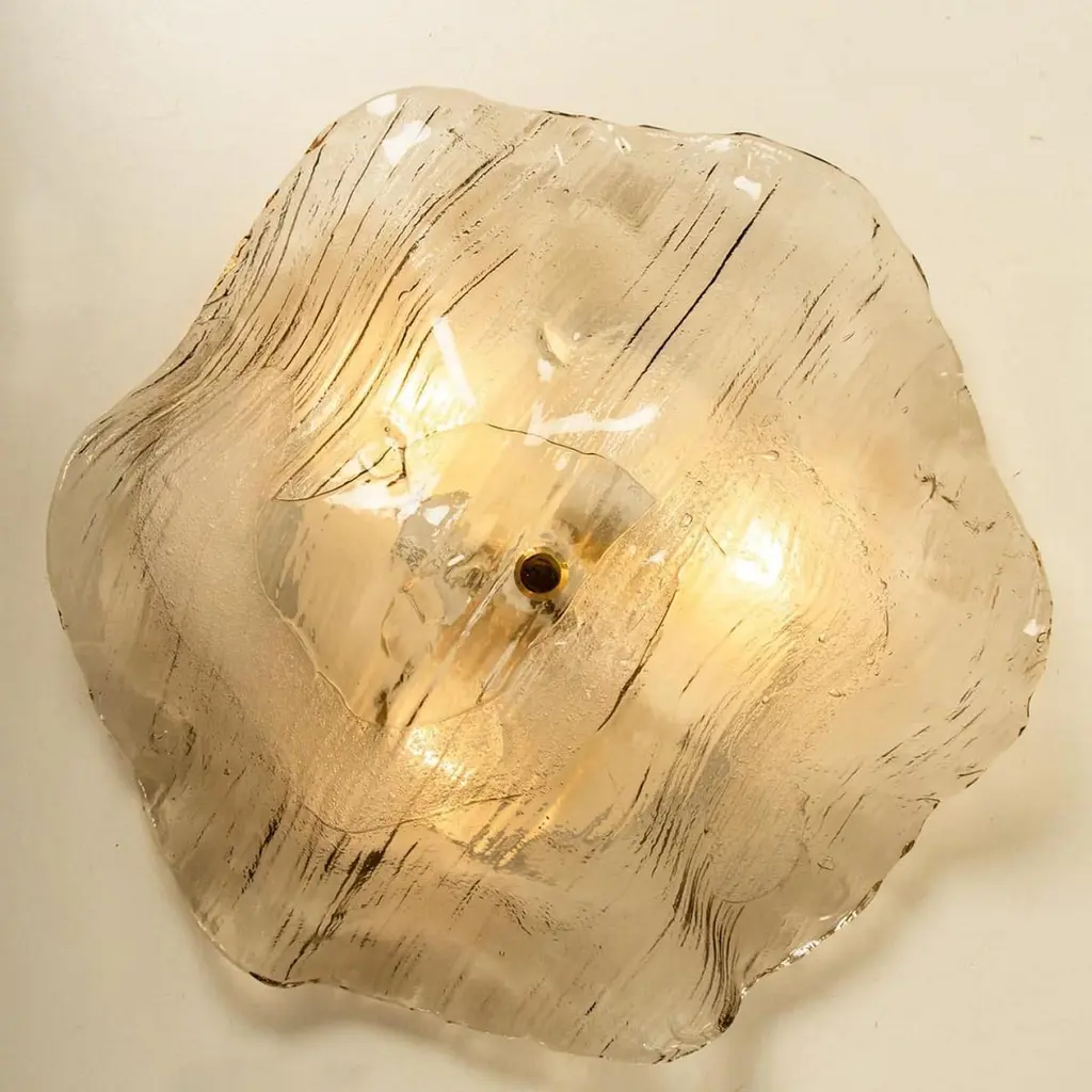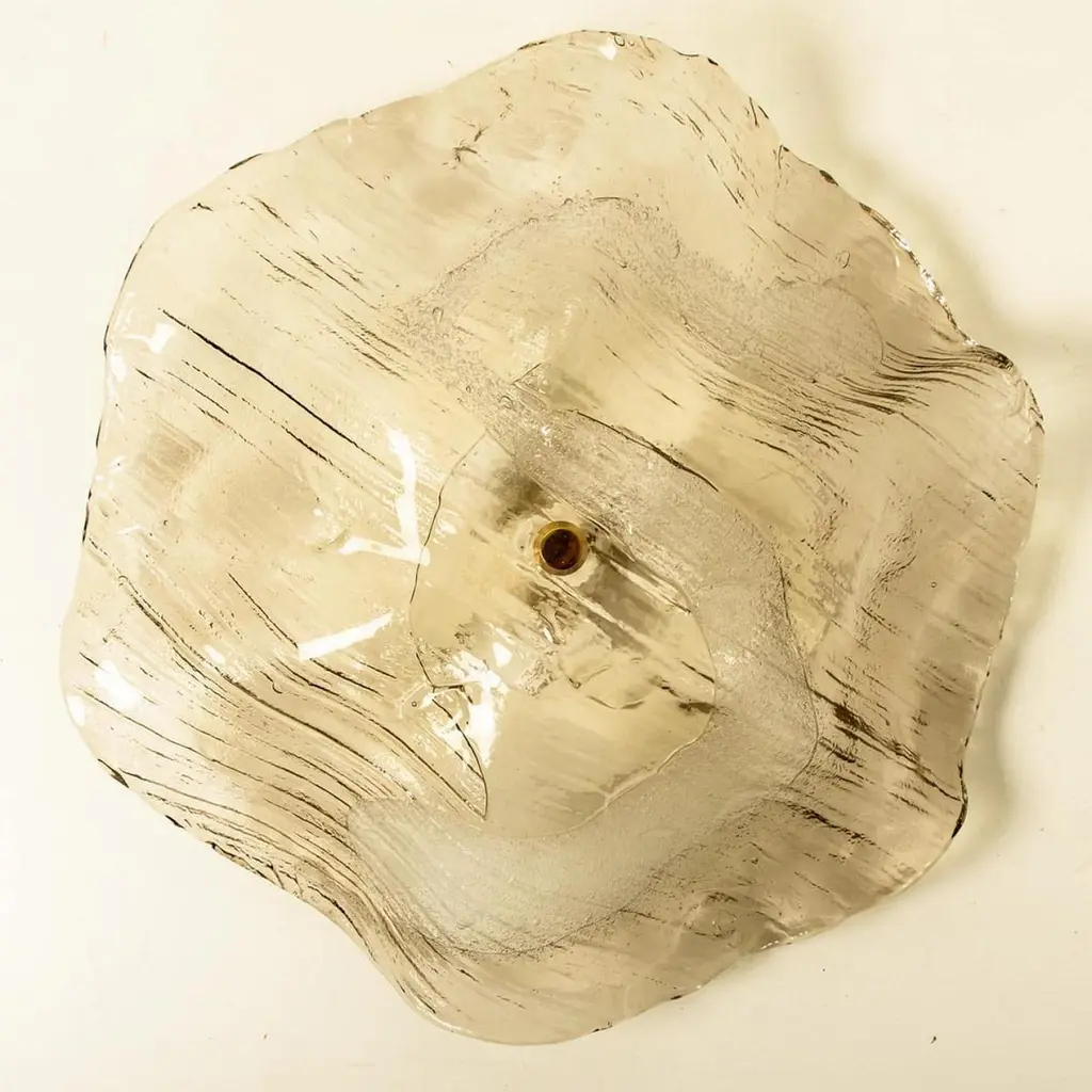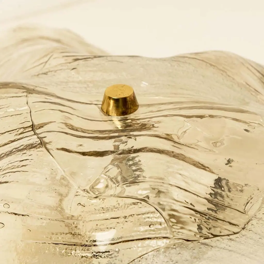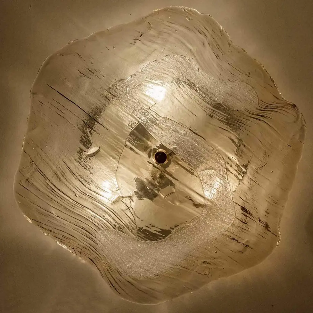 flush mounts /wall light, gorgeous and stylish, manufactured by Kalmar Franken, Austria, 1960s. With a handcrafted thick ice glass plate attached to the center. With brass colored backplate. A truly extraordinarily design!This lights are handmade and high quality pieces. Illuminates beautifully. Can be used in dining room, hallway or bedroom.Can also work for impressive wall lights. The price is for one piece.Cleaned and re-wired, in full working order and ready to use. In good condition. The ceiling lights can be disassembled and the ice glass plates individually wrapped for easy transport. Each lights requires 3 x E27 lights bulbs. LED compatible.