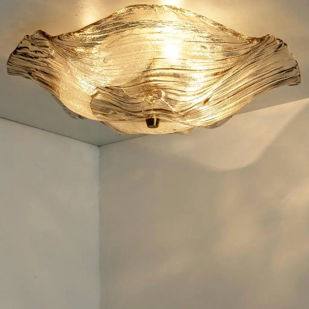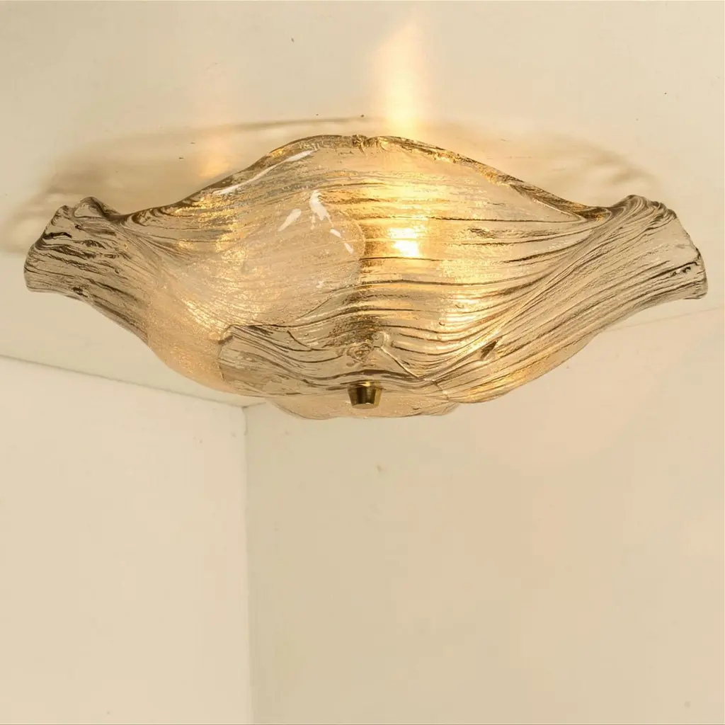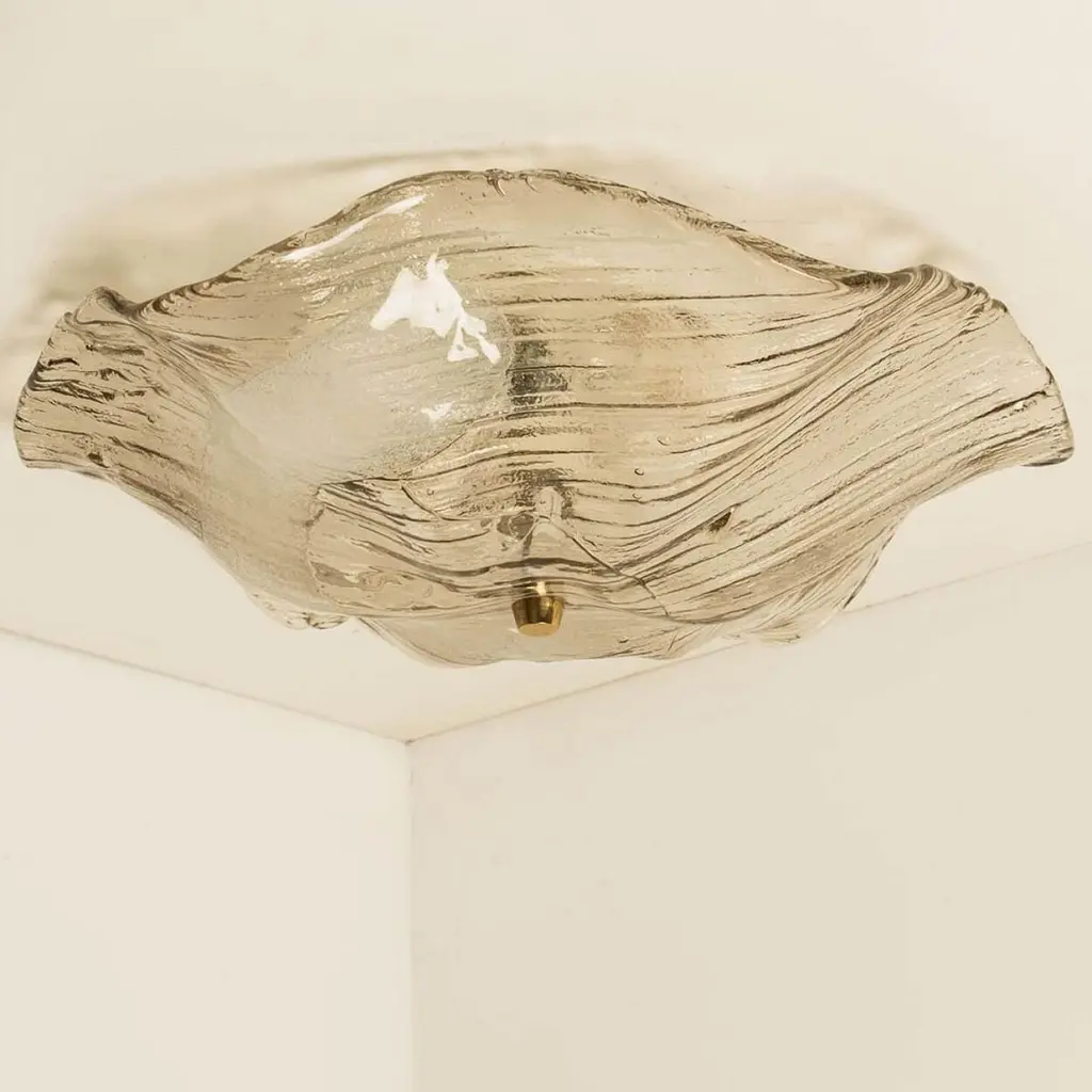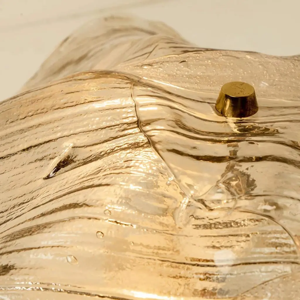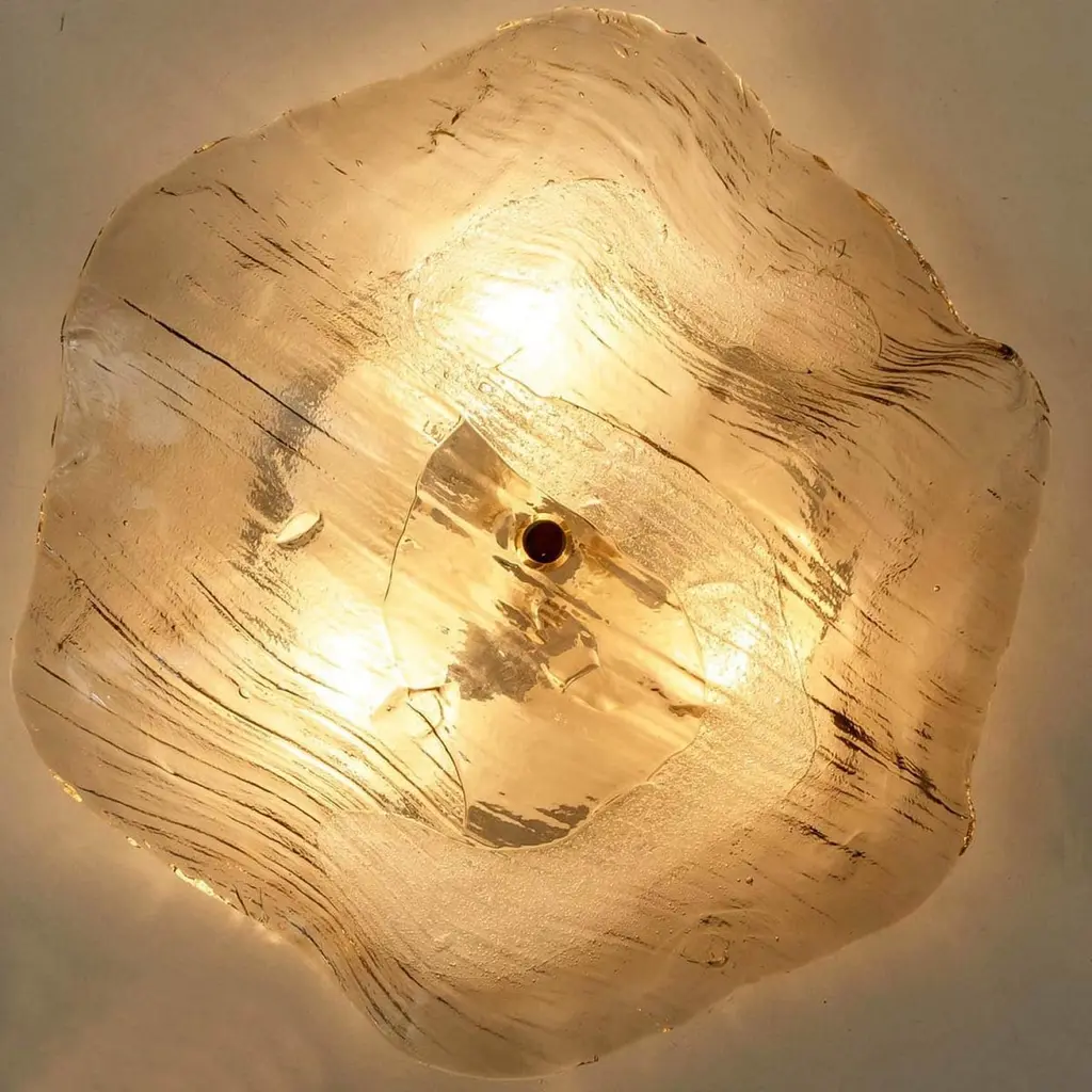 flush mounts /wall light, gorgeous and stylish, manufactured by Kalmar Franken, Austria, 1960s. With a handcrafted thick ice glass plate attached to the center. With brass colored backplate. A truly extraordinarily design!This lights are handmade and high quality pieces. Illuminates beautifully. Can be used in dining room, hallway or bedroom.Can also work for impressive wall lights. The price is for one piece.Cleaned and re-wired, in full working order and ready to use. In good condition. The ceiling lights can be disassembled and the ice glass plates individually wrapped for easy transport. Each lights requires 3 x E27 lights bulbs. LED compatible.