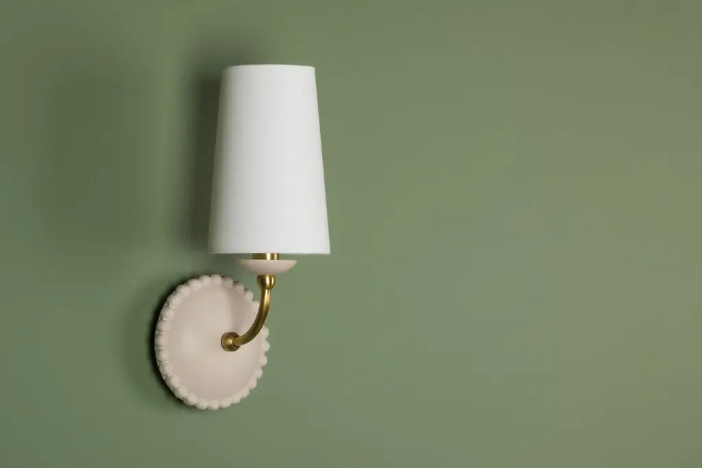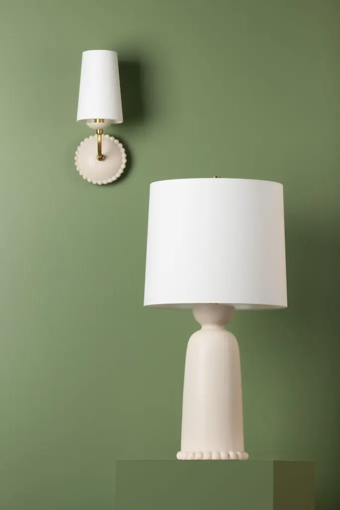 Spherical accents around the ceramic backplate give this sconce a retro charm that is reinforced by the white linen shade. Because the sconce is damp rated, you can use it in a bathroom as well as beside a bed, in a hall, or just about anywhere else in your home.