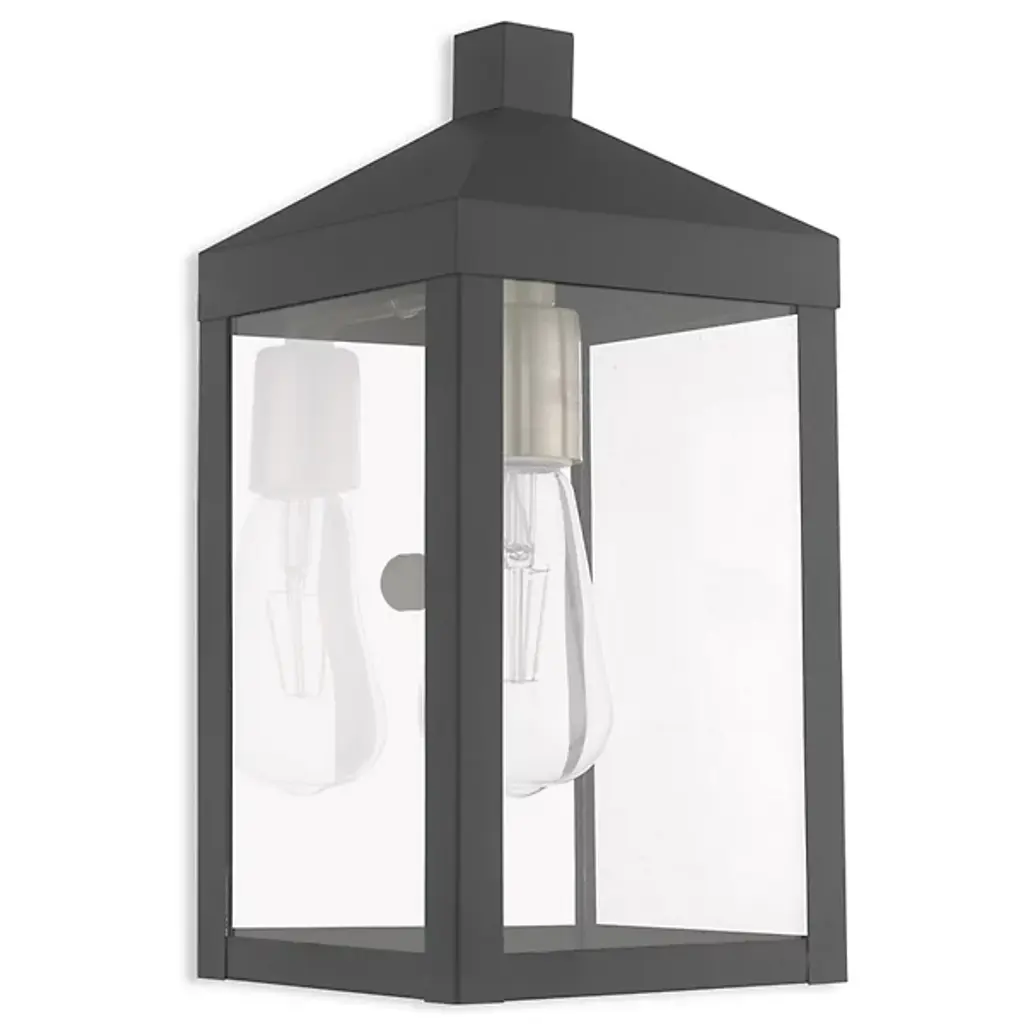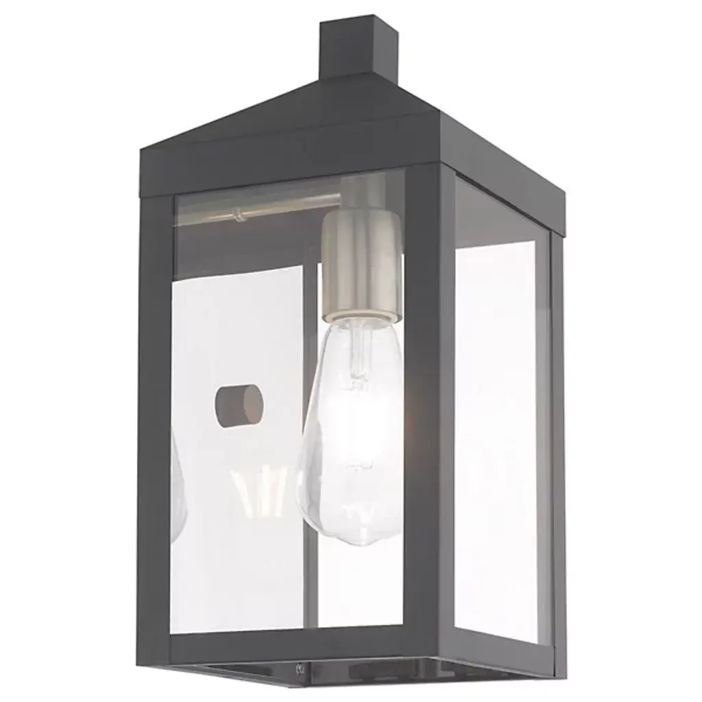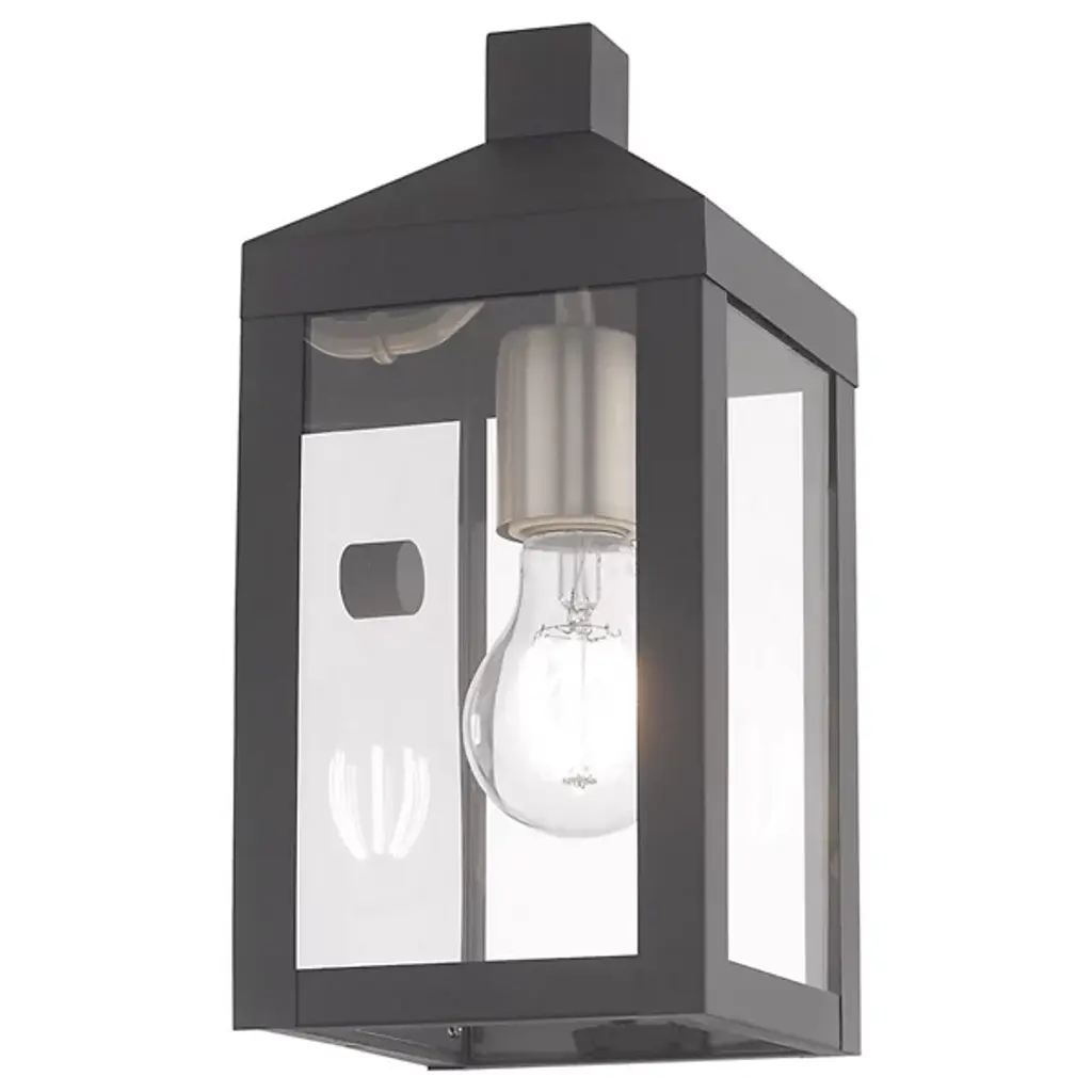 Make an exquisite addition to your exteriors with the clean lines and refined design of the James Clear Glass Outdoor Wall Sconce from Alder & Ore. This eye-catching piece appears to float in midair as it features a low-profile circular wall mount. Made from durable brass, the lantern-style sconce showcases a flaring, faceted roof with an elegant geometric finial. Surrounding clear glass panels lend to the floating sensation while protecting the lamping inside. A wet-rated, downward-facing lamp shines through the clear glass, spilling a rich pool of direct downlight and ambient light.